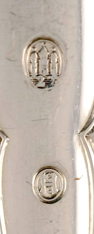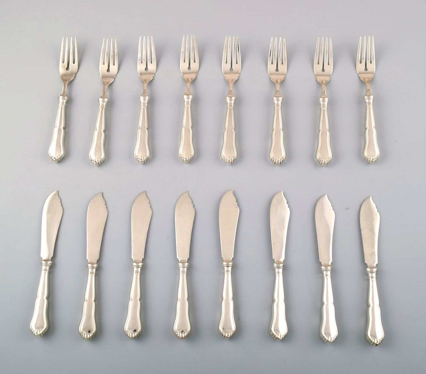 Complete Danish silver (.830) fish service for 8 p. Stamped: CFH: Christian Fr. Heise. 1910/20s. In very good condition. Knife measures 19 cm.