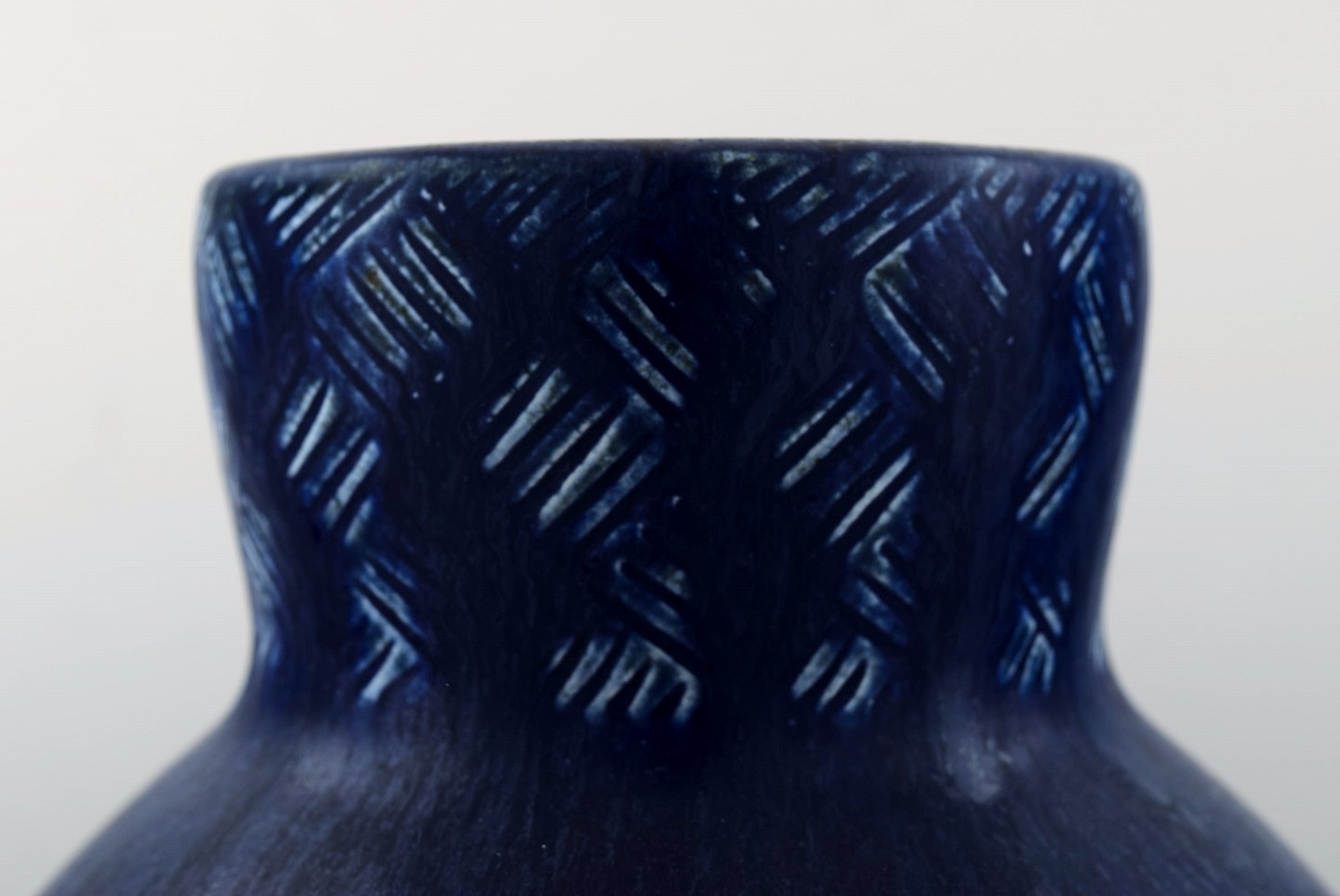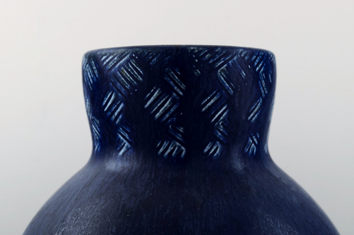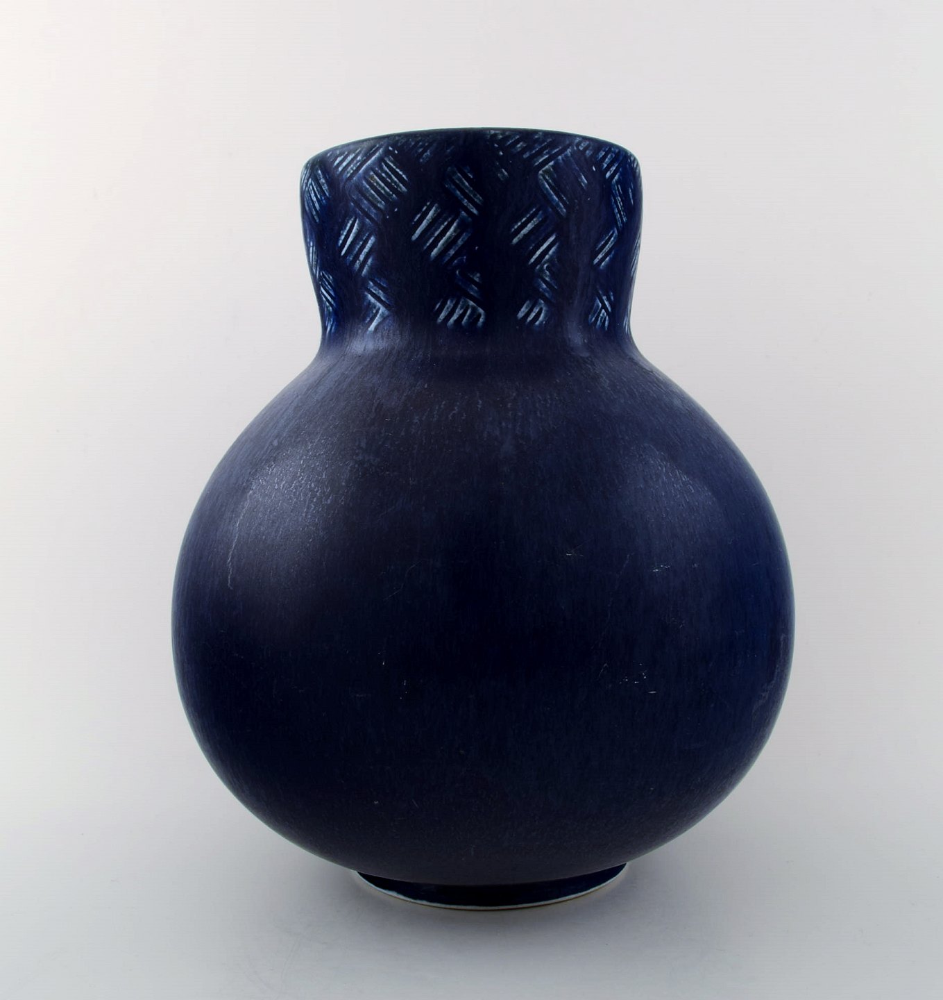 Eva Stæhr Nielsen for Saxbo, stor keramik vase i moderne design. Smuk glasur i mørkeblå toner. Stemplet. Måler: 24 cm. x 21 cm. I perfekt stand. 1. sortering.