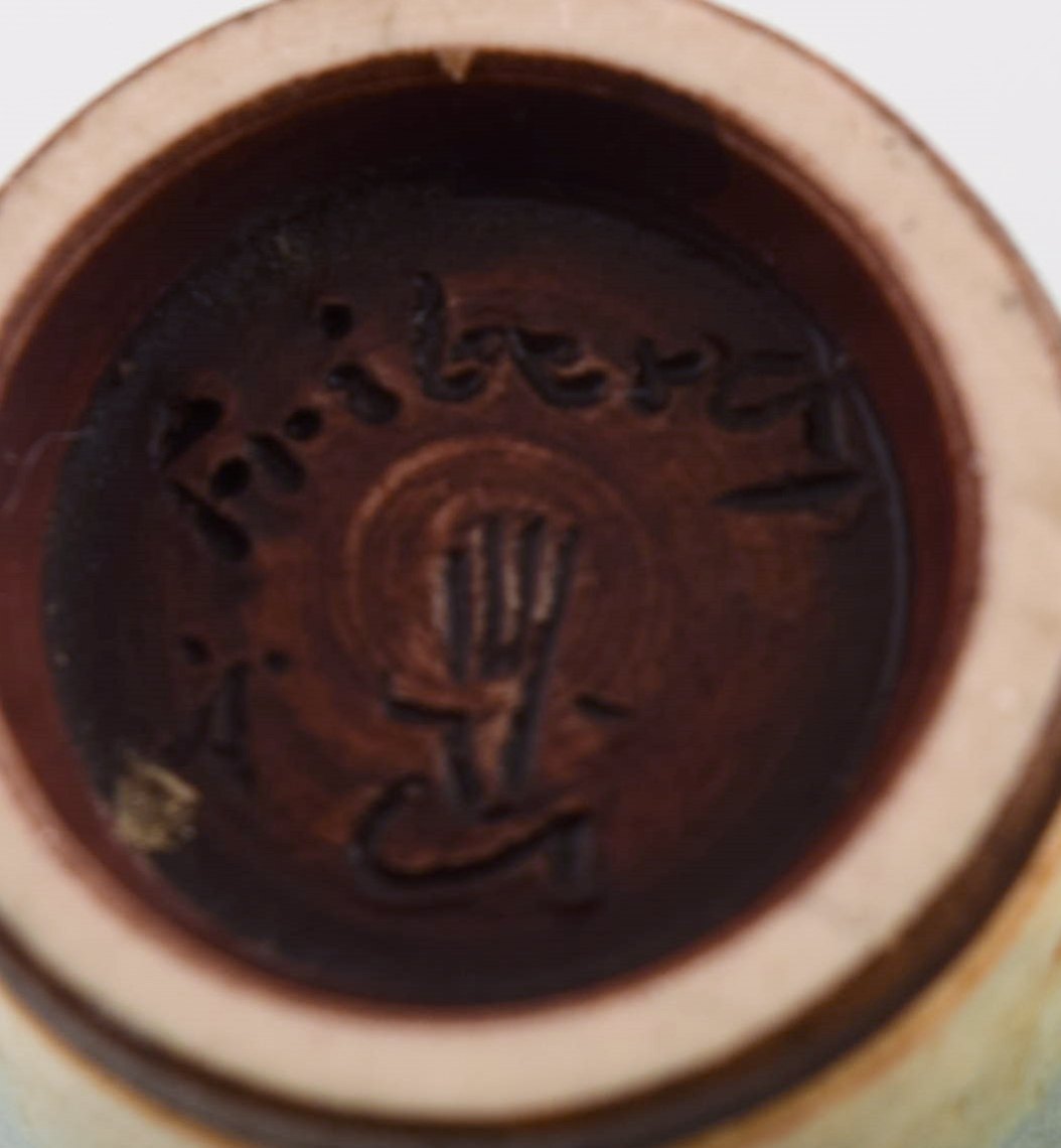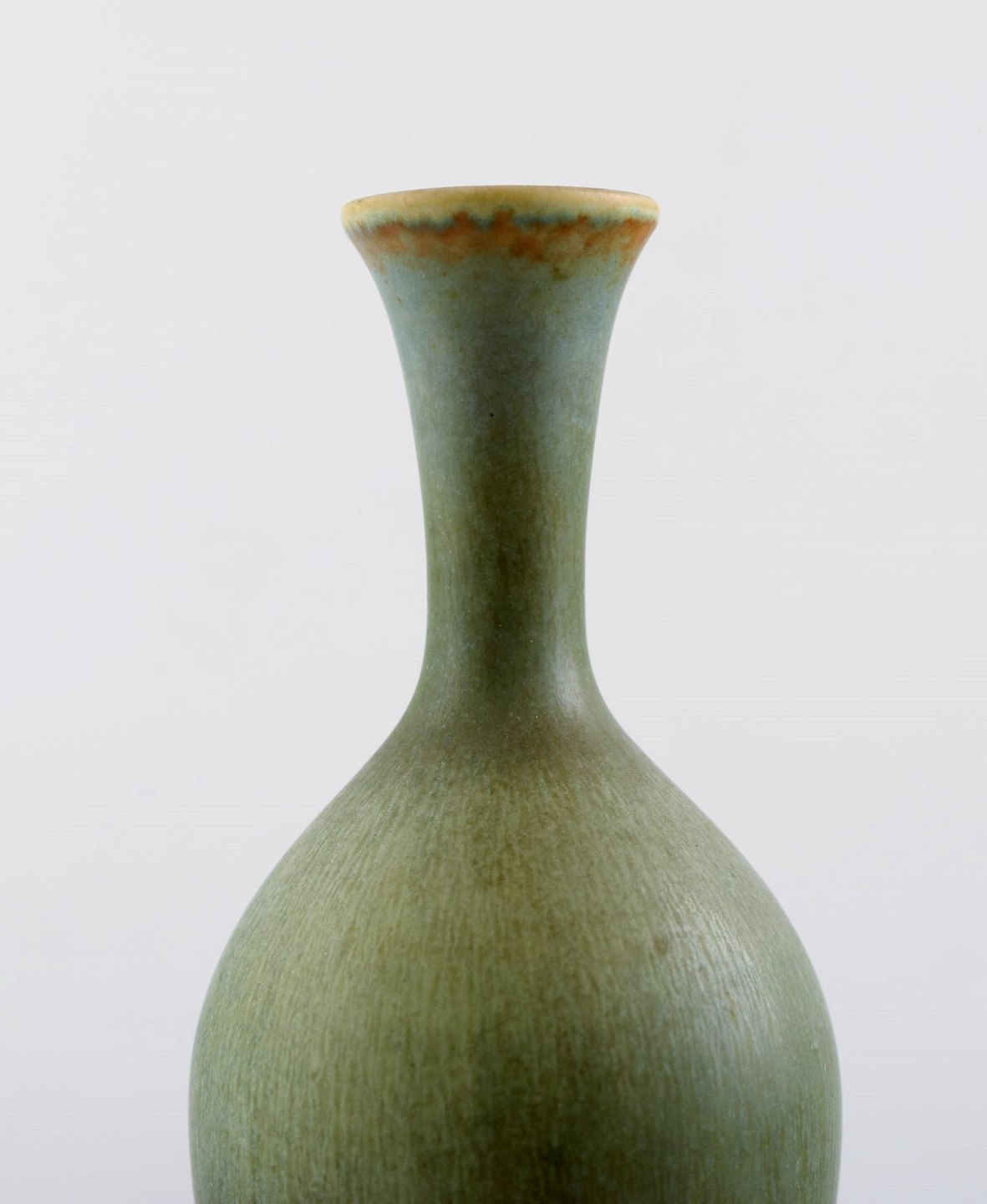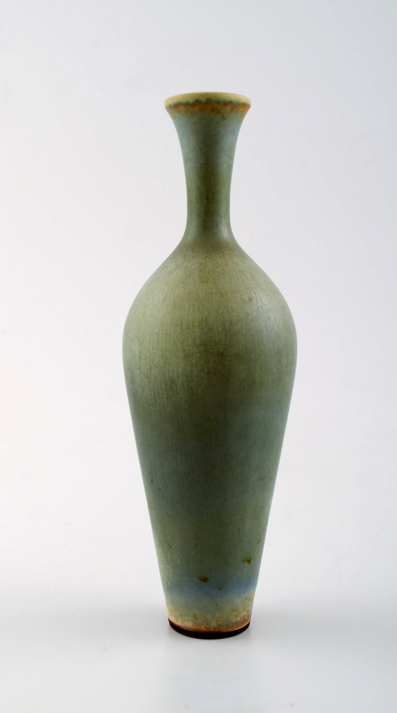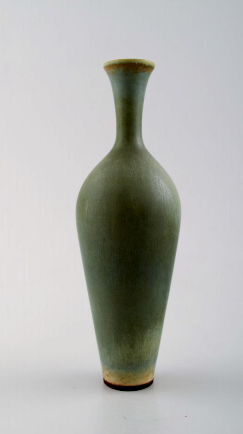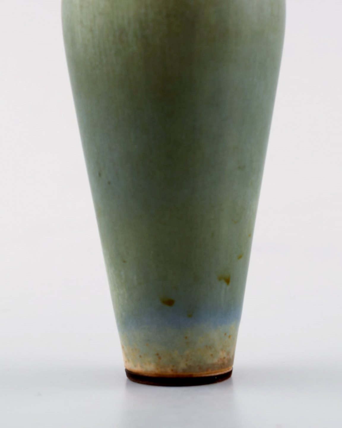 Friberg studiohand keramikvase, unika. Fantastisk glasur i grønne nuancer. Stemplet Perfekt. 1. sortering. Måler: 14 cm. x 4,5 cm.