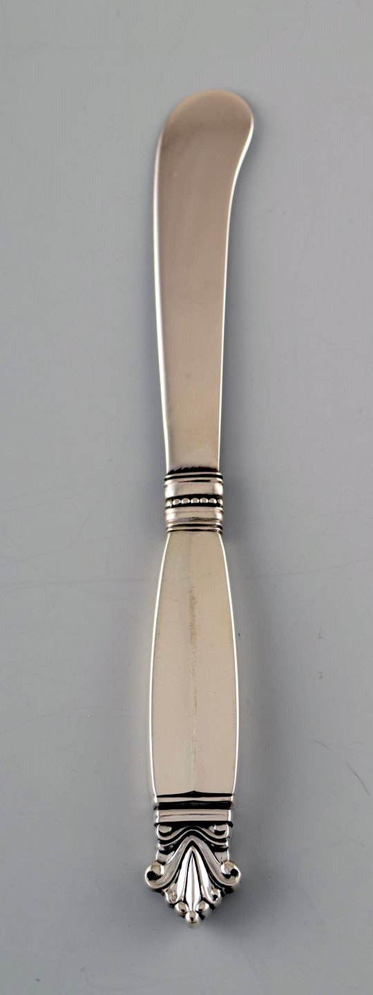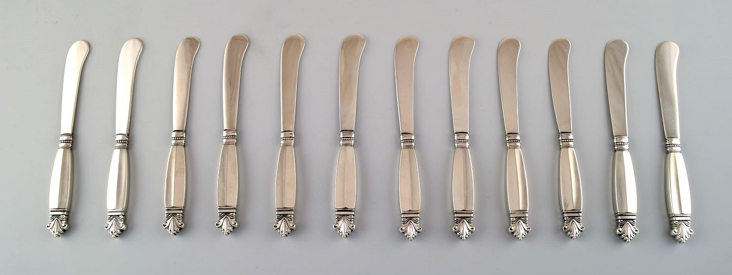 Tolv tidlige Georg Jensen Dronning Sølv, smørknive i helsølv.