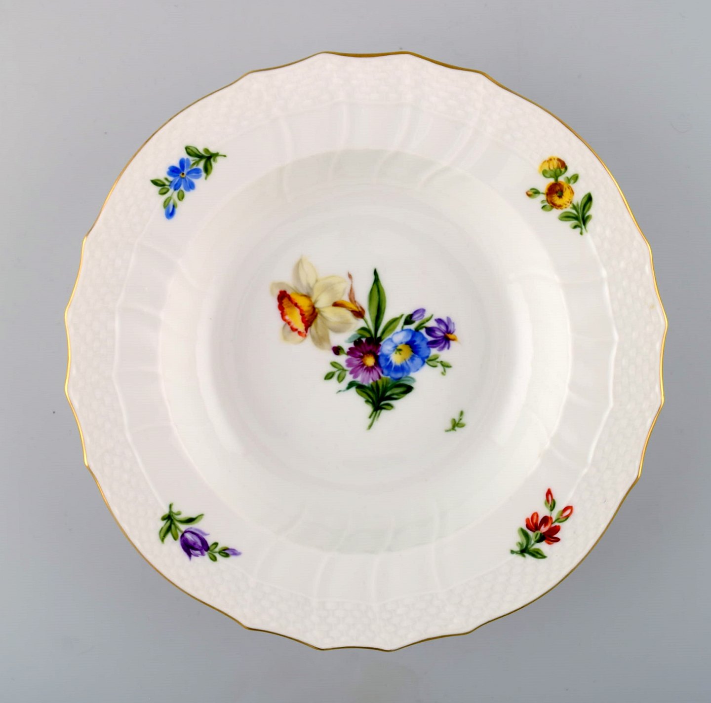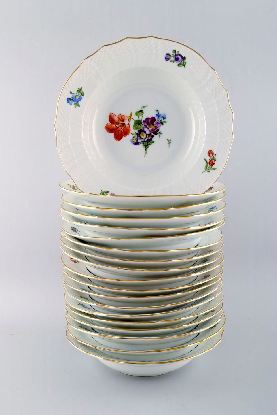 Royal Copenhagen Let Saksisk Blomst, 19 suppetallerkener Dekorationsnummer 493/1615. 2. sortering. Måler 23,5 cm. x 4,5 cm. dyb. Perfekt stand.