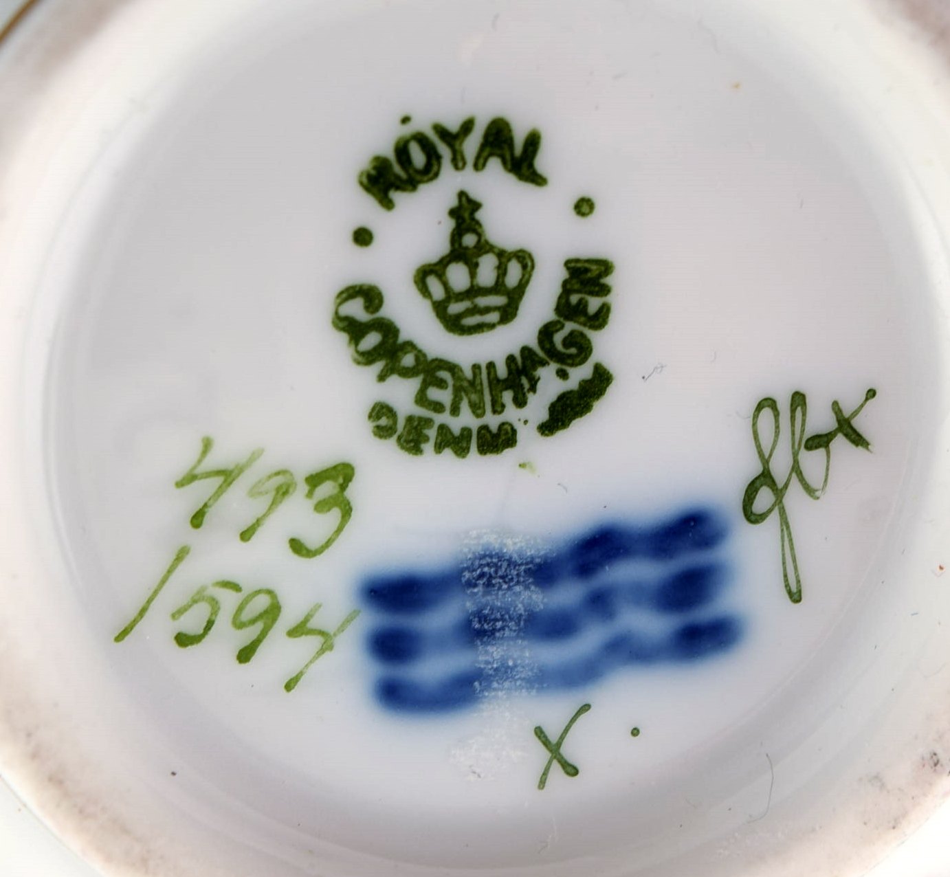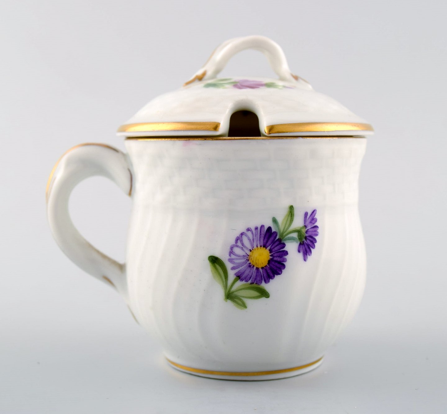 Royal Copenhagen Saxon Flower, mustard jar with lid. Decoration Number 493/1594. 1st. assortment. Measures 8.5 cm. x 6.5 cm. without handle. Perfect condition.