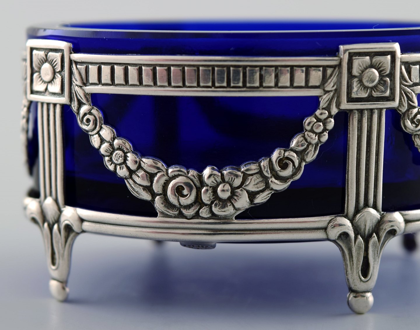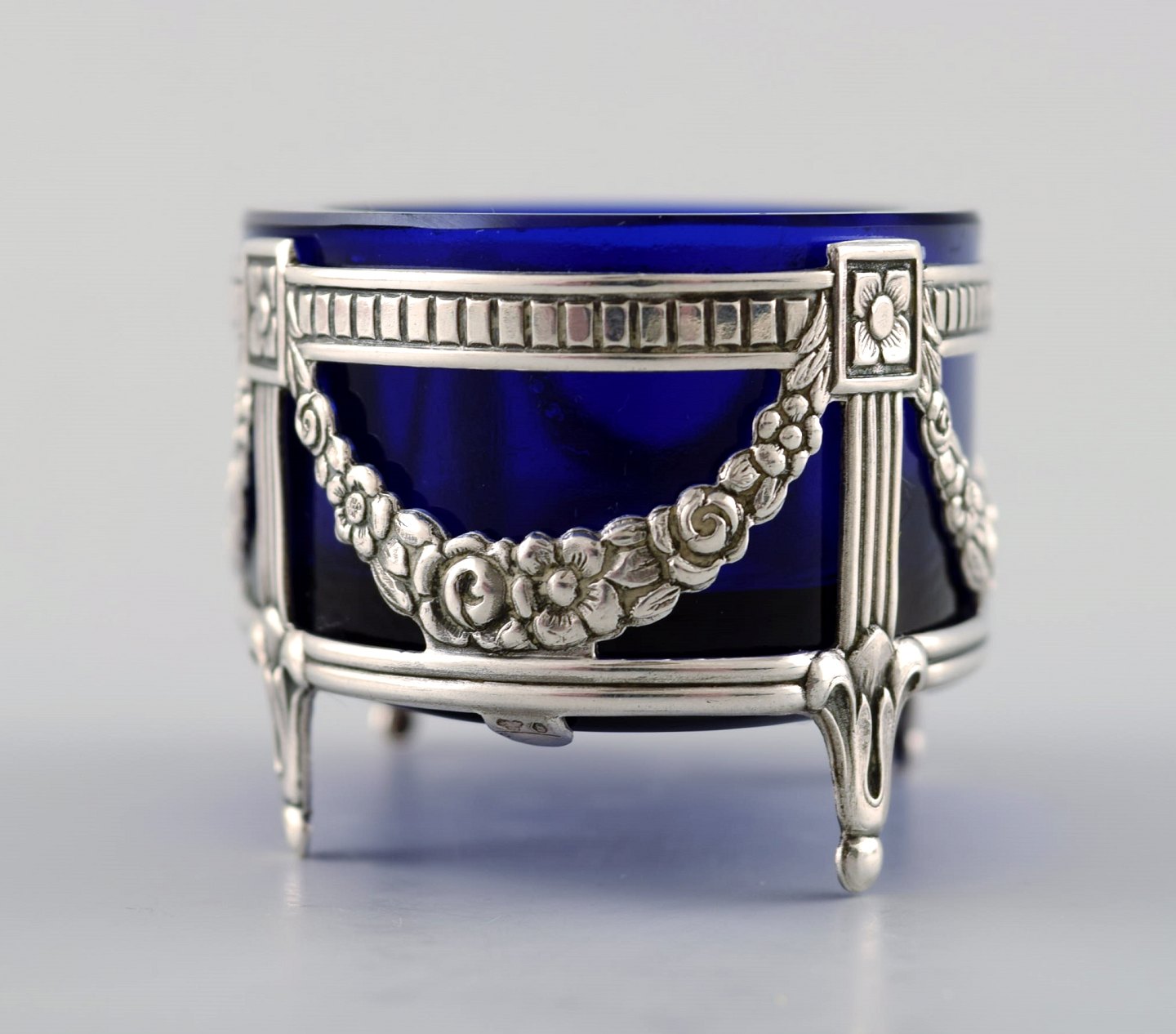 A pair of English salt vessels with glass inserts in English silver. Stamped. Ca. 1900. Measures: 5.5 cm. x 3 cm. In very good condition.