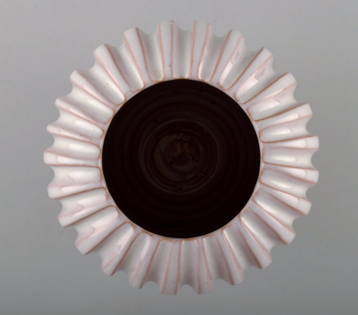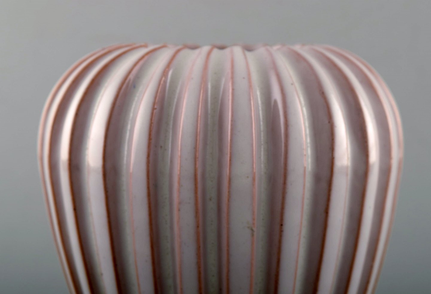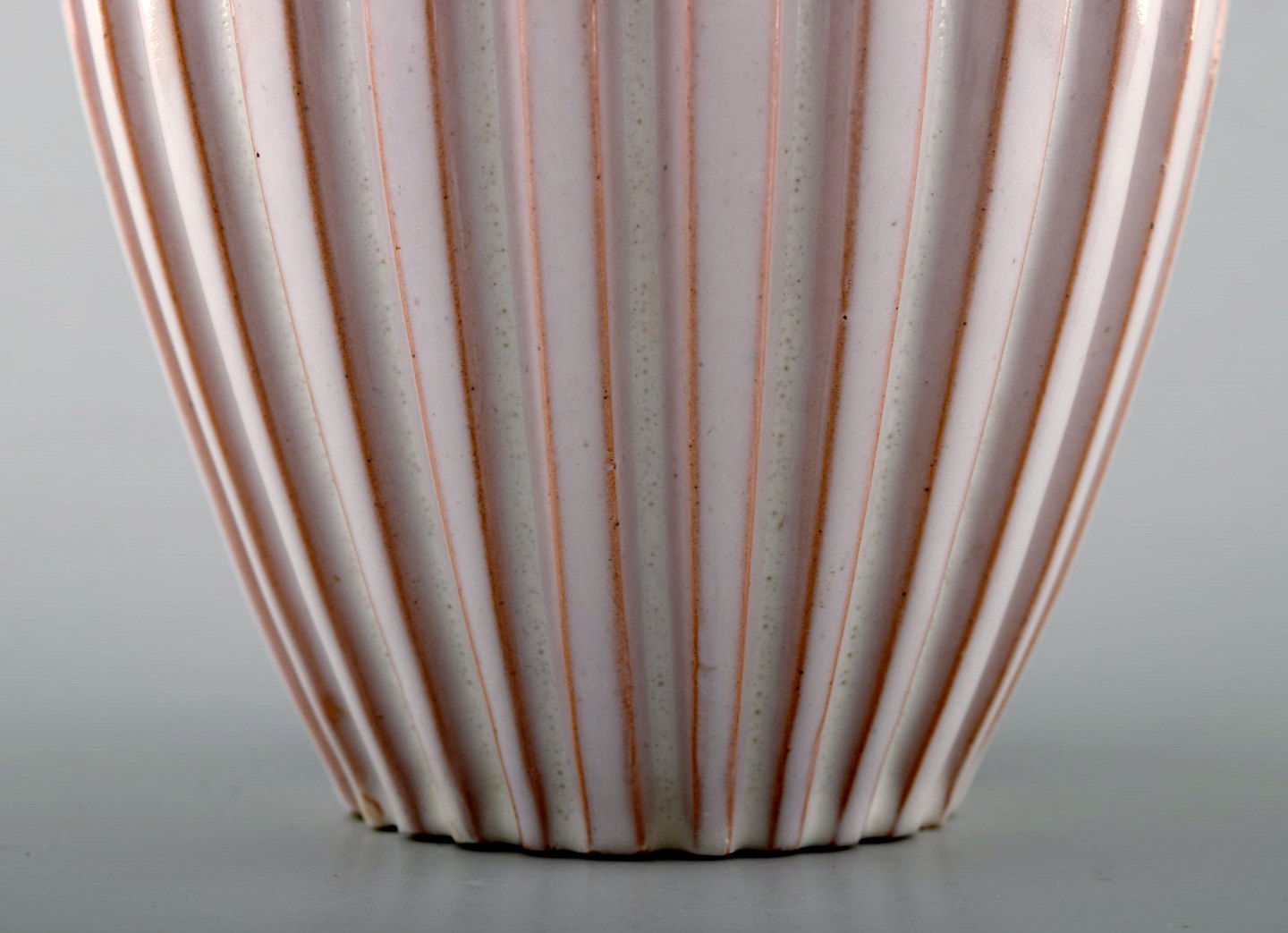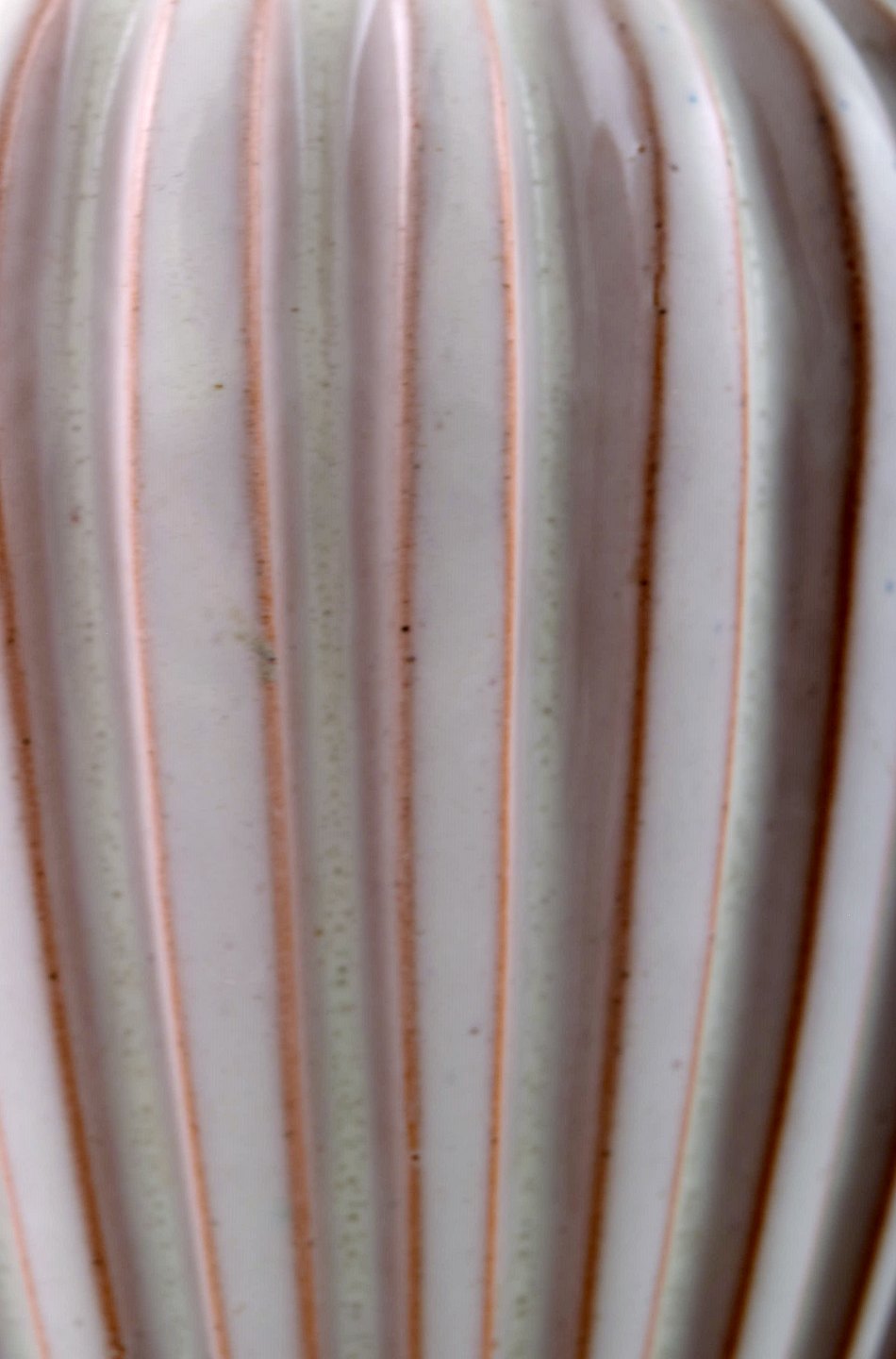 Ceramic vase from Eslau, Plain / ribbed design. Early Eslau 60s vase in white glaze. In perfect condition. Signed Eslau. Height: 15 cm. Diameter: 12.5 cm.