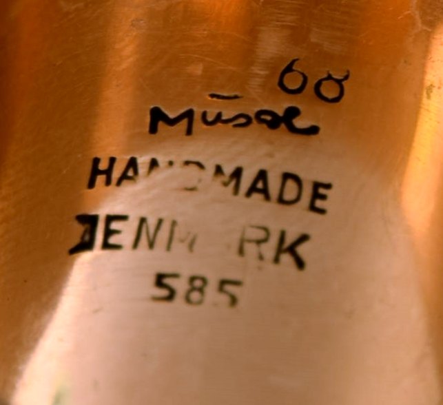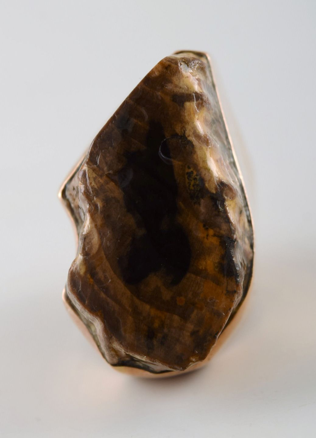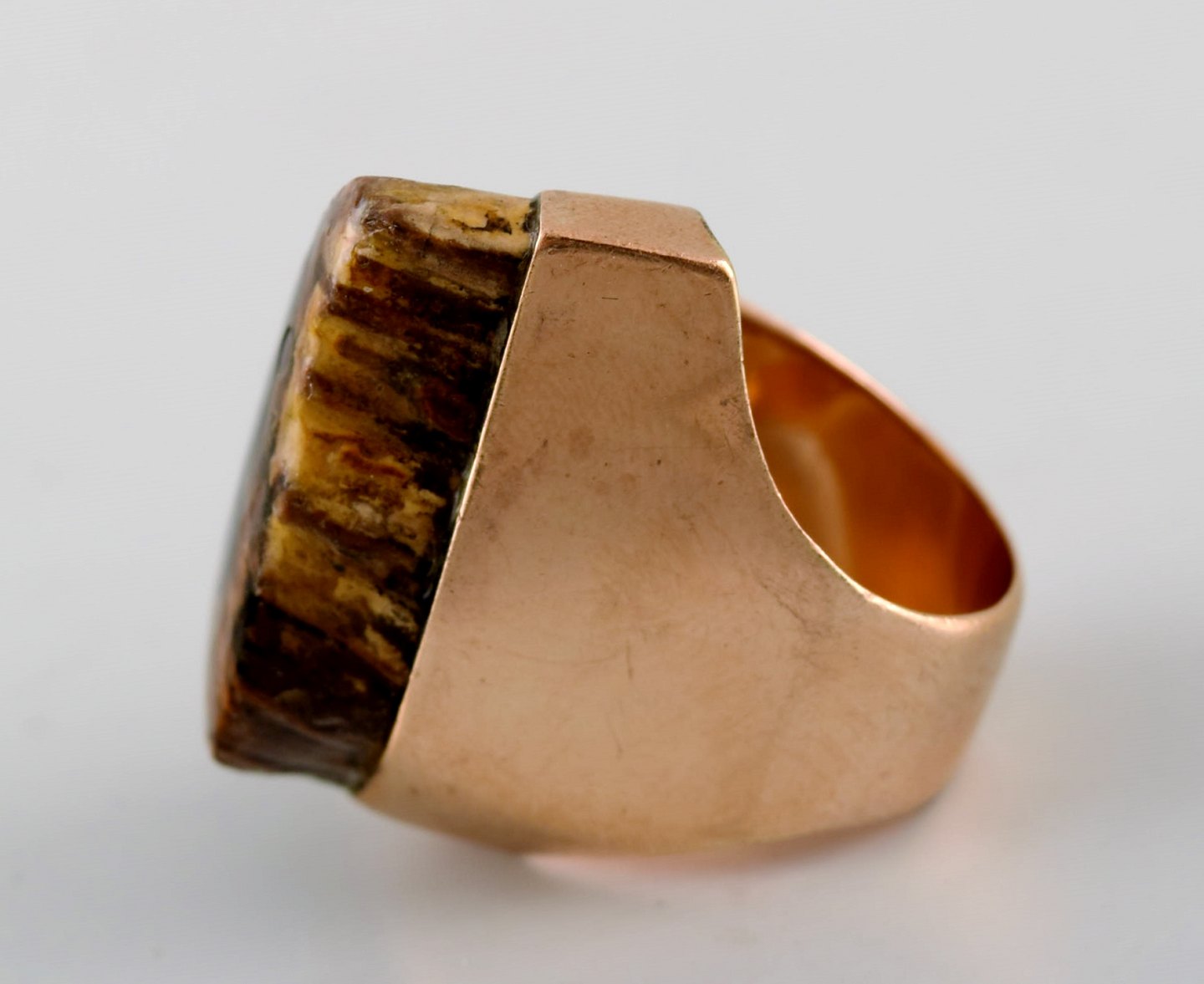 Peder Musse: ring af 14 kt. guld prydet med forstenet træ. Stemplet. I flot stand. Størrelse 51. 16,2 mm. Vores gulvsmed kan ændre til alle størrelser for kr. 300.-