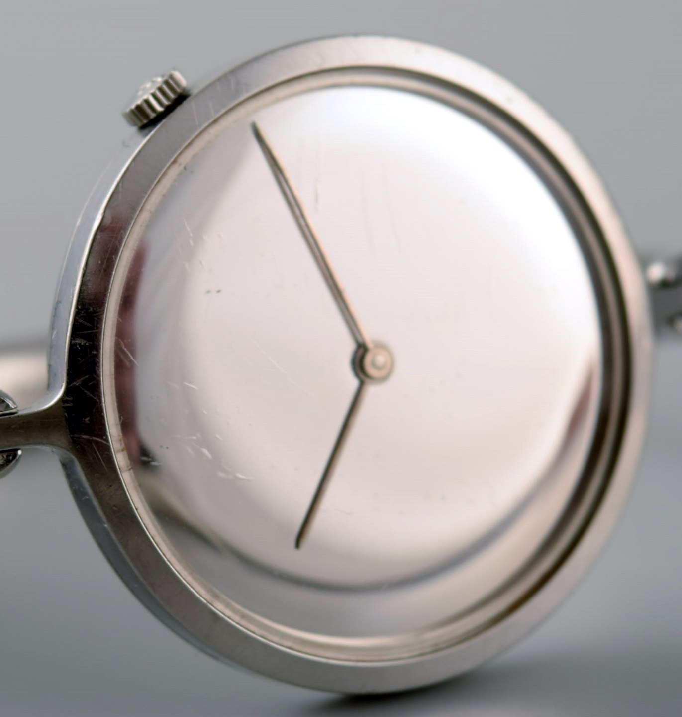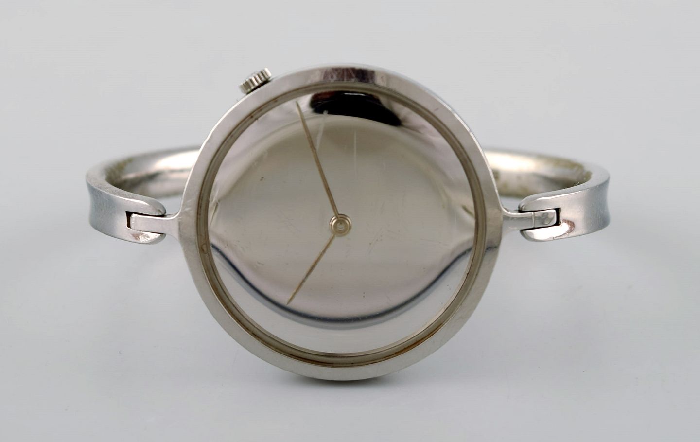 Mirror dial with silvered hands. Integrated bangle bracelet of steel. Circumference app. 16 cm. Watch diameter app. 33 mm.