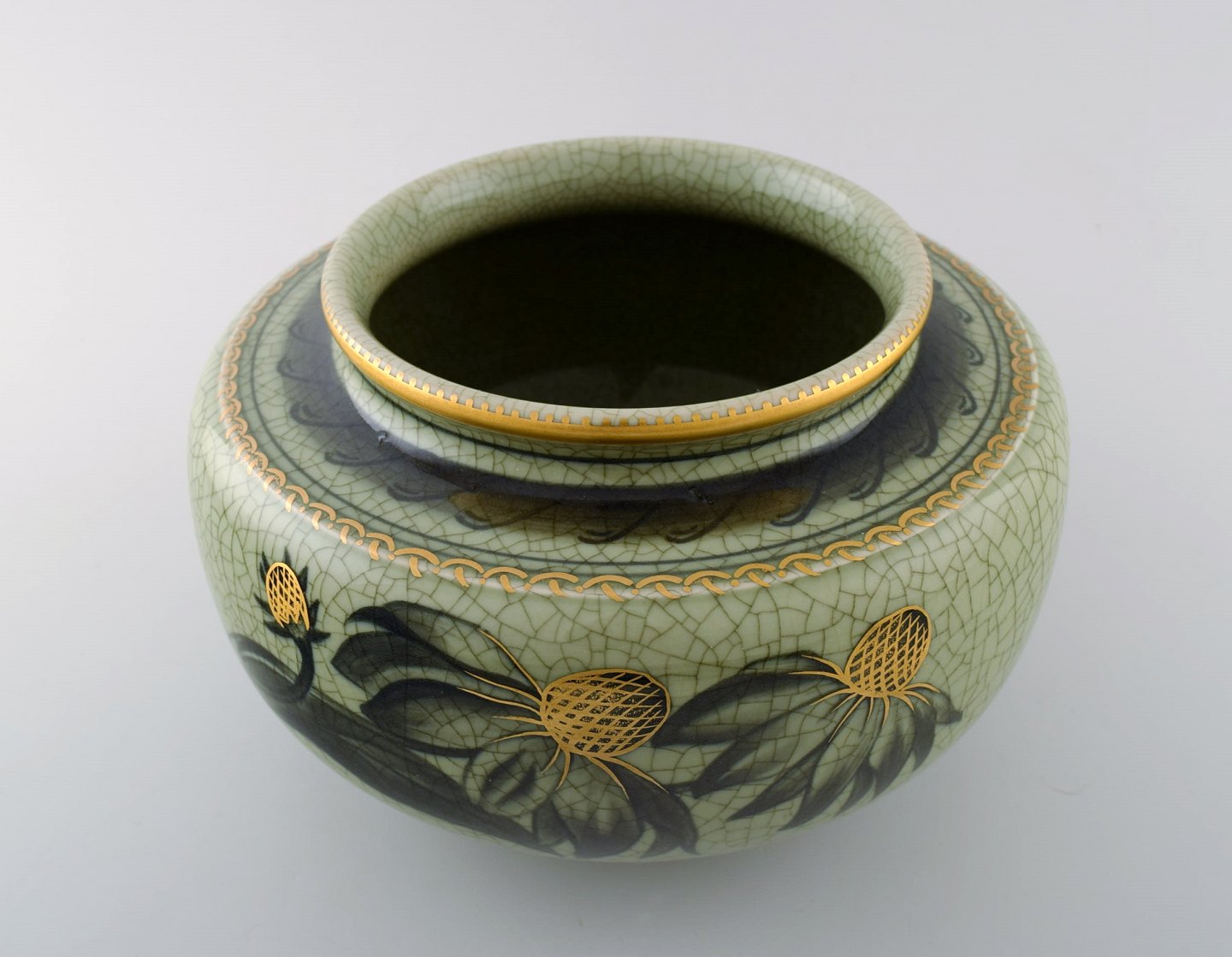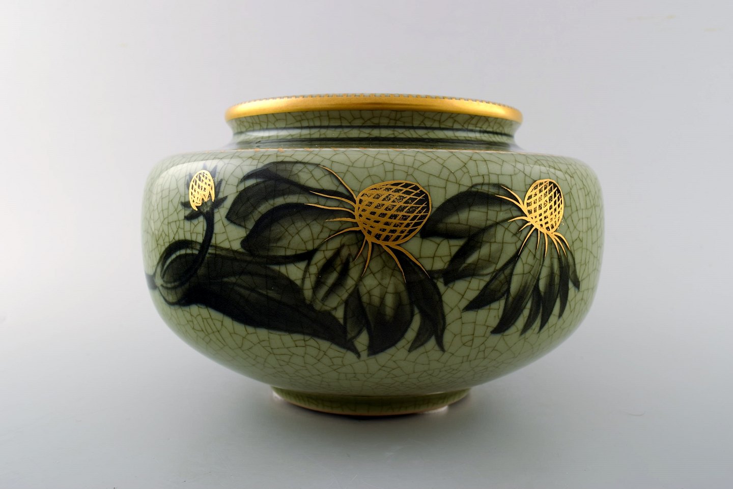 Royal Copenhagen/Kgl. P. krakkeleret/craquele art deco porcelænsvase. Dekoreret med blomster, guldkant. Ca. 1940´erne. I perfekt stand, 1. sortering. Måler 21 cm. x 13 cm.