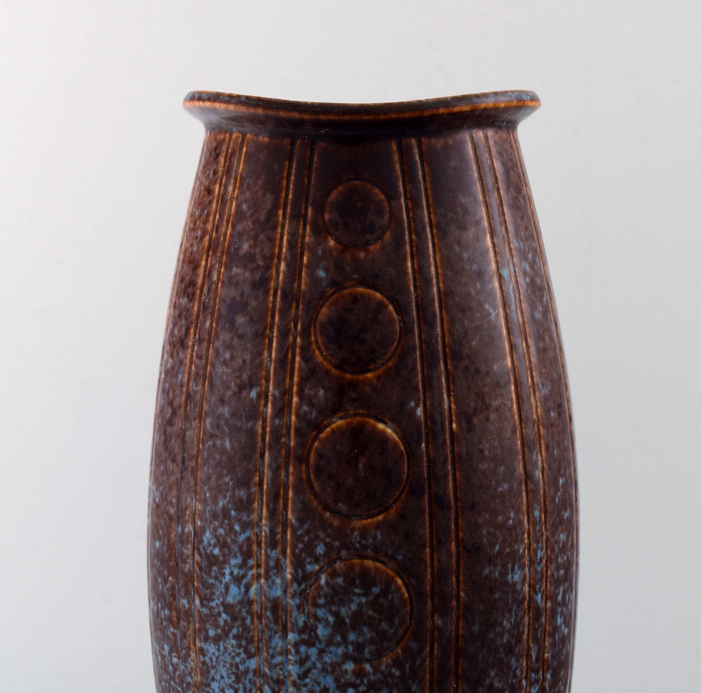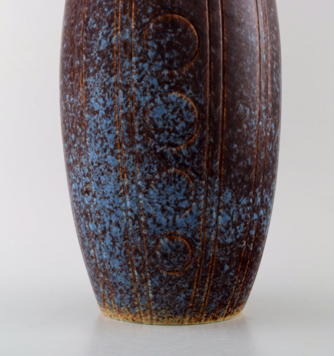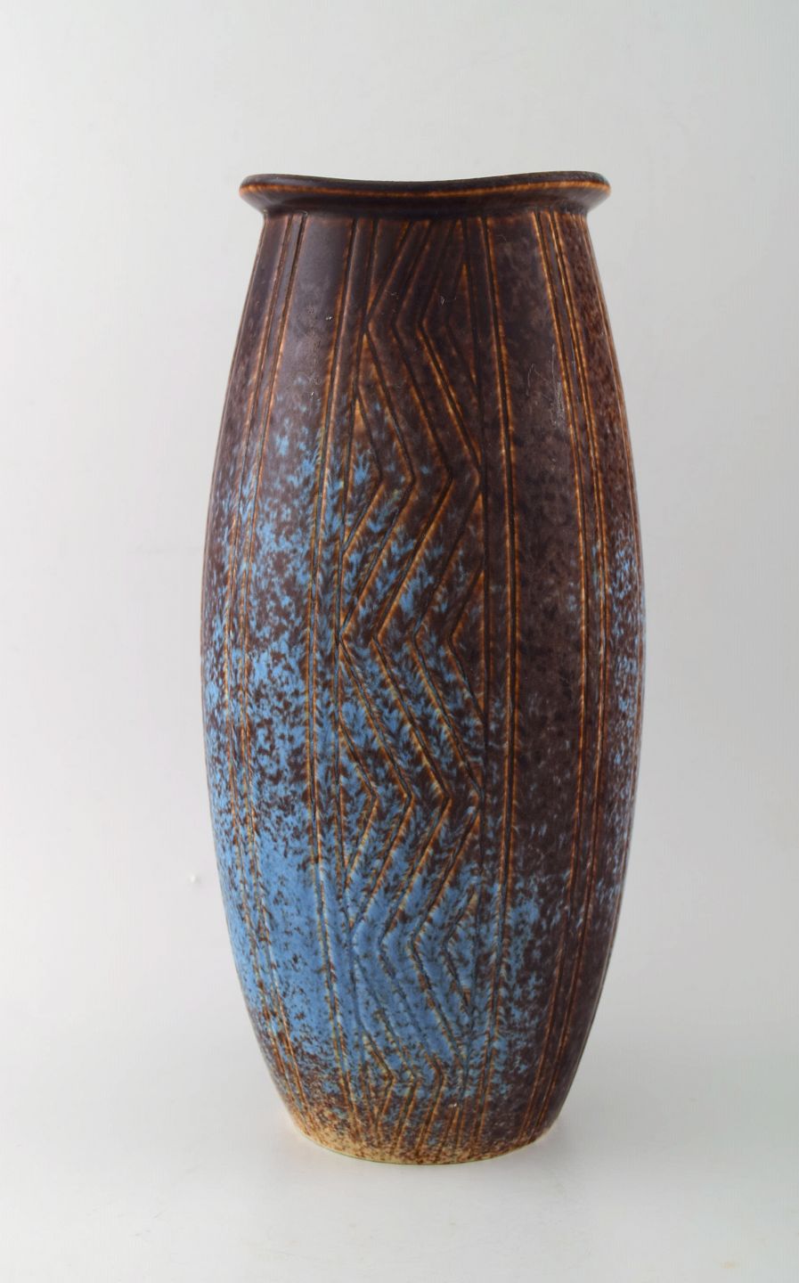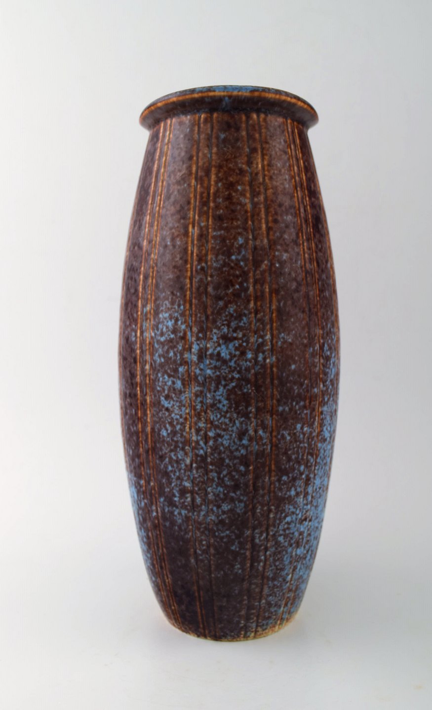 Stor Rörstrand/Rørstrand stentøjsvase af Gunnar Nylund. 26 cm. høj. Diameter 12 cm. I perfekt stand. Flot glasur i blå og brune nuancer. 1. sortering. Stemplet.