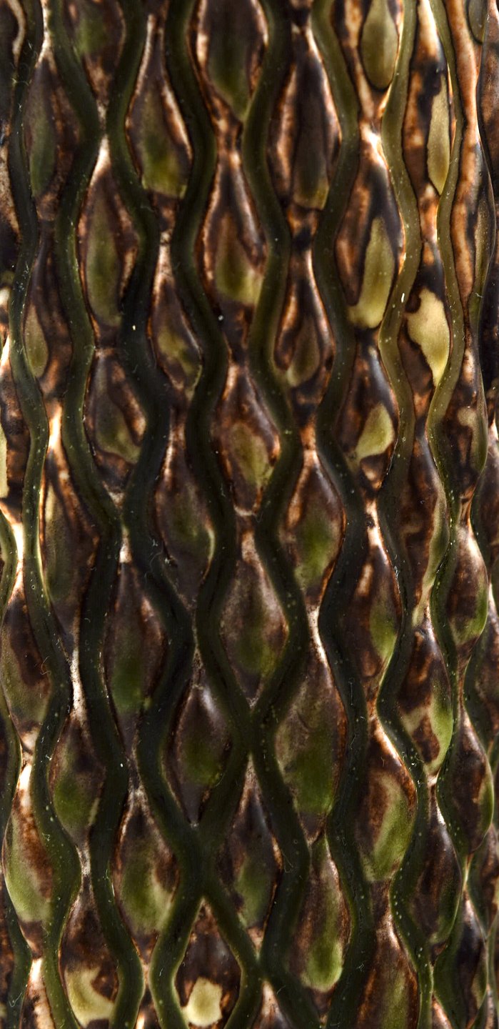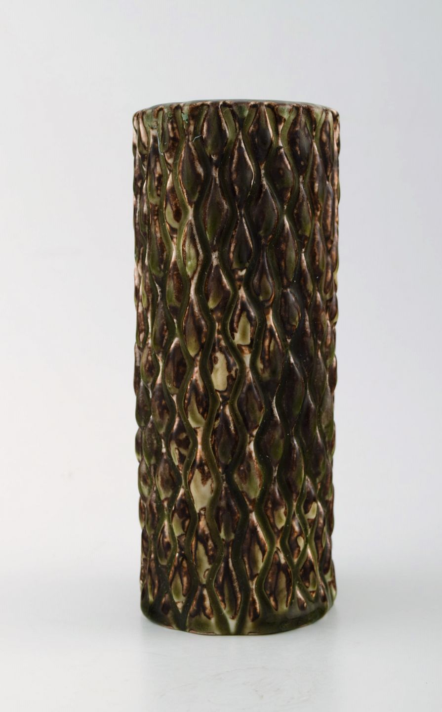 Vase af stentøj modelleret i spirende stil, dekoreret med grønlig sung glasur. Usædvanlig smuk glasur.