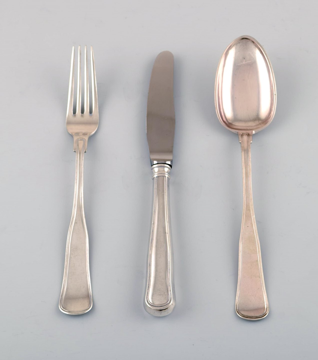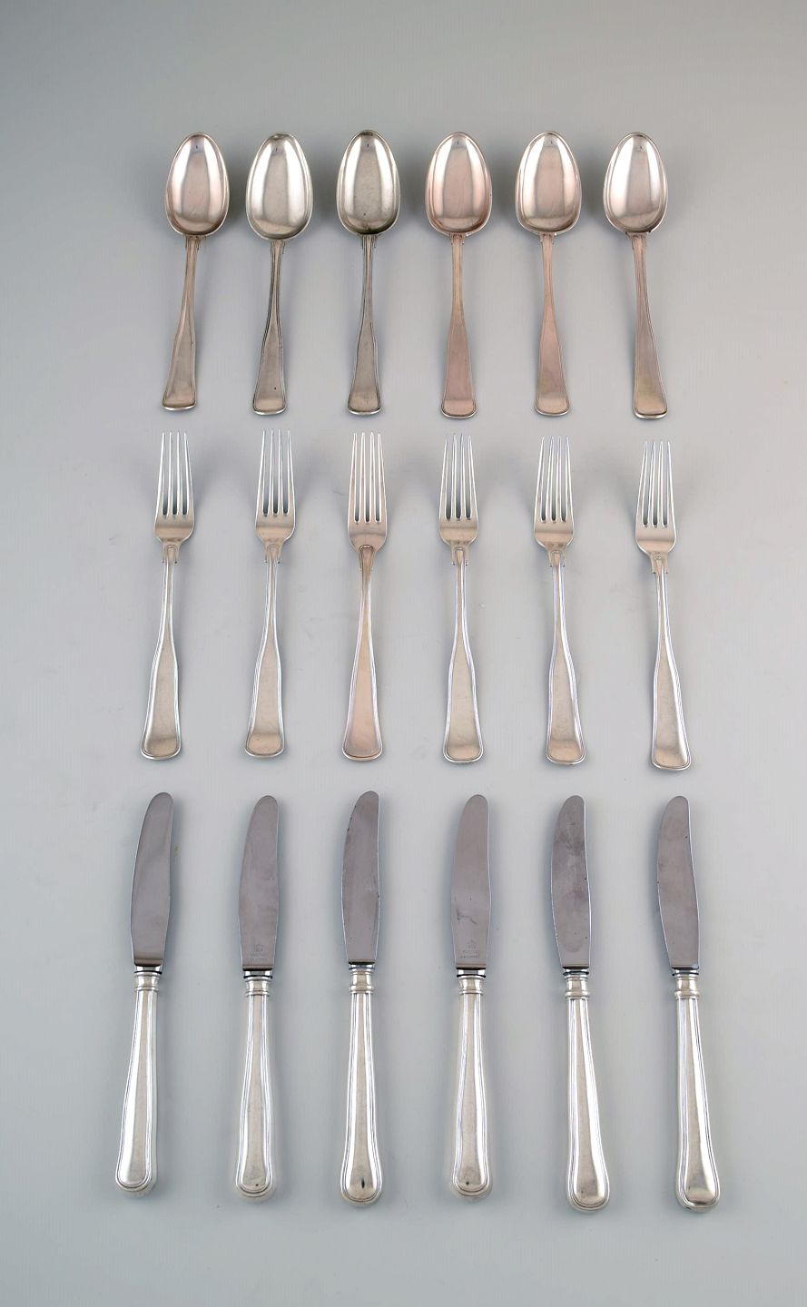 Dobbeltriflet middagsservice tretårnet sølvbestik til 6 personer. I alt 18 dele. Sættet består af 6 skeer, 6 gafler, 6 knive. Stemplet J. Jensen samt tre tårne. I flot stand. Kniv måler 22 cm.