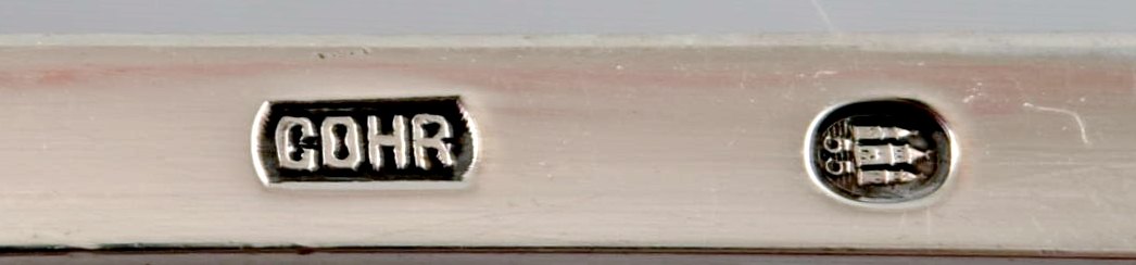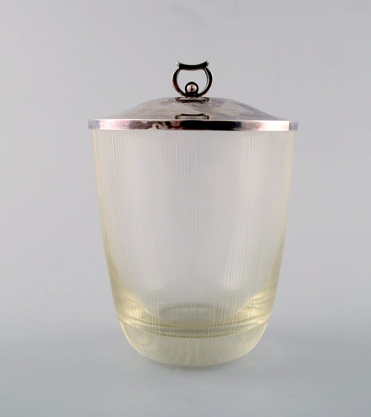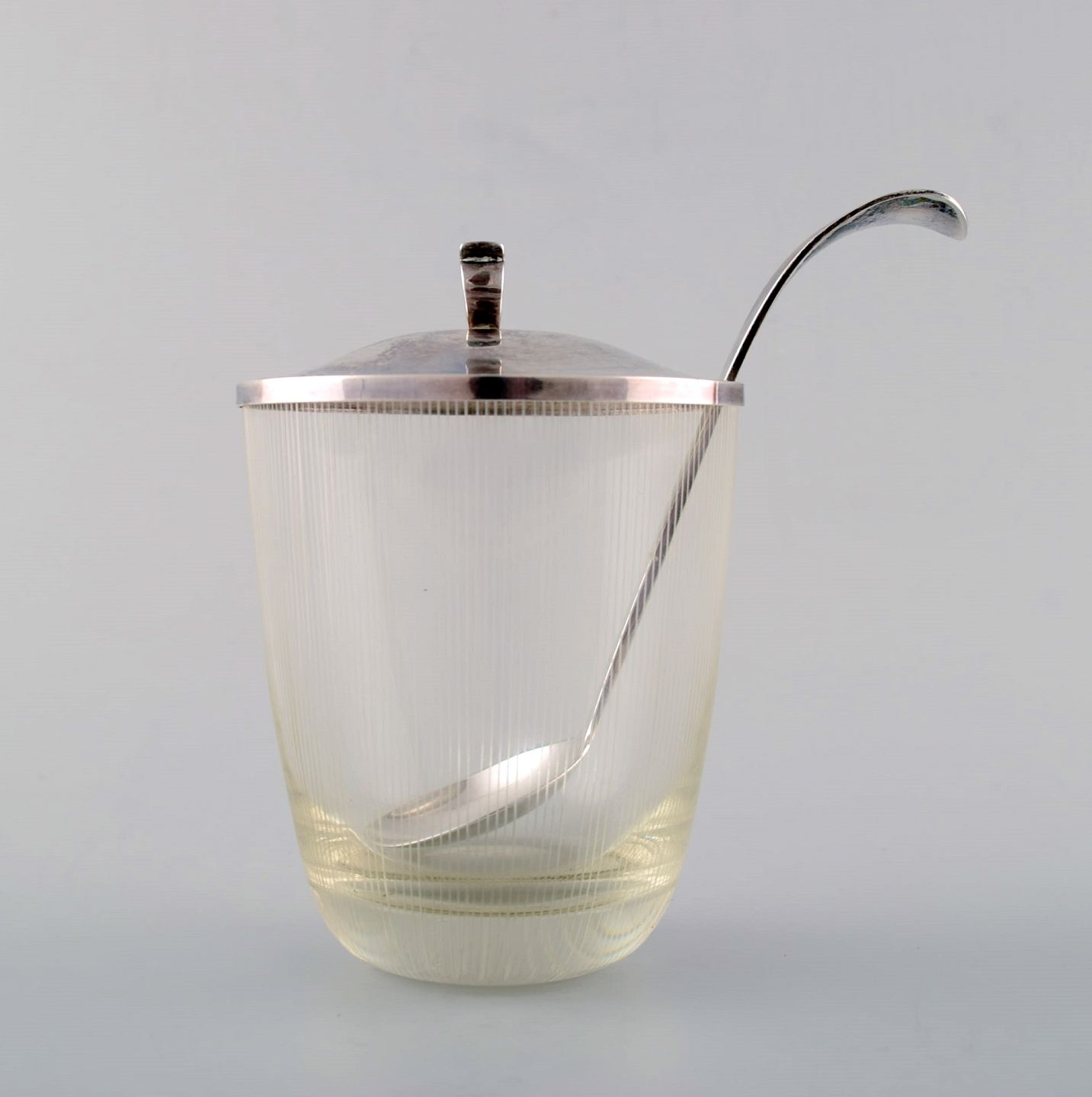 E. Dragsted, Danish silversmith. Marmalade jar of art glass with lid and spoon of sterling silver. Danish design, mid 1900's. Stamped. Measures: 12 cm. x 7.5 cm. In very good condition.