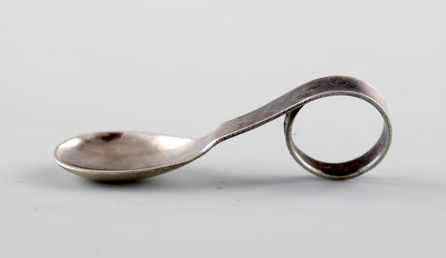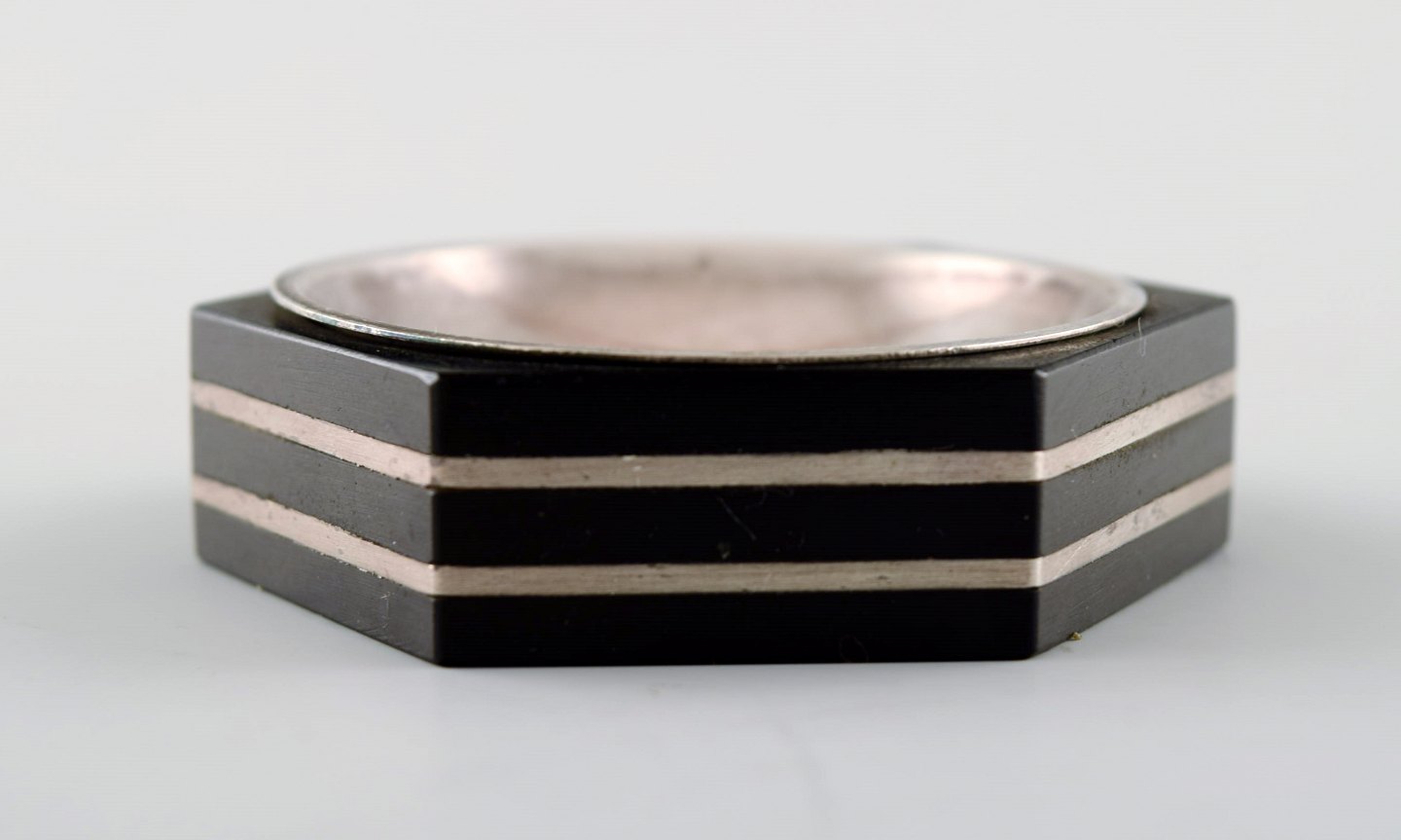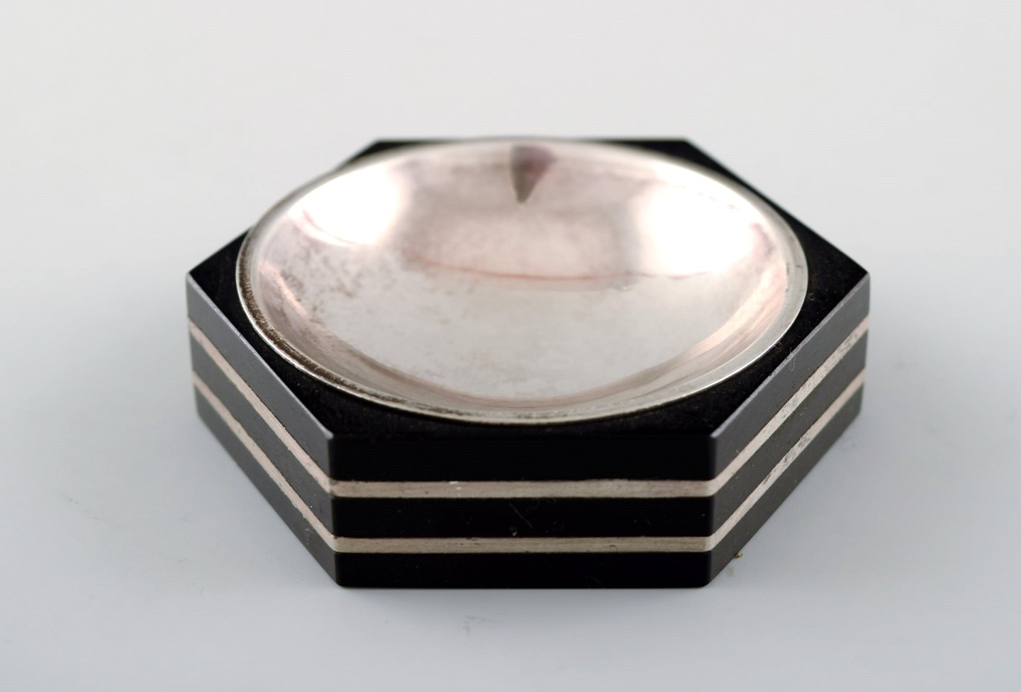 GAB (Guldsmedsaktiebolaget) art deco hexagonal salt cellar in silver and ebony with matching salt spoon. Sweden, 1936. Measures 5.5 cm. x 1.2 cm. Marked. In very good condition.