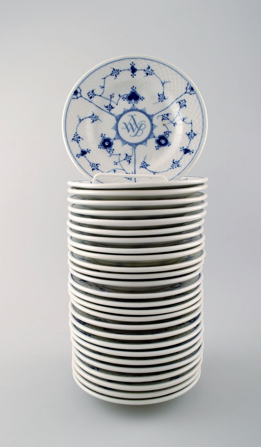 27 stk. B&G, Bing & Grøndahl Hotel/restaurantservice, jernporcelæn, musselmalet tallerkener. Med monogram.