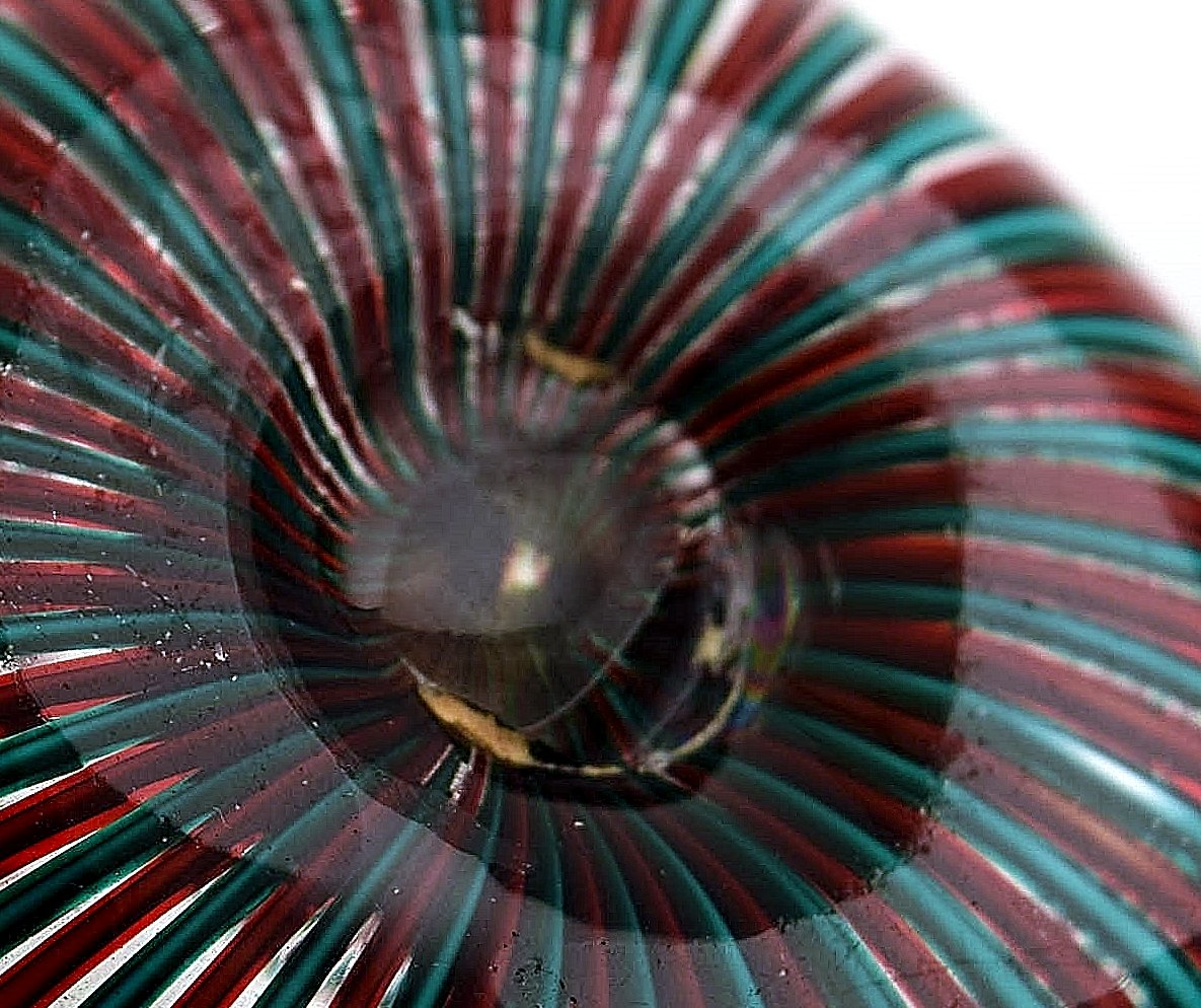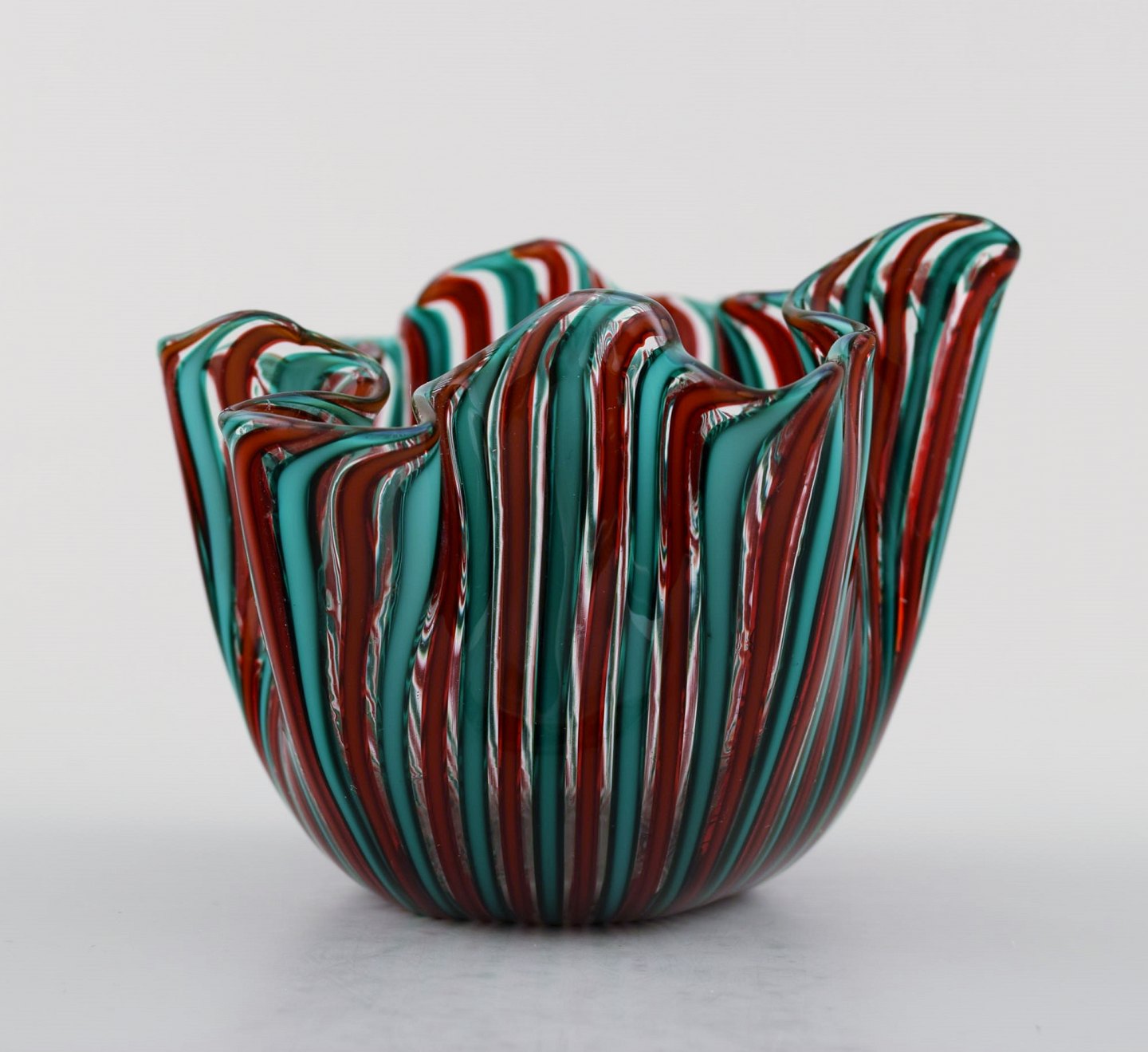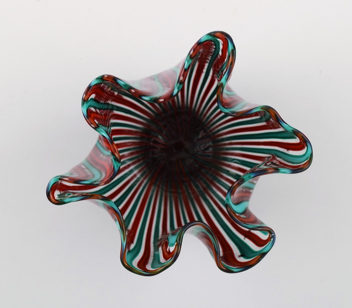 Bianconi Venini/Murano Filigrana Stribet, Italiensk Kunstglas Fazzoletto Vase, Lommetørklædevase. 1960´erne. Måler : 8 cm. x 6,5 cm. I perfekt stand.
