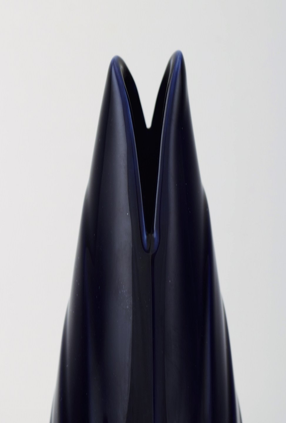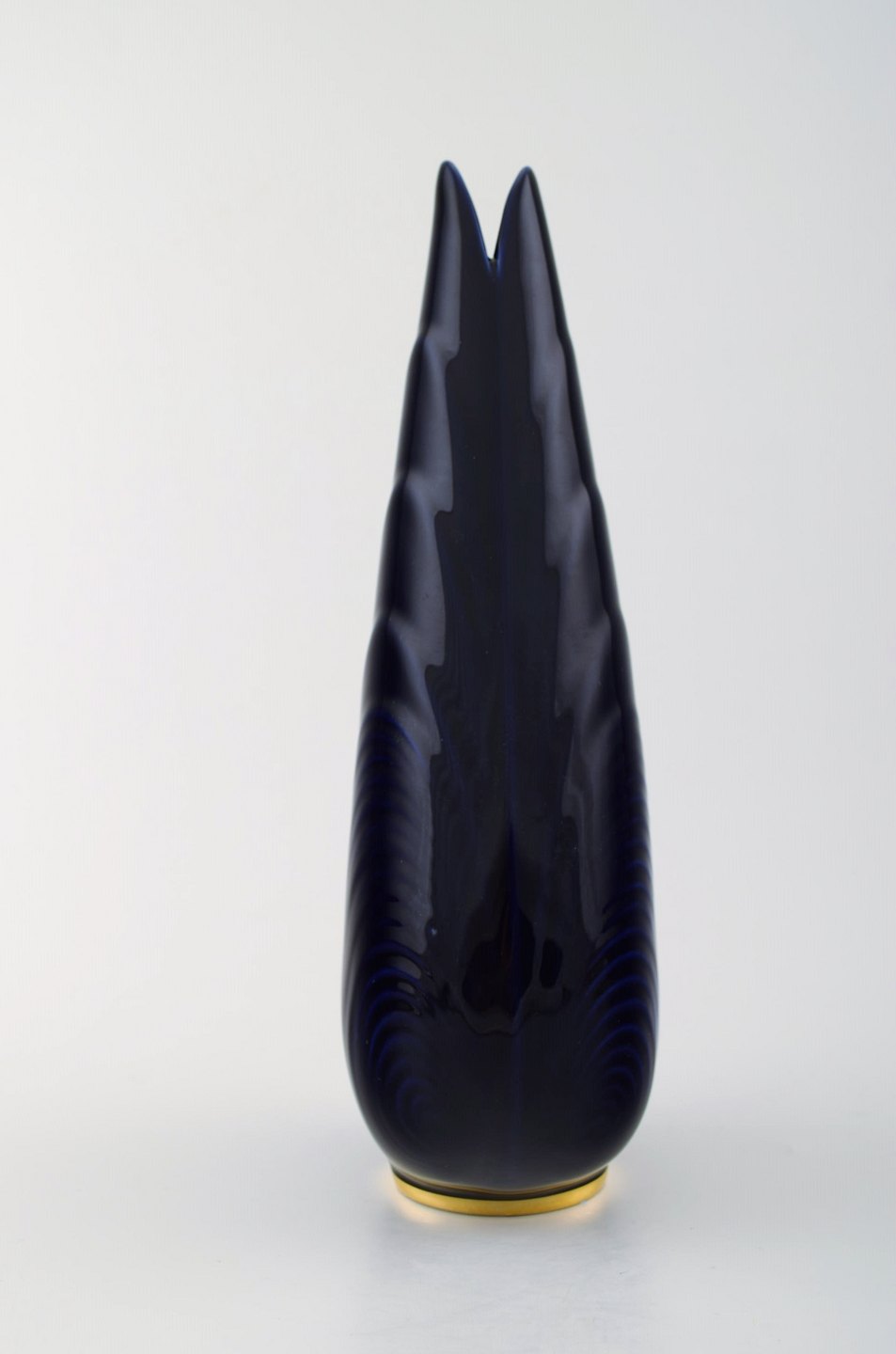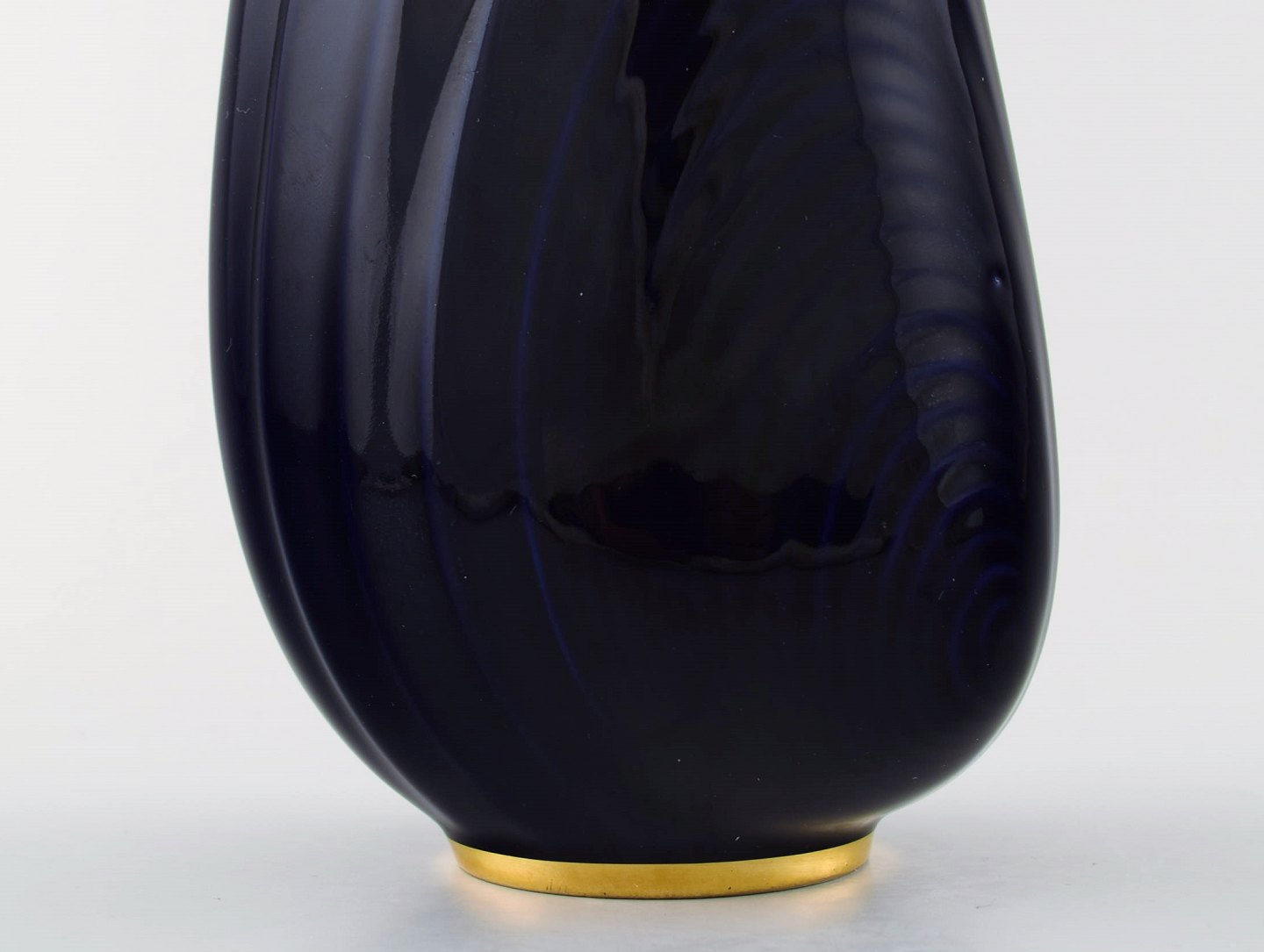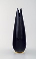 Upsala-Ekeby/Karlskrona. Keramikvase, marineblå glasur med guld dekoration i bunden. Muslingeformet.