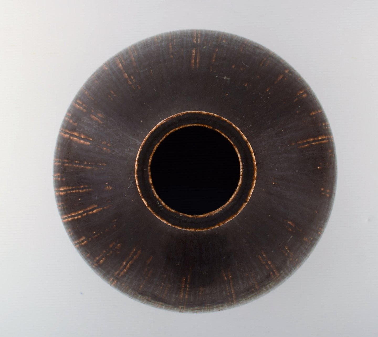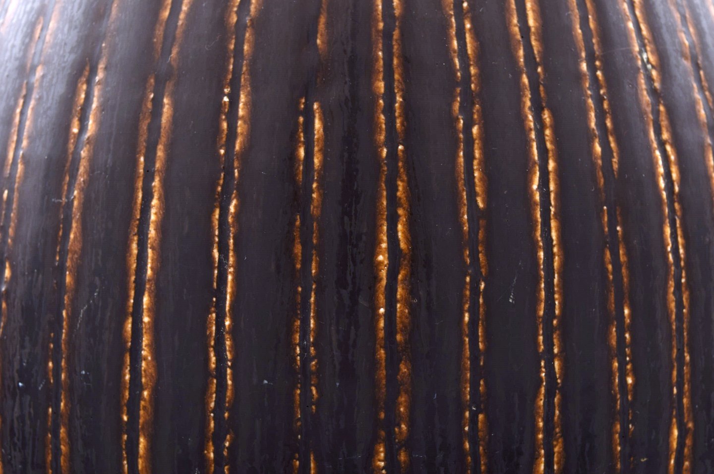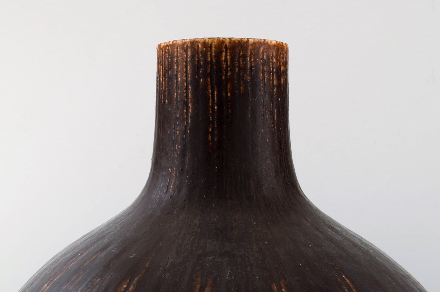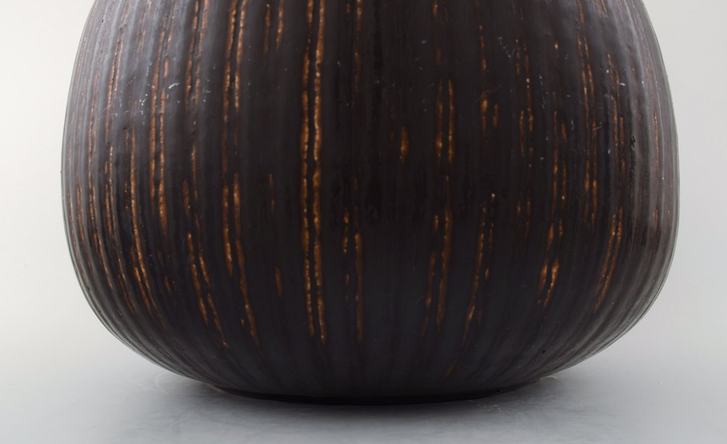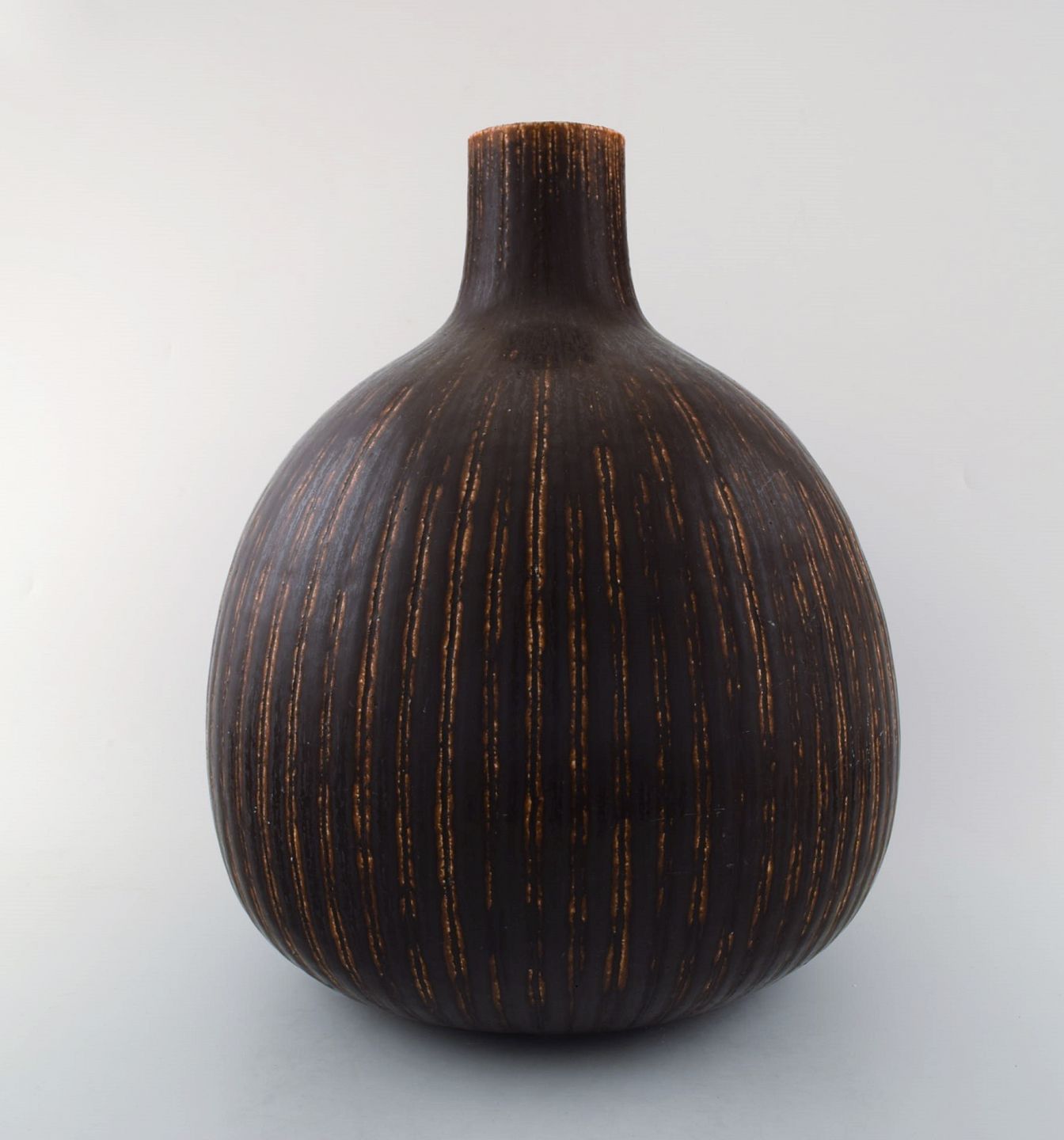 Saxbo: Very large and rare teardrop shaped vase with vertical fluted pattern, decorated with dark brown glaze.