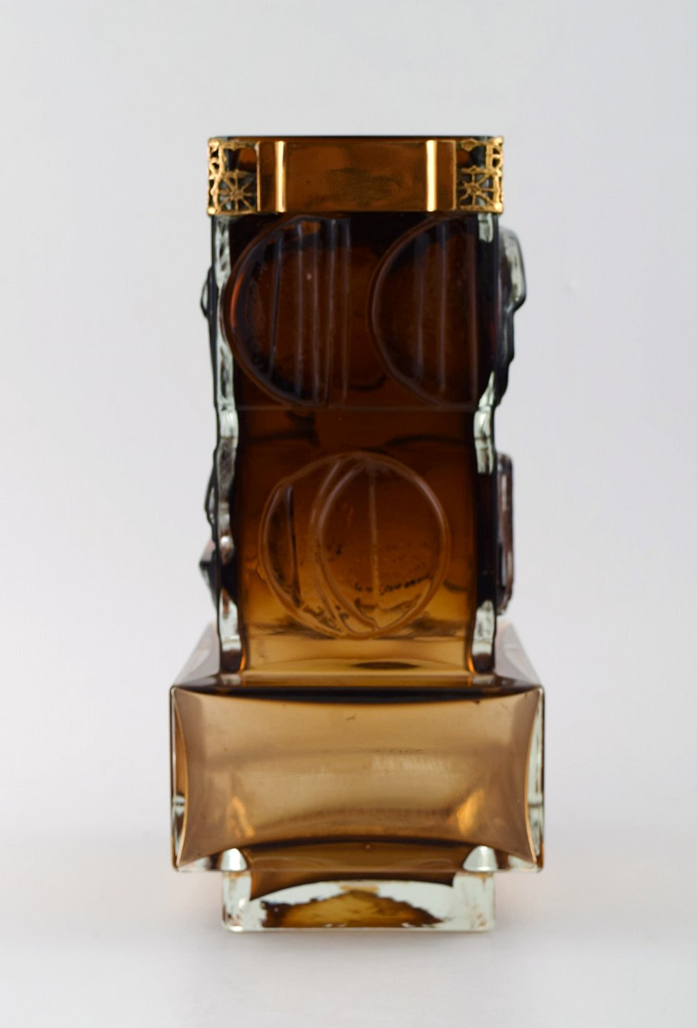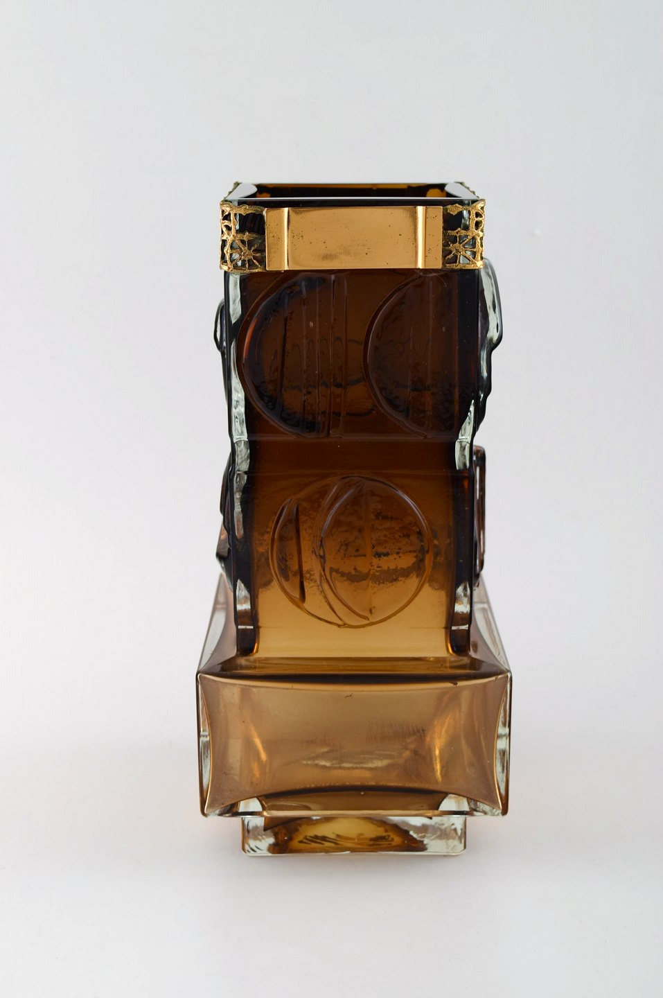 Smoky brown art glass vase with circular shapes on all sides of the vase and a patterned metal band, designed by Pentti Sarpaneva. The glass was manufactured at Oy Kumela and the matching bronze cylinder at Turun Hopea of Finland.