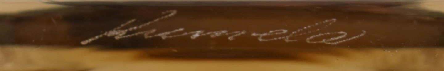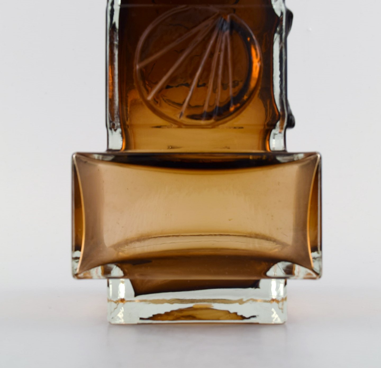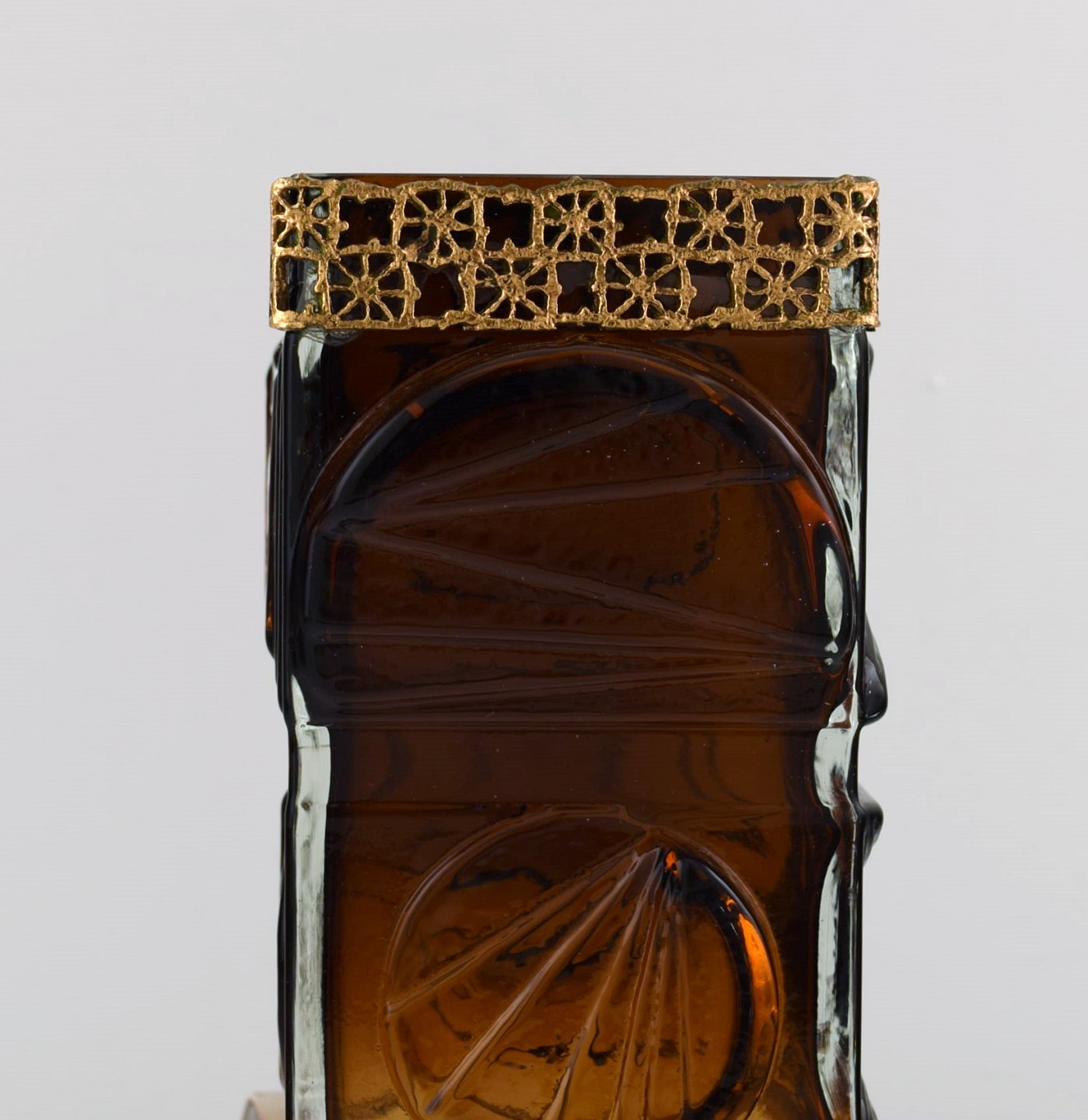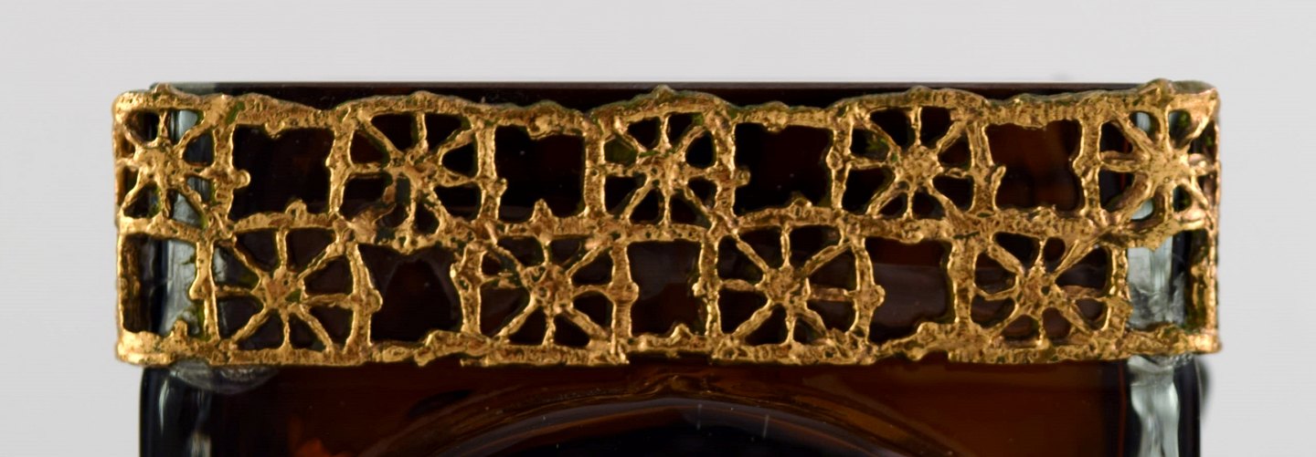 Pentti Sarpaneva, brother of the well known glass designer Timo Sarpaneva, was a designer mostly known for his beautiful jewelry. The metal band with a decorative cross pattern around the top of this glass vase is an example of his vast skills in metal working. It shows his distinctive style which can also be seen in his jewelry.