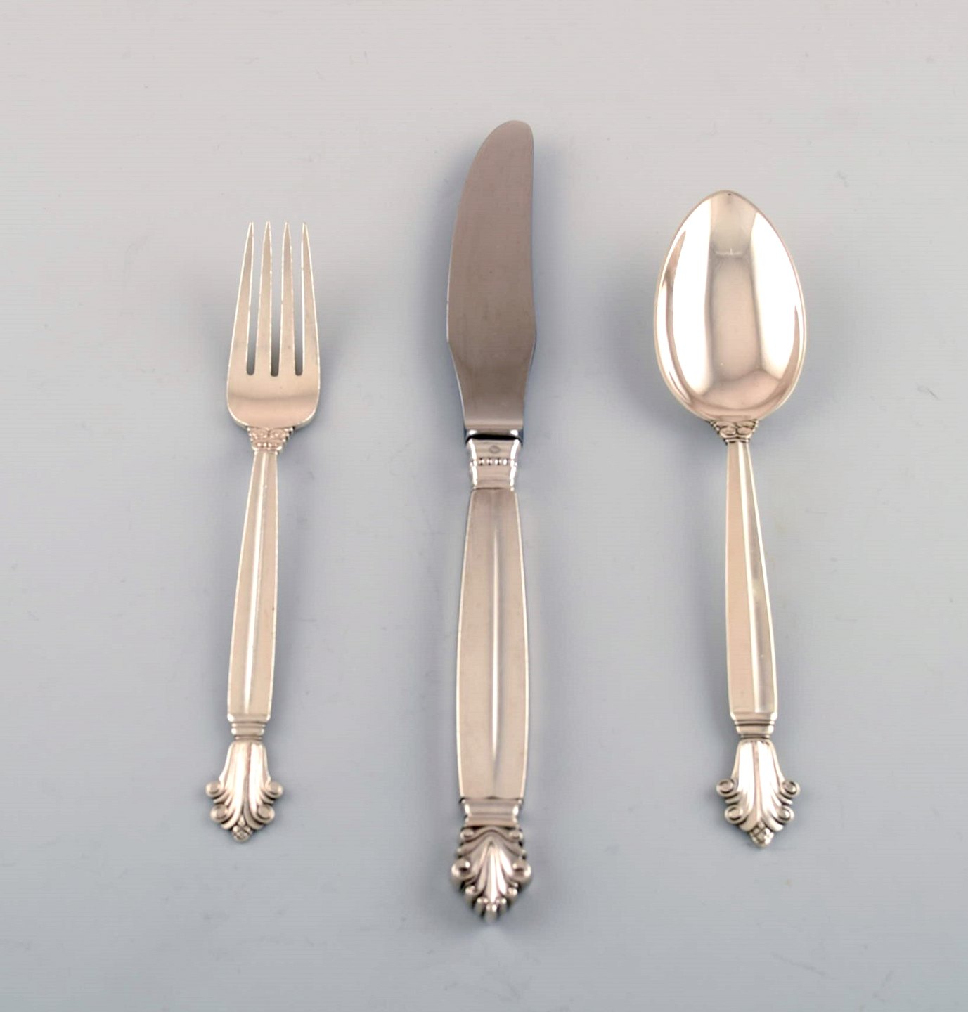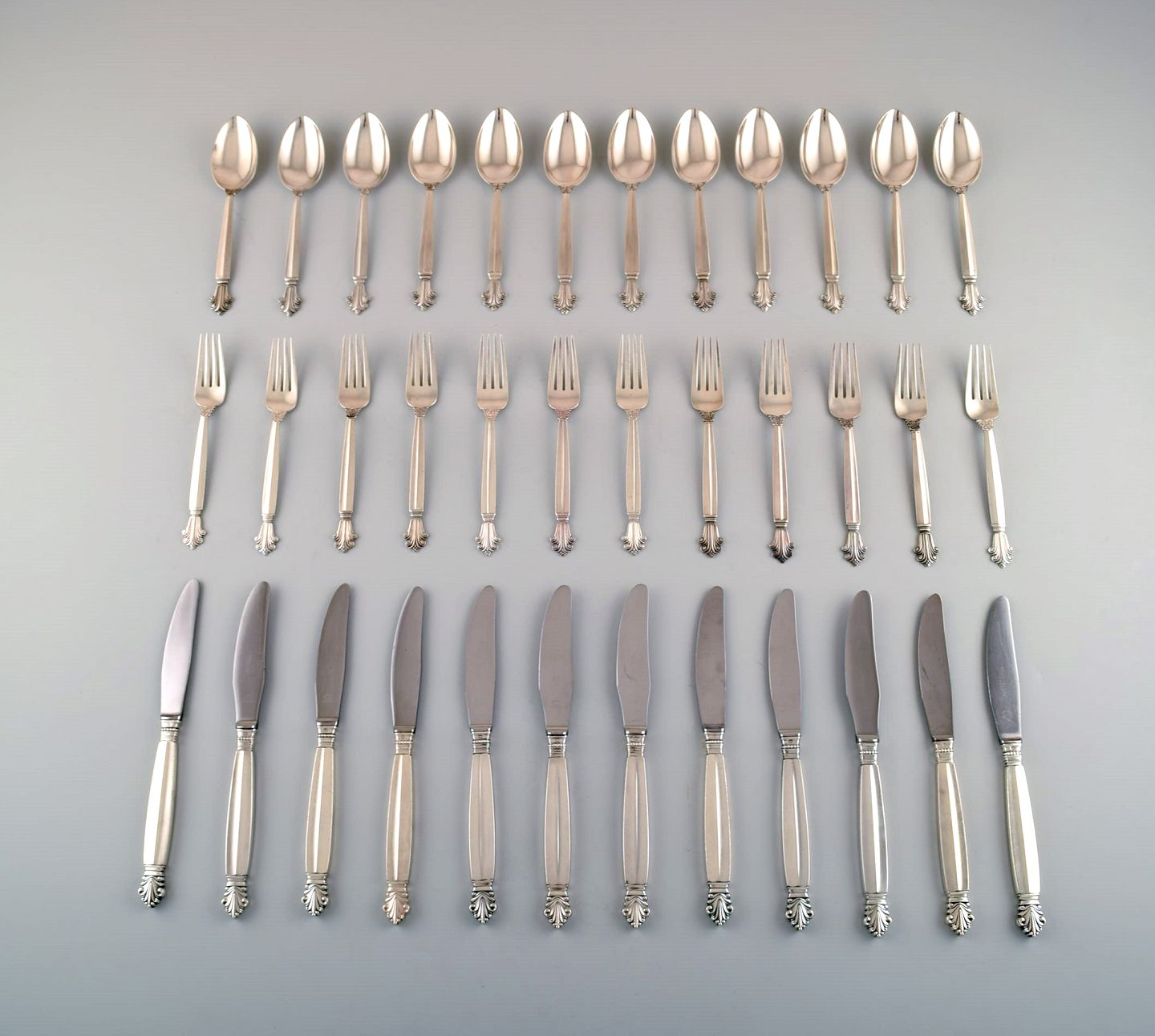 Georg Jensen Sterlingsølv 'Dronning' Bestik. Komplet middagsservice, 36 dele til 12 pers. Bestående af : 12 middagsknive, 12 suppeskeer, 12 middagsgafler. Middagskniv måler 23 cm. I perfekt stand. Stemplet.