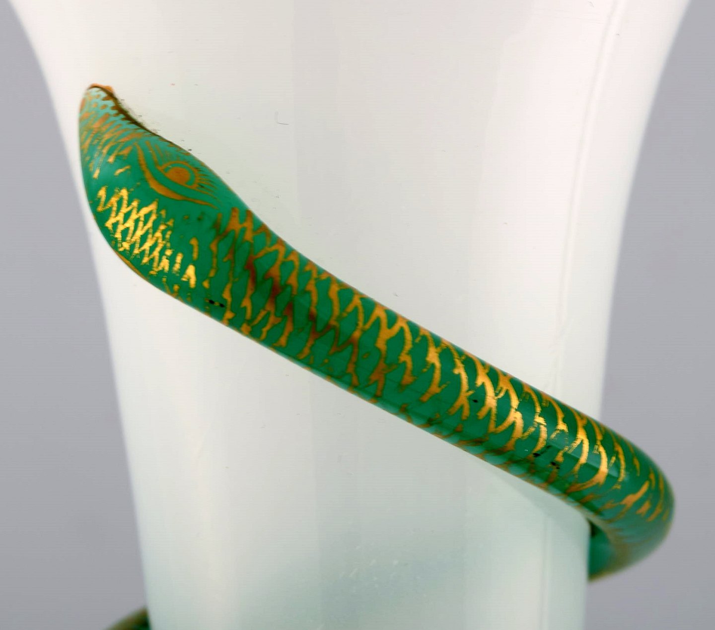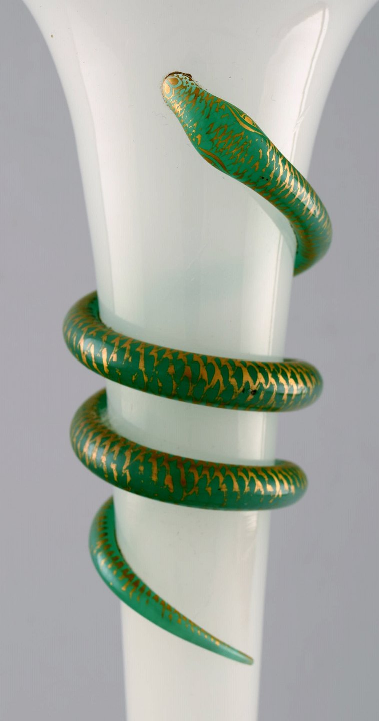 Stor Art Nouveau opaline glasvase med grøn slange. I flot stand. Måler : 39 cm. x 15 cm.