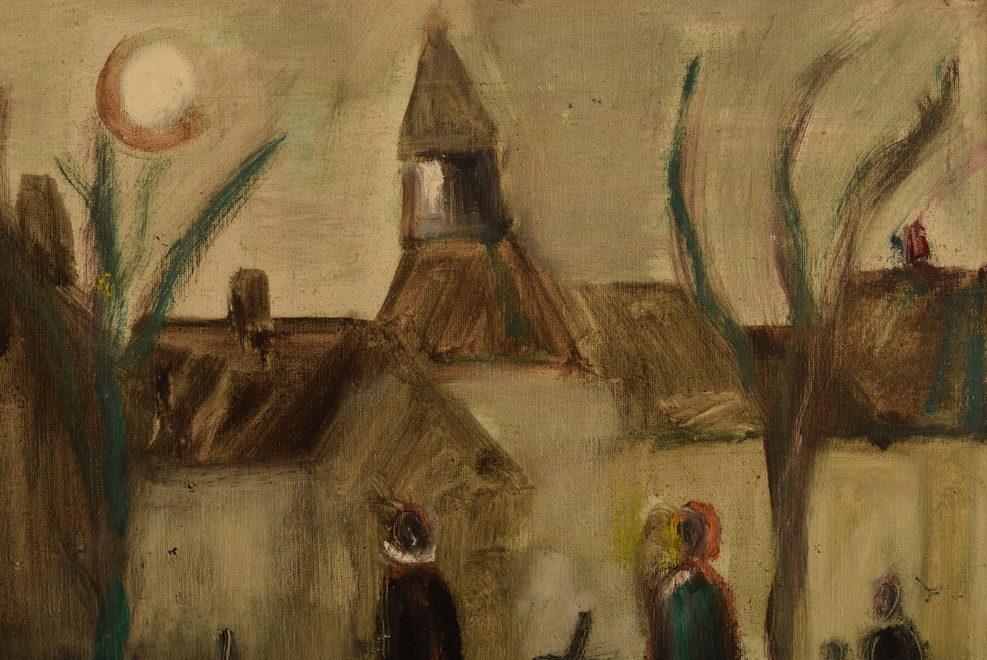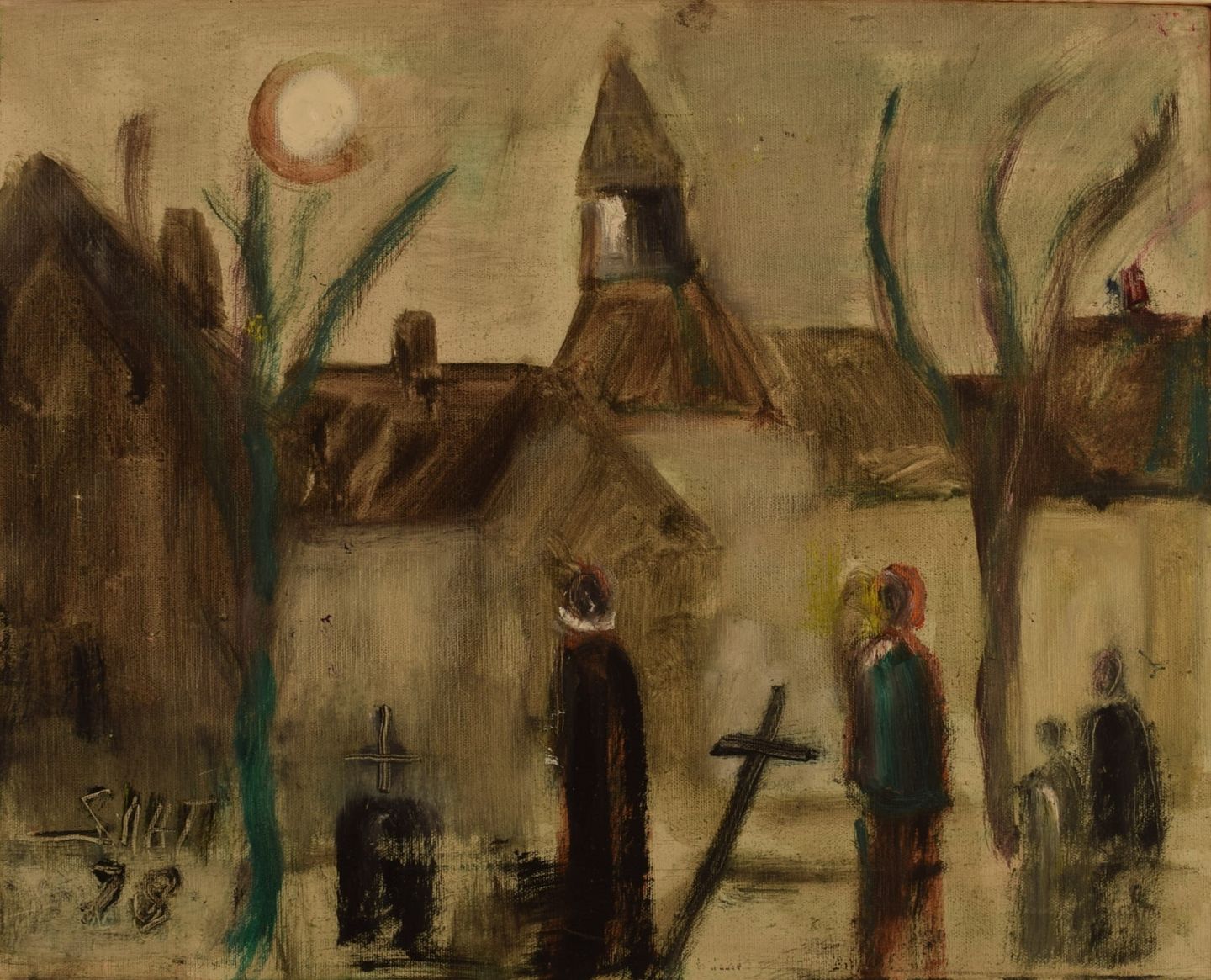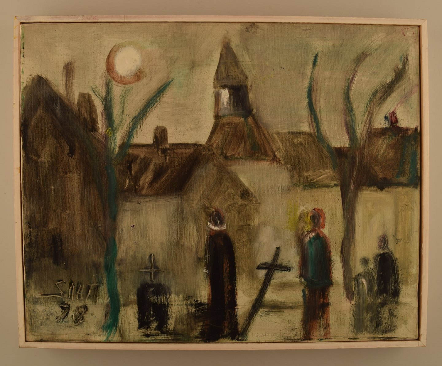 Svend Aage Tauscher, parti fra kirkegård med personer. Olie på lærred. Signeret SAAT 78. Måler (uden ramme) : 32,5 cm. × 41 cm. Rammen måler 1 cm. I perfekt stand.