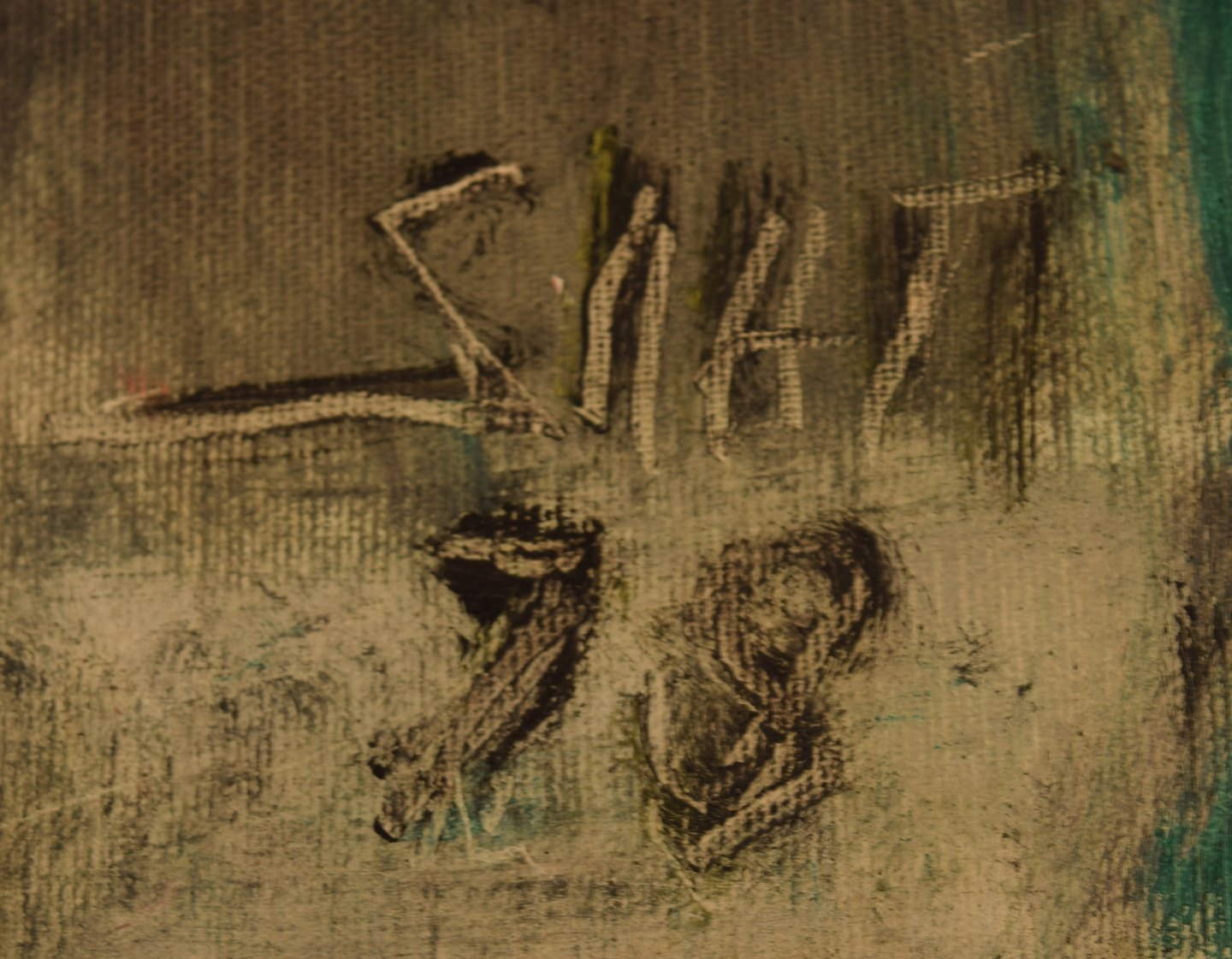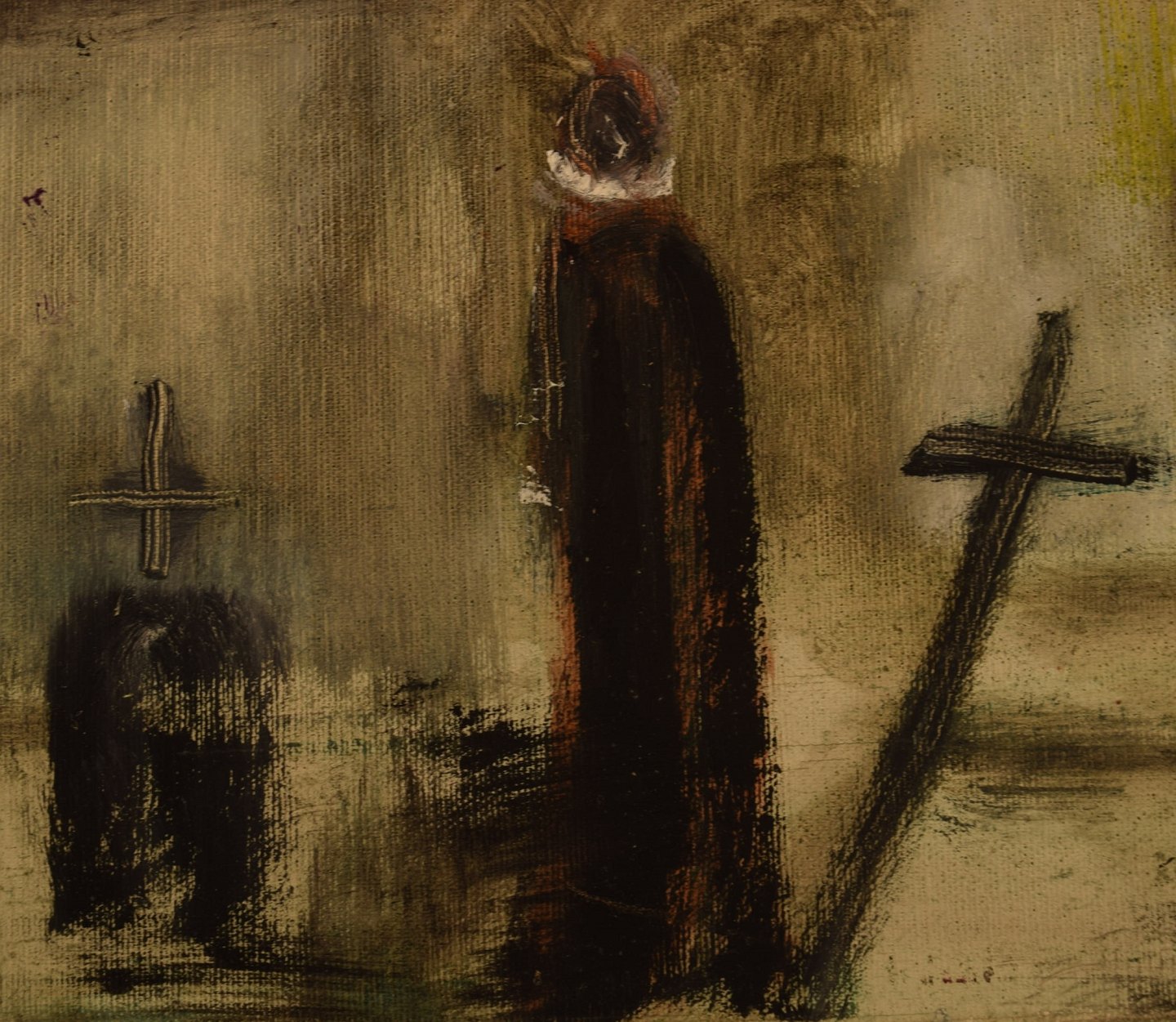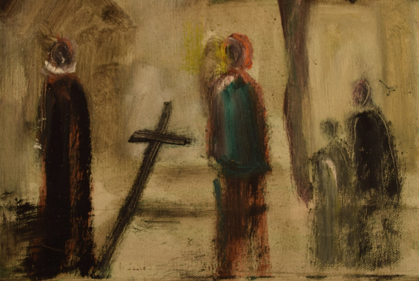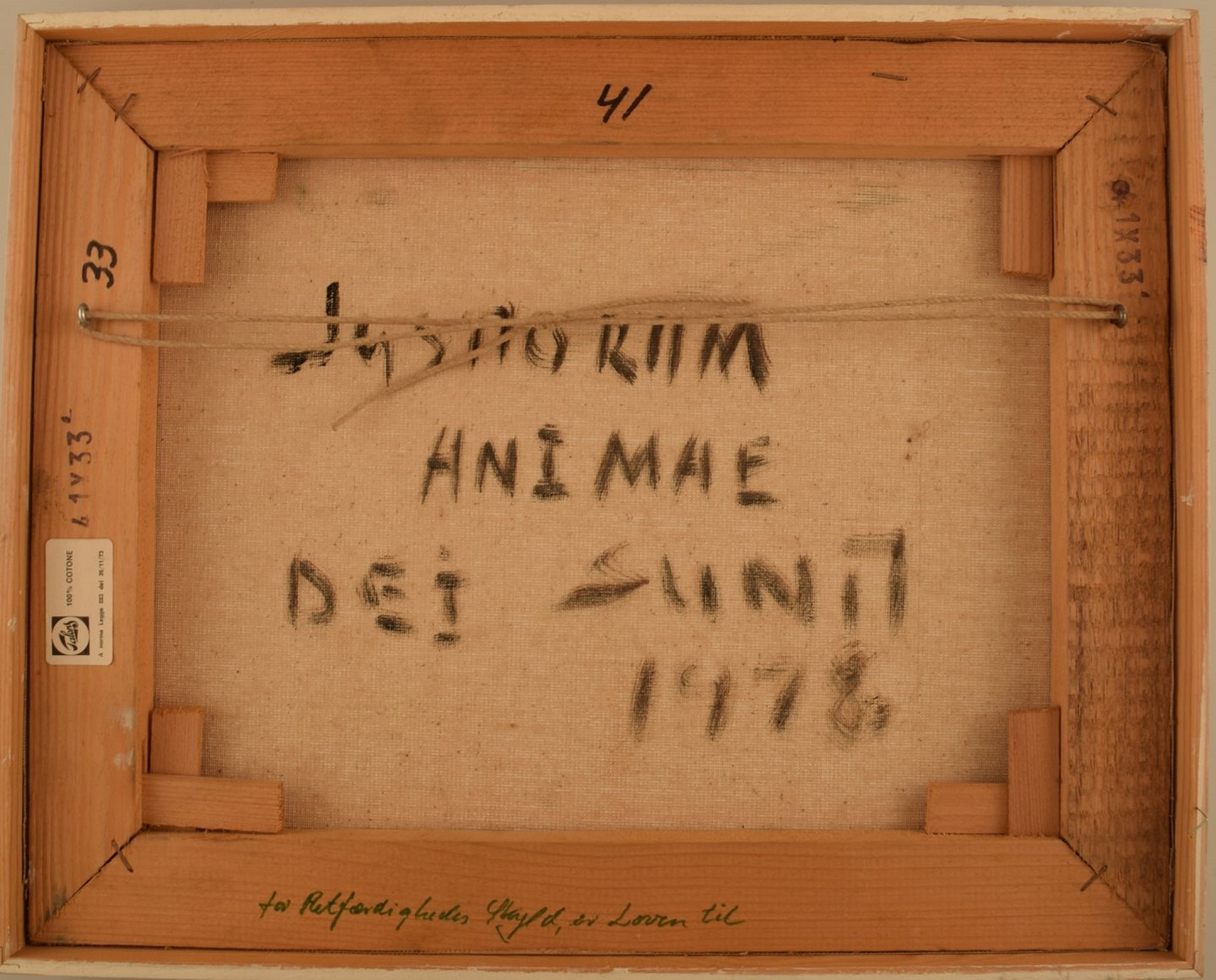 Svend Aage Tauscher, parti fra kirkegård med personer. Olie på lærred. Signeret SAAT 78. Måler (uden ramme) : 32,5 cm. × 41 cm. Rammen måler 1 cm. I perfekt stand.