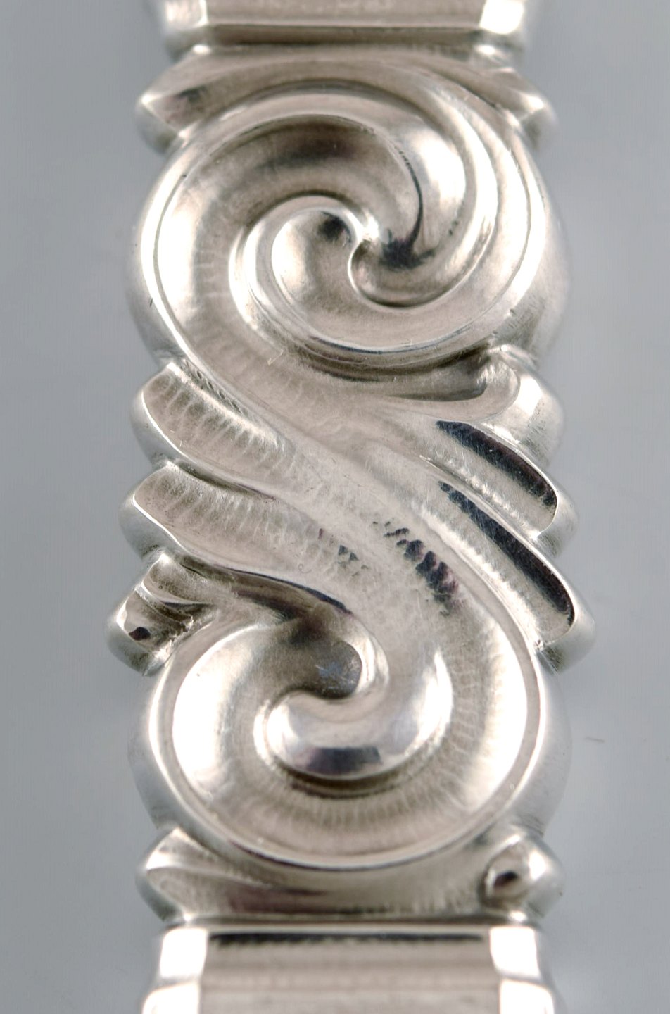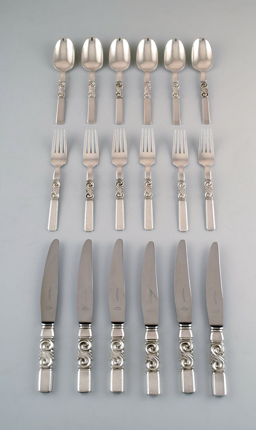 Georg Jensen. Bestik, Saga nr. 22, komplet middagsservice af hammerslået Sterlingsølv bestående af: 6 middagsknive, 6 middagsgafler, 6 spiseskeer. I perfekt stand. Stemplet. Kniv måler : 22,5 cm.