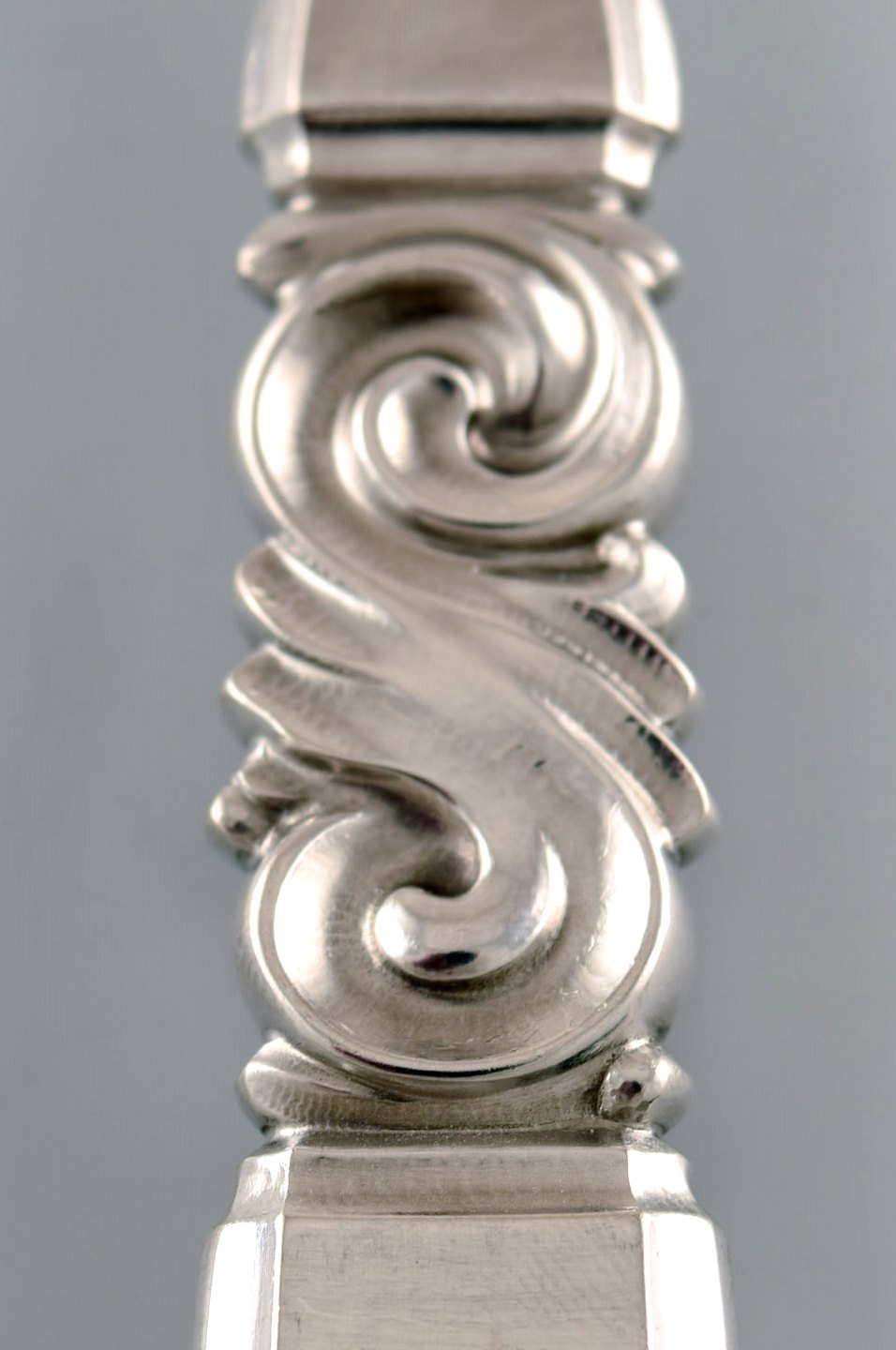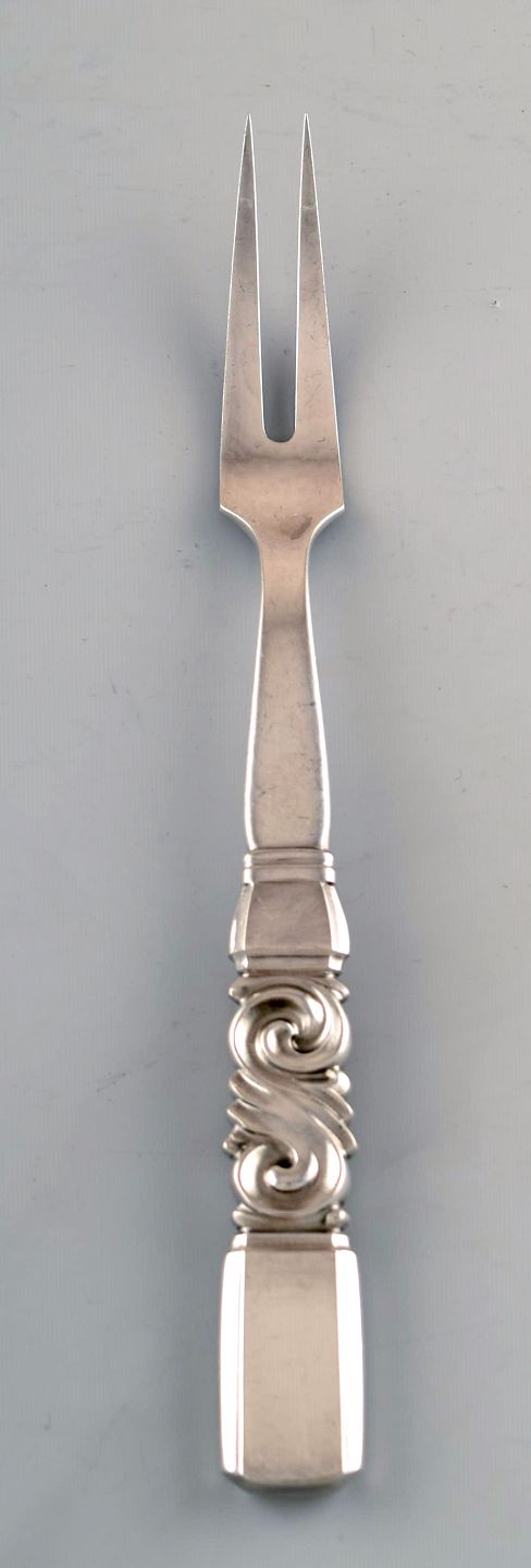 Georg Jensen. Cutlery, Scroll No. 22, hammered sterling silver roast fork. In perfect condition. Stamped. Measuring: 23.5 cm.