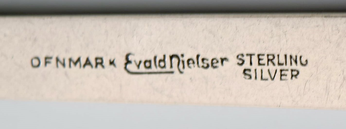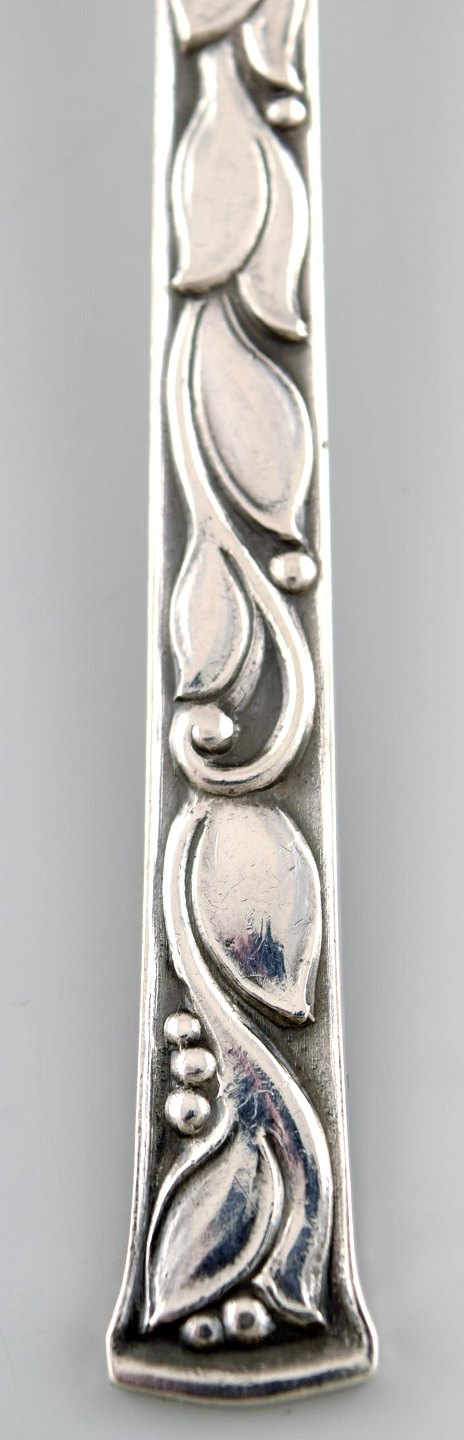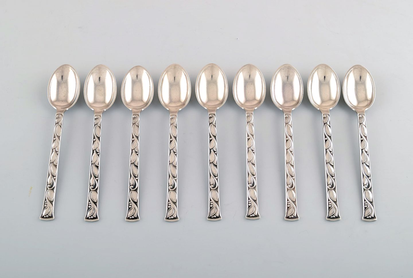 Evald Nielsen no. 30 (leaf pattern), set at 9 tea spoons in sterling silver. Measures: 14.5 cm. Stamped. 1920 s. In perfect condition.