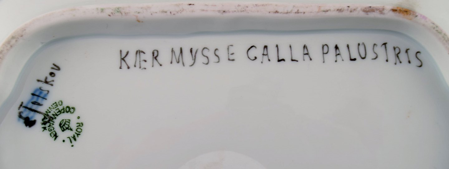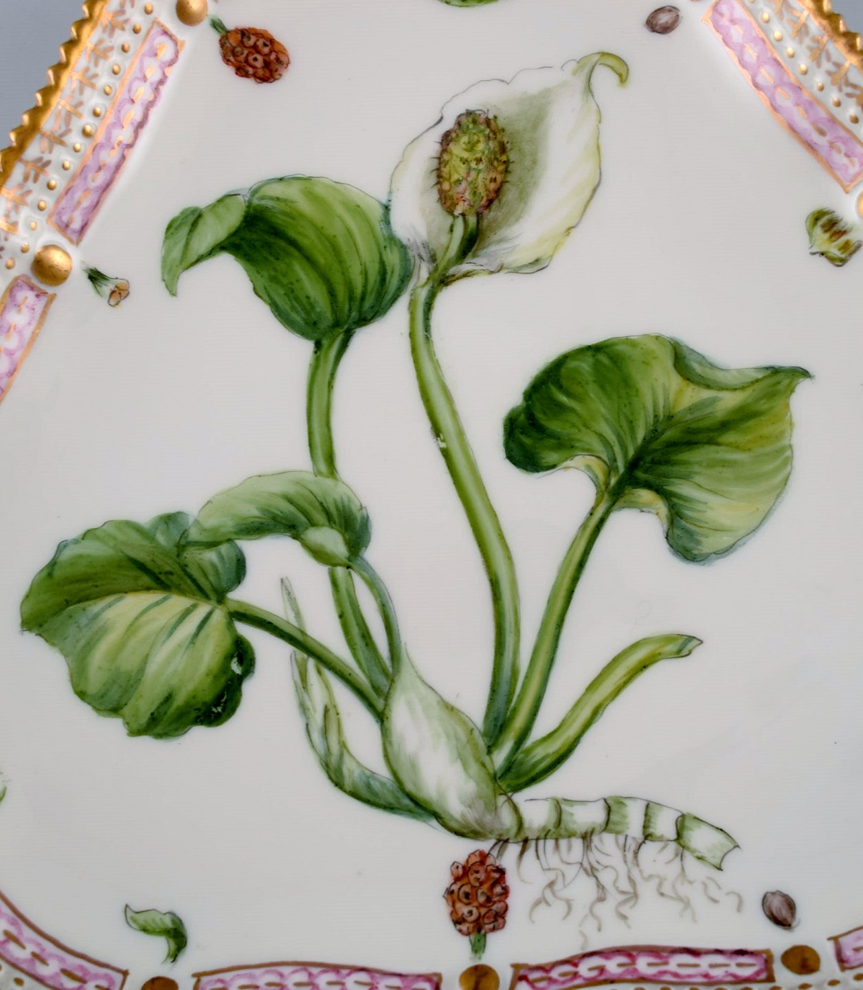 Royal Copenhagen Flora Danica tresidet fad af porcelæn, dekoreret i farver og guld med blomst.