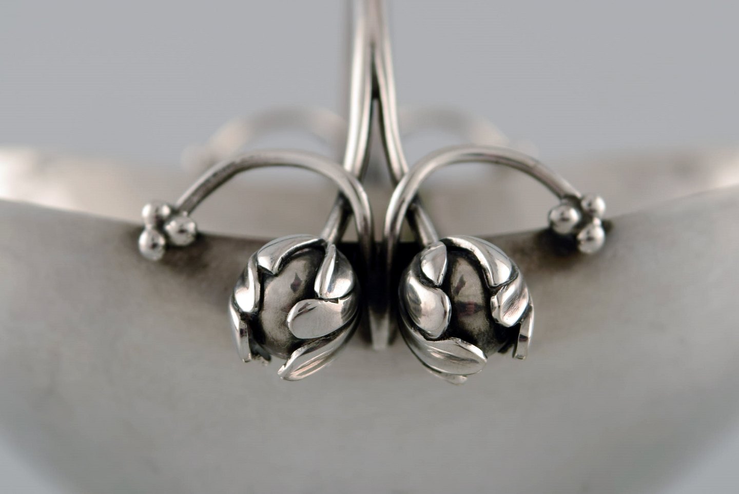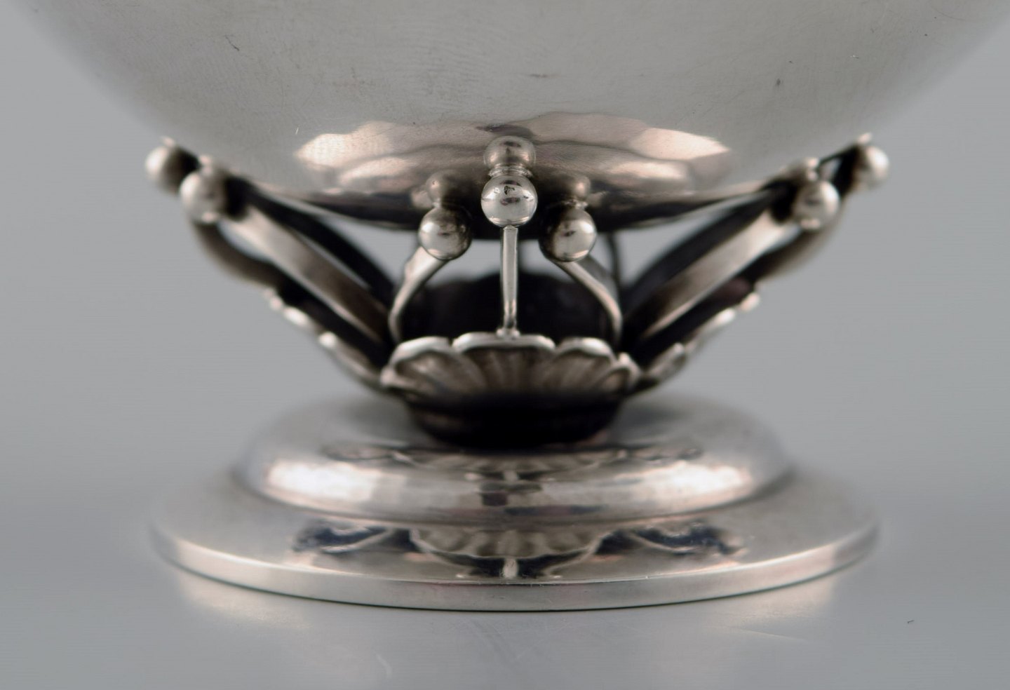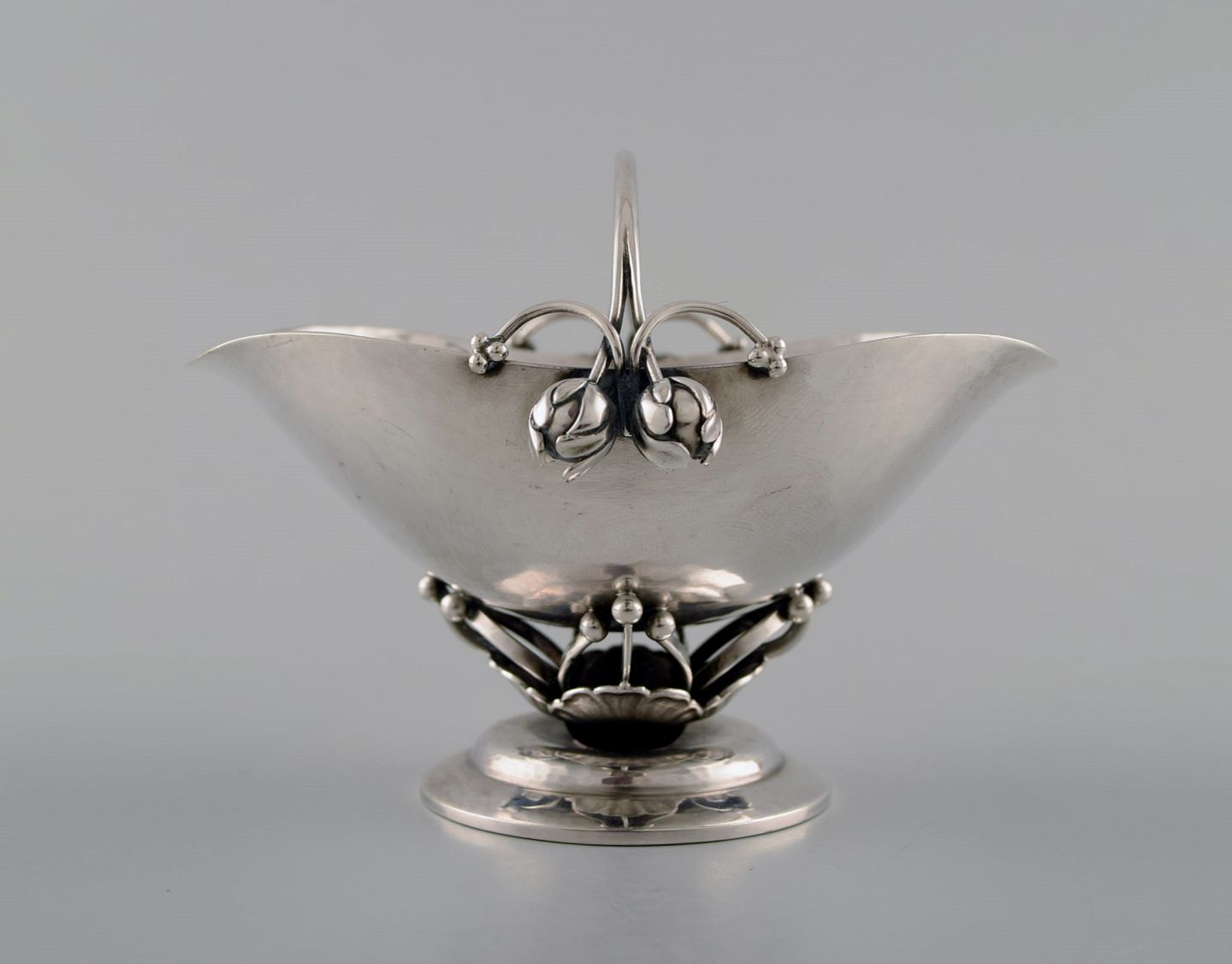 Georg Jensen: Skål af sterlingsølv, smedet med blomsterknopper og gennembrudt stamme med blade. Måler : 10 cm. x 7 cm. Dessin 235A. I flot stand. Stemplet.