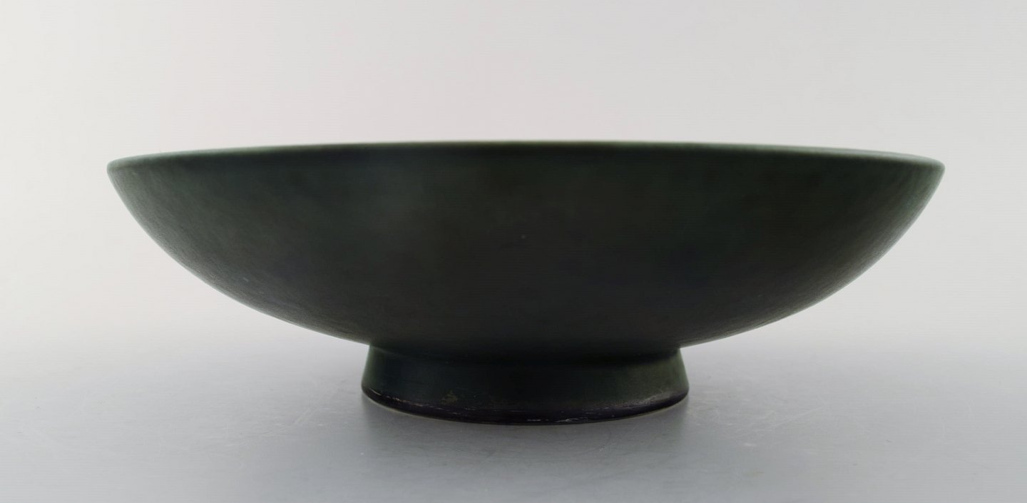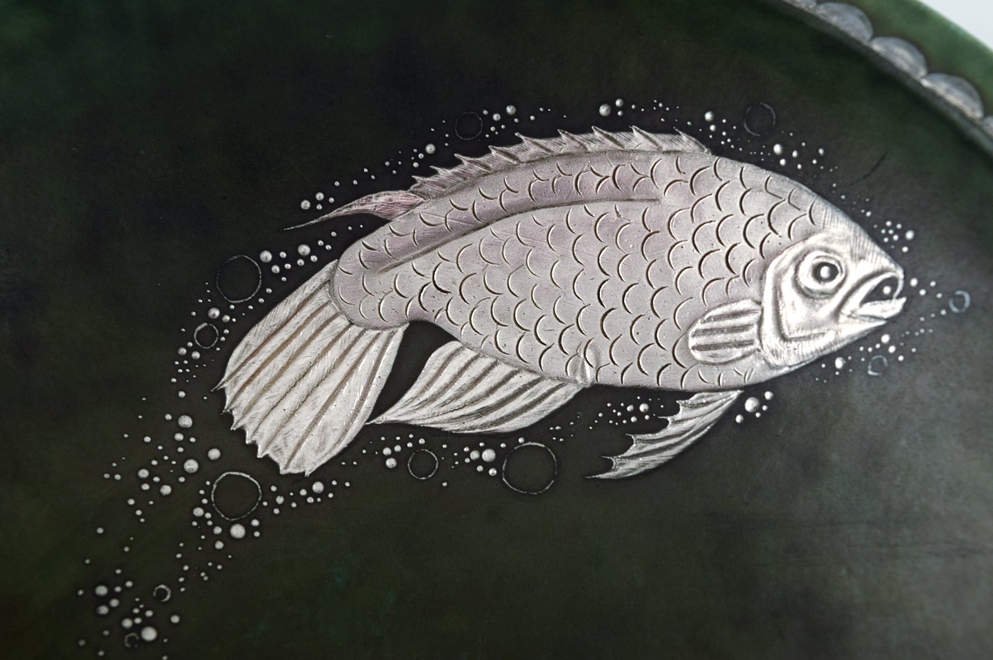 Wilhelm Kåge, Gustavsberg, Argenta Art deco skål dekoreret med fisk. Måler 18 x 5,5 cm. Stemplet Gustavsberg, Argenta. I perfekt stand.