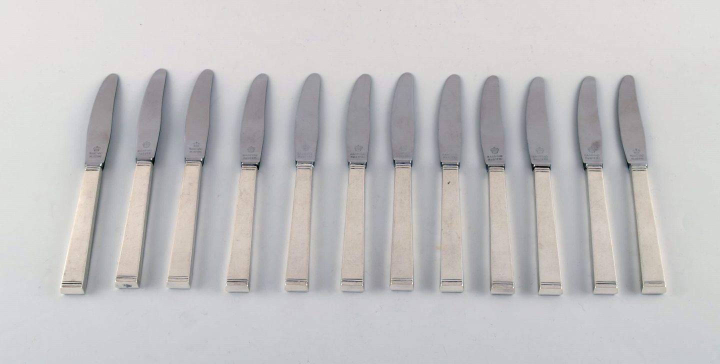 Horsens Sølvvarefabrik: "Funkis III". Sæt på 12 frugtknive Bestik af tretårnet sølv 1937. Måler 17,5 cm. Stemplet. I flot stand.