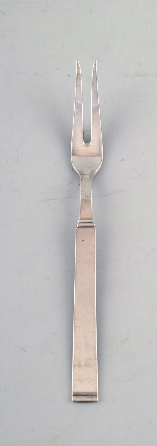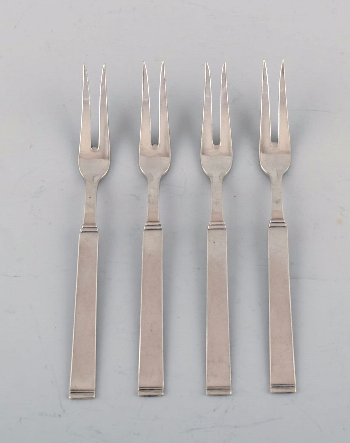 Horsens Sølvvarefabrik: "Funkis III". 4 stk. pålægsgaffel. Bestik af tretårnet sølv, 1934. Måler 16,3 cm. Stemplet. I flot stand.