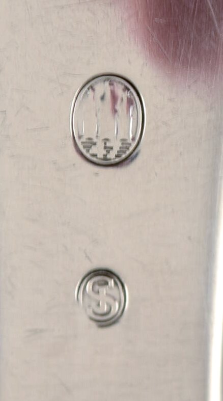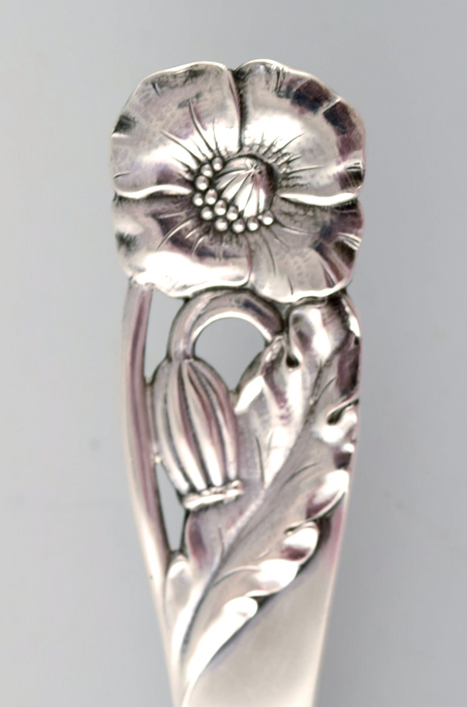 Lagkagekniv med blomst i relief. Bestik af dansk tretårnet sølv. 1947. Måler 27 cm. Stemplet. I flot stand.