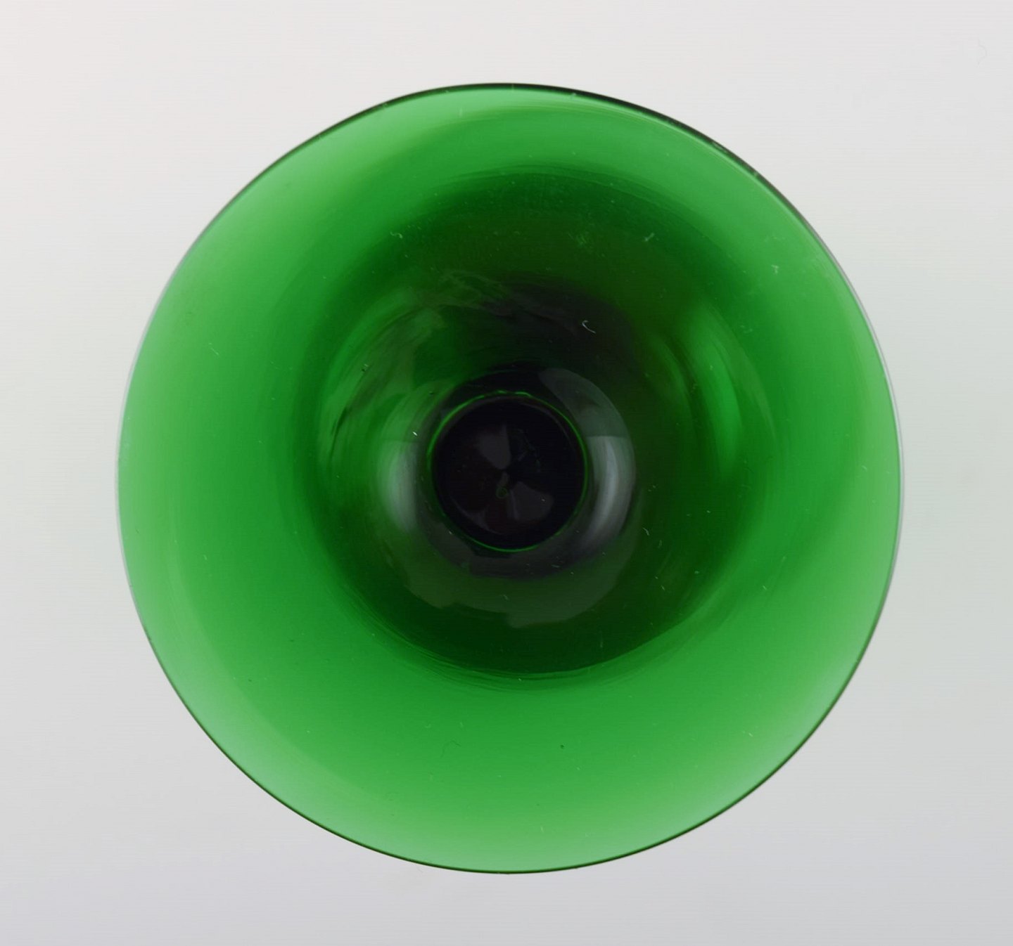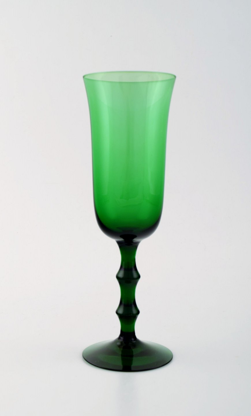 SIMON GATE for Orrefors, Et sæt på 12 grønne champagneglas i kunstglas.. Designer: Simon Gate Serie: Salut Producer: Orrefors Land: Sverige Designet: 1923 Størrelse: Højde 19 cm, diameter 6 cm.