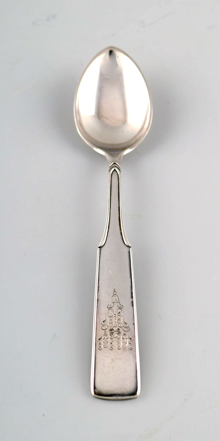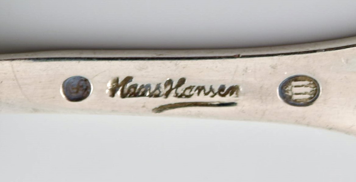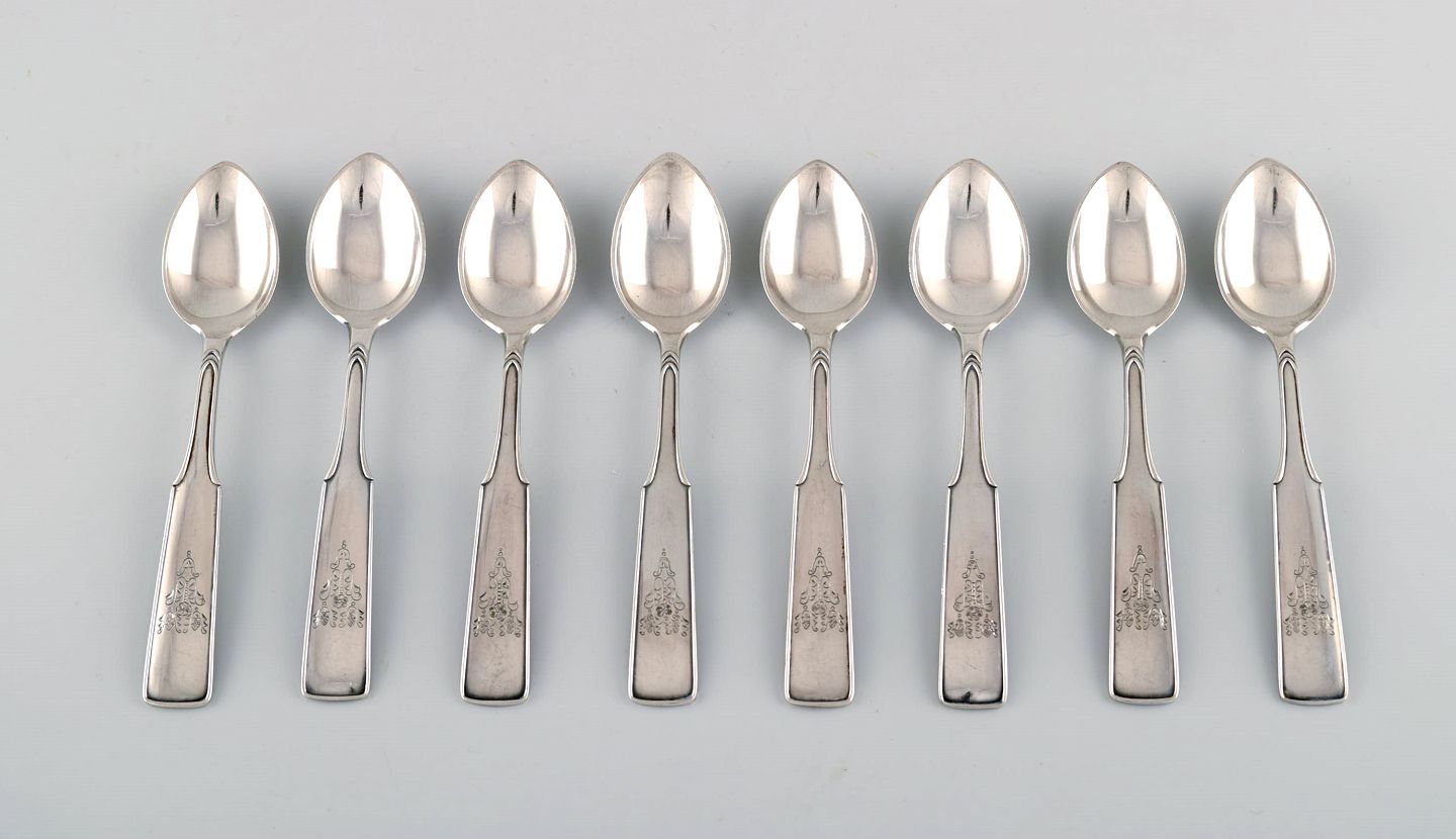 Hans Hansen sølvtøj Arvesølv nr. 2. Sæt på 8 stk kaffeskeer i 3-tårnet sølv. 1937 Måler : 12 cm. Perfekt stand. Stemplet.