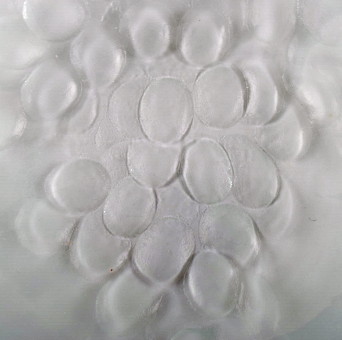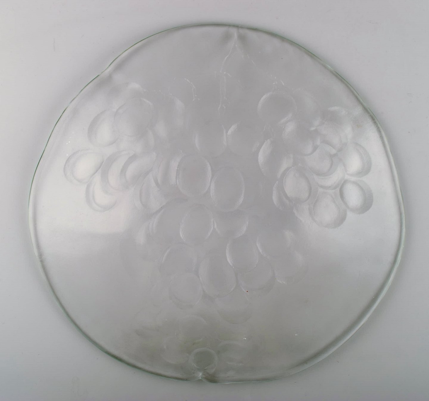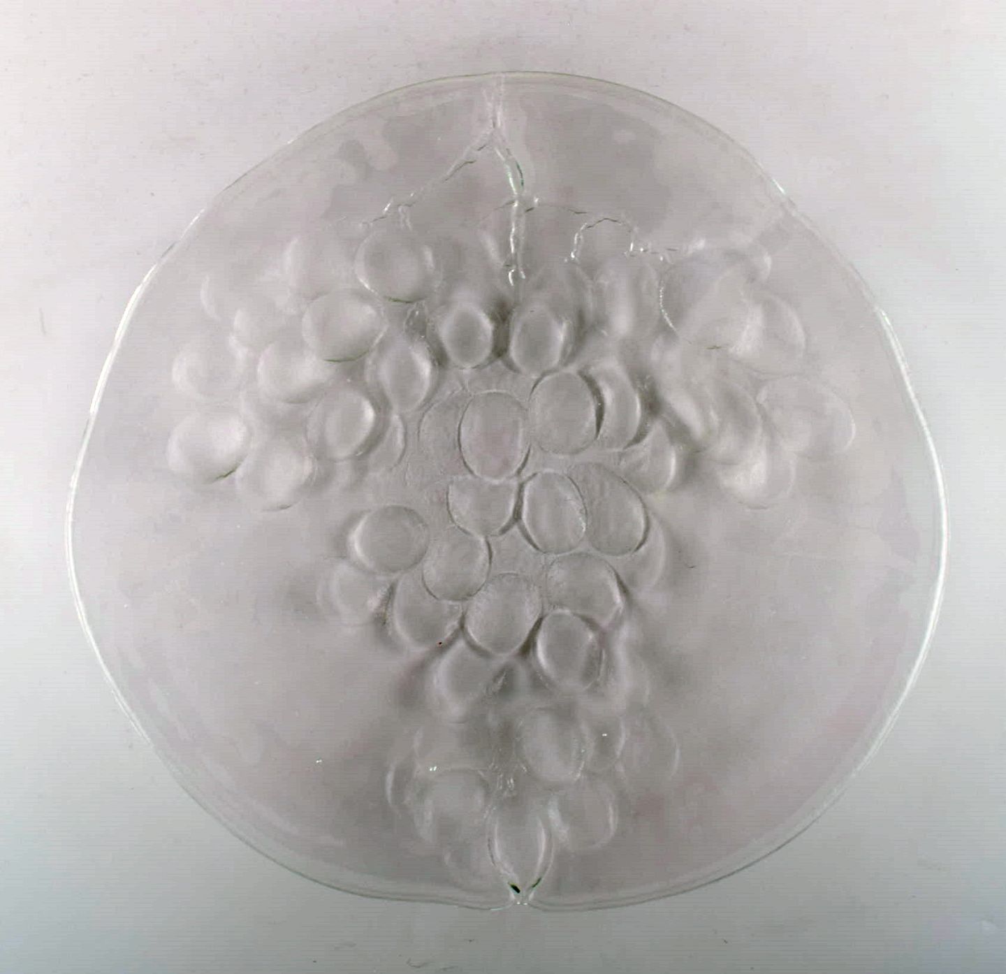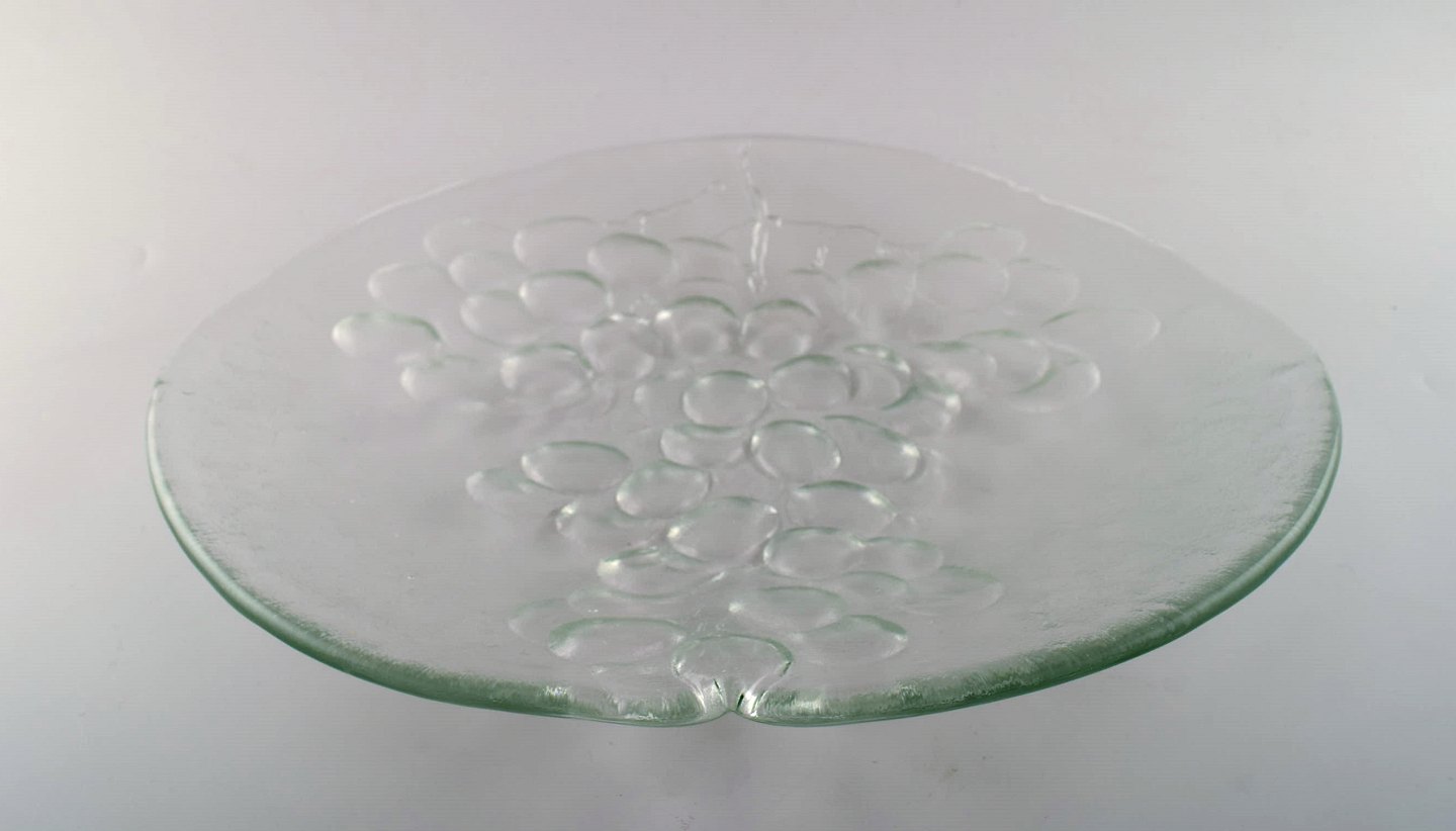 Skandinavisk kunstglas. Stort mundblæst fad udsmykket med drueklase. 1960erne. I flot stand. Måler: 34,4 cm x 5 cm.