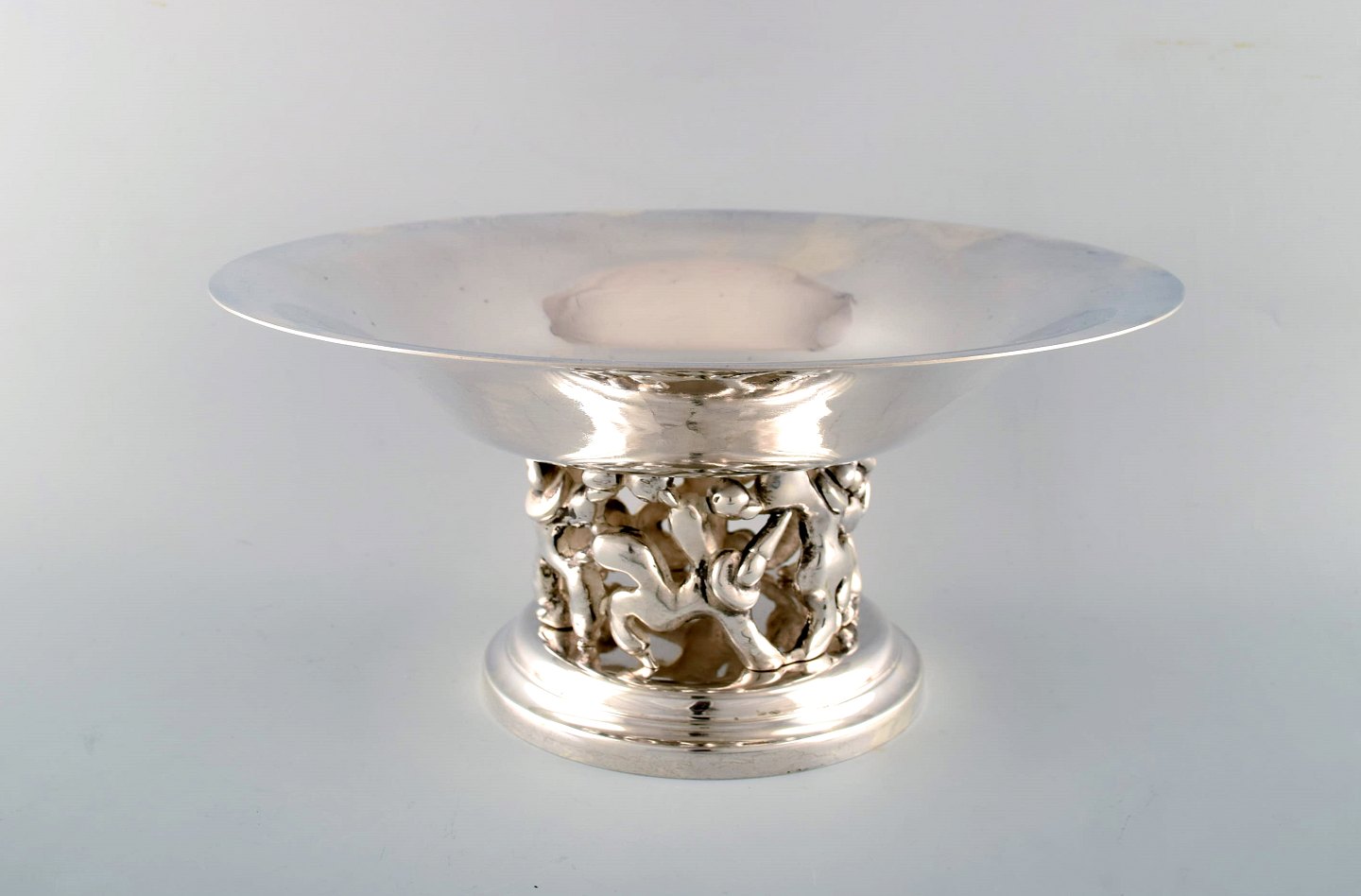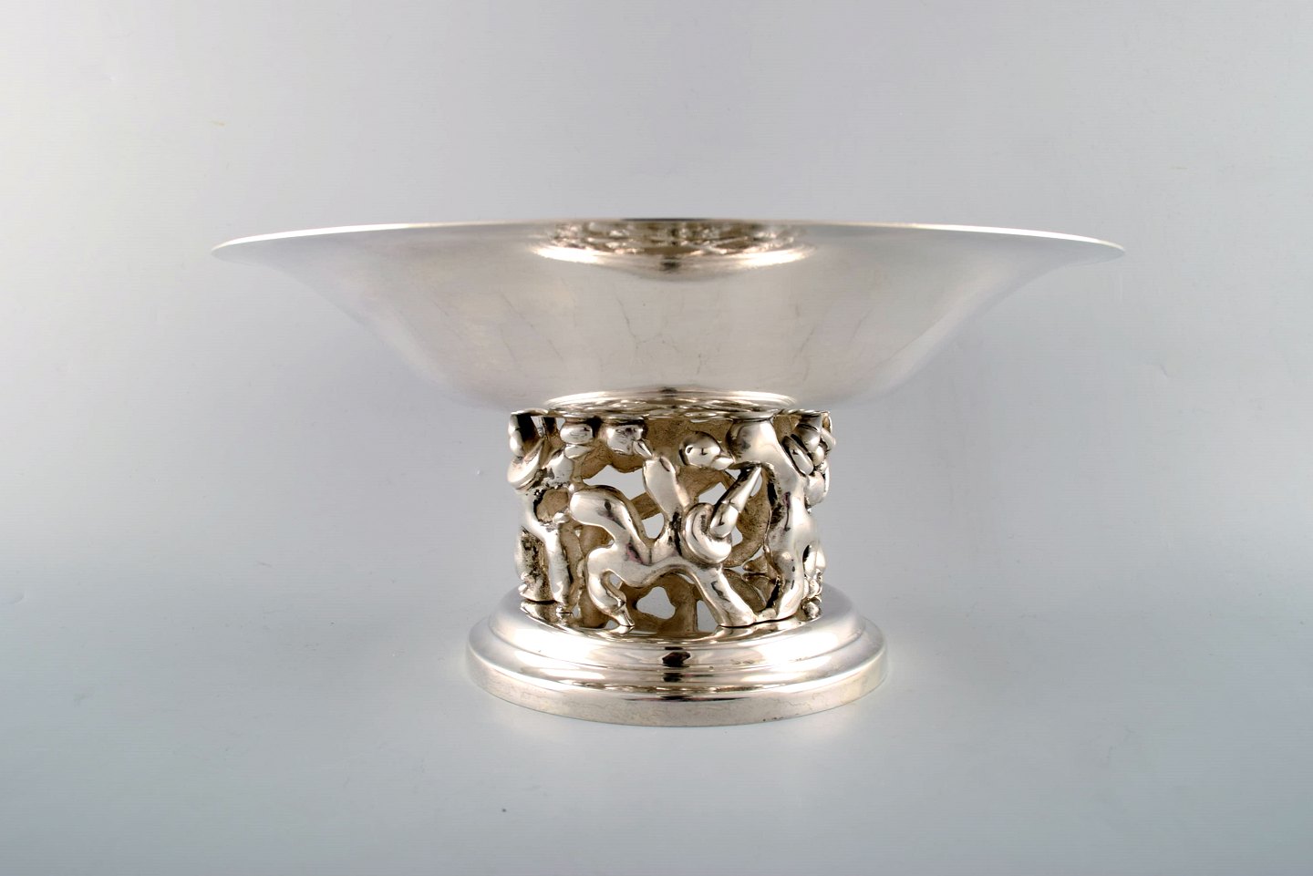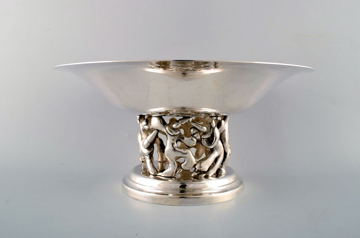 Jean Boggio for Roux-Marquiand, France. Large modernist compote in plated silver. Base with motive of dancing circus artists. In very good condition. Stamped. Measures: 30.5 cm x 14.5 cm.