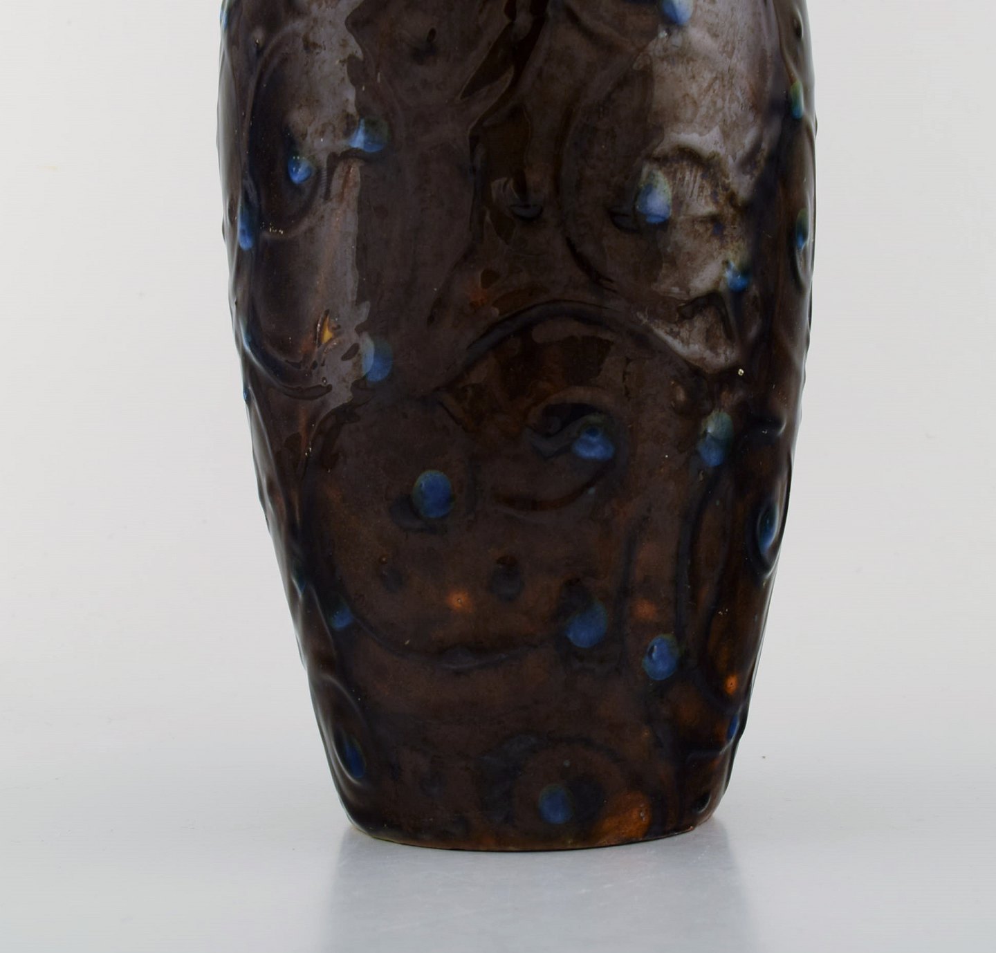 Kähler, HAK, glaseret stentøjsvase i moderne design. 1930/40´erne. Kohornsteknik. Smuk mørkeblå/brun glasur. Stemplet. Måler : 30,5 cm x 15 cm. I perfekt stand.