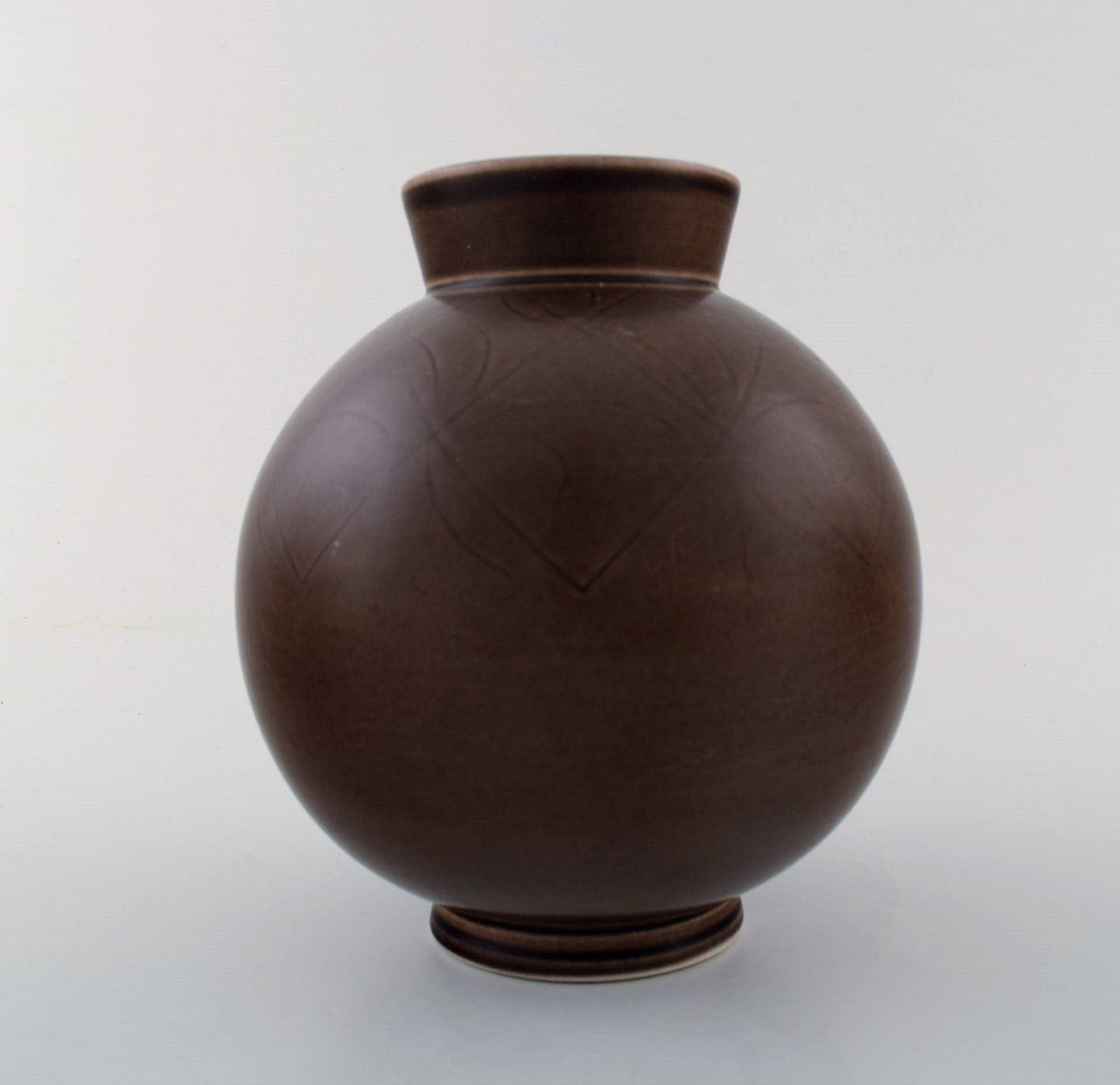 Aluminia, Copenhagen, art deco faience vase, brown glaze. Ca. 1940 s. Measures 18 cm x 16 cm. In perfect condition. 1st. factory quality. Stamped.