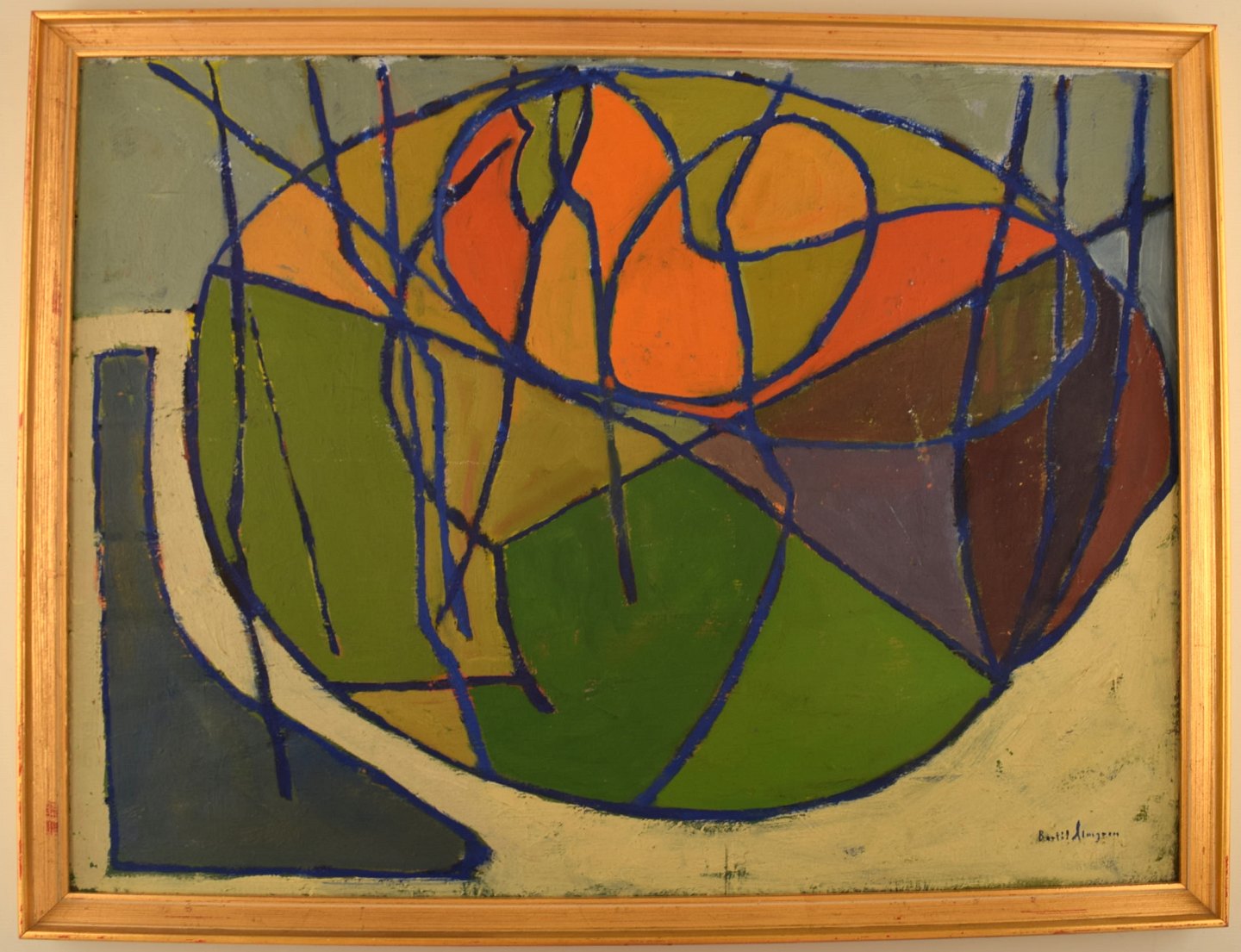 Bertil Almgren. Svensk kunstner. Olie på plade. Stilleben. Malet i modernistisk stil. I perfekt stand. Pladen måler: 61 cm x 46 cm. Rammen måler: 2,5 cm. Signeret. 1960erne.