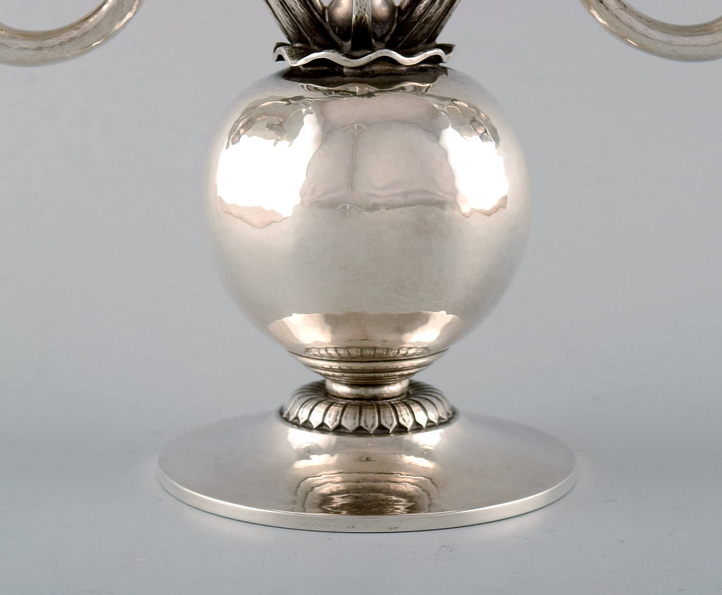 Georg Jensen. Et par Kandelabre af hammerslået sterlingsølv med to svungne lysarme, prydet med stiliseret ornamentik og drueklaser.