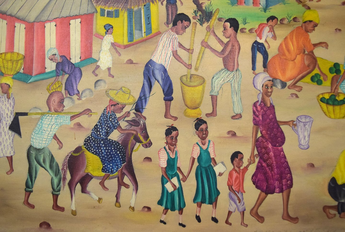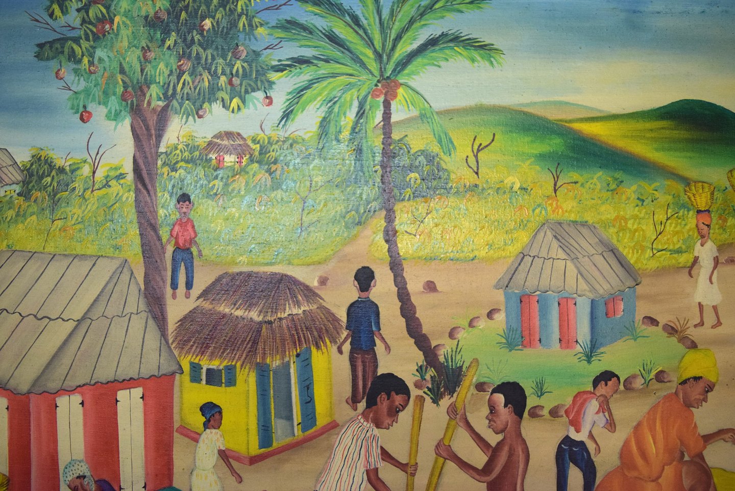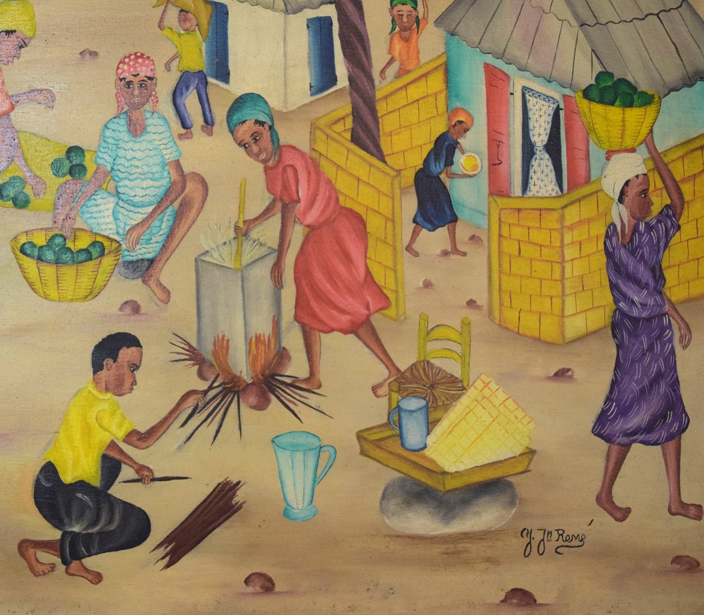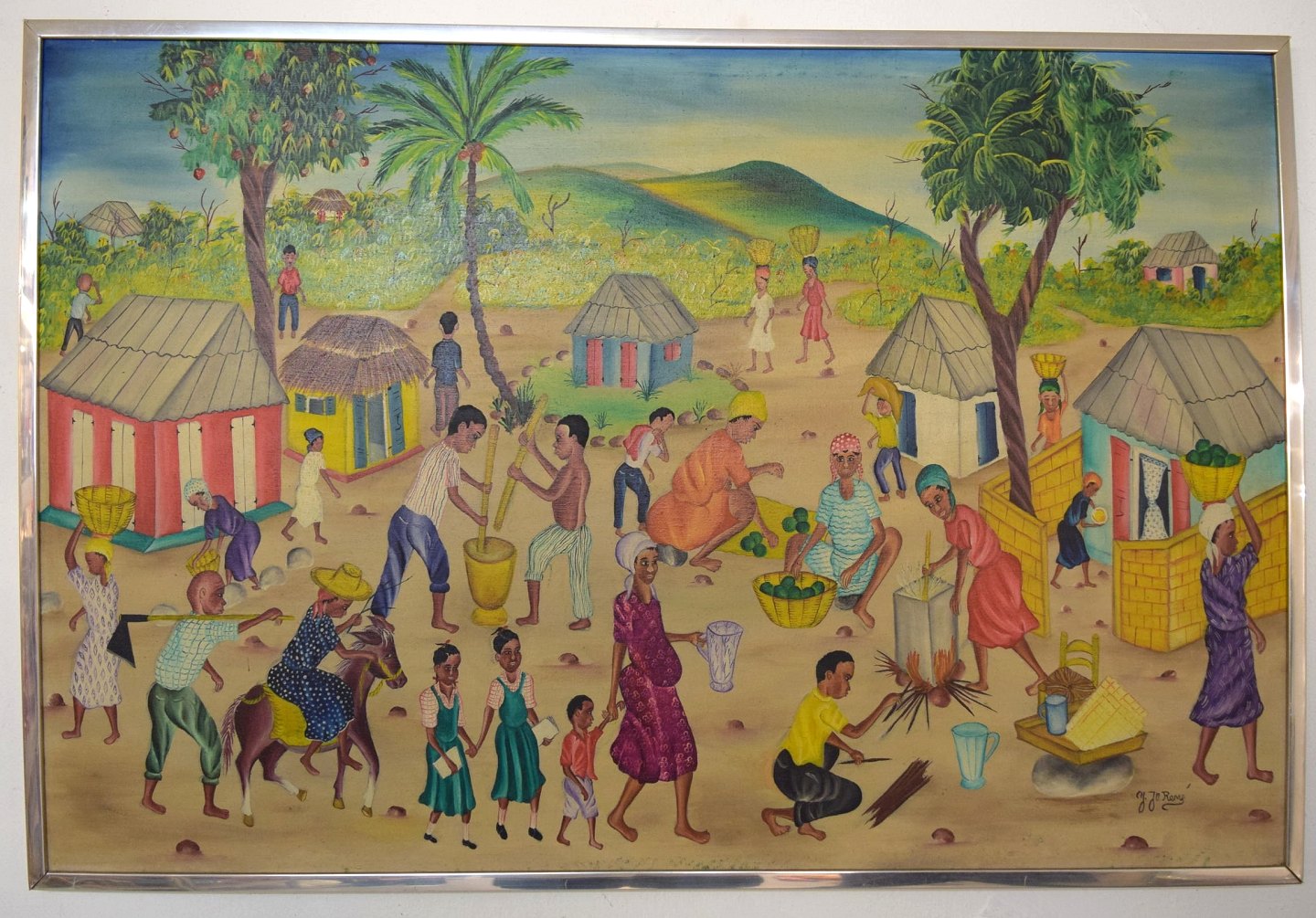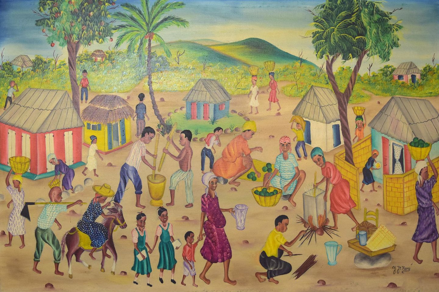 Y. Jn. René, haitiansk kunstner. Naivistisk skole. Olie på lærred. 1970'erne. Landsbystemning. Signeret. I flot stand. Lærredet måler: 91 x 62 cm. Rammen måler: 1,5 cm.