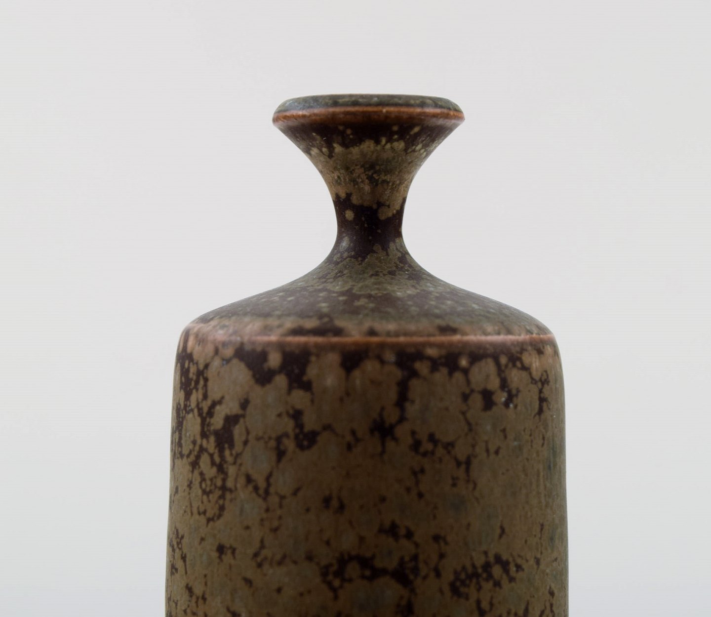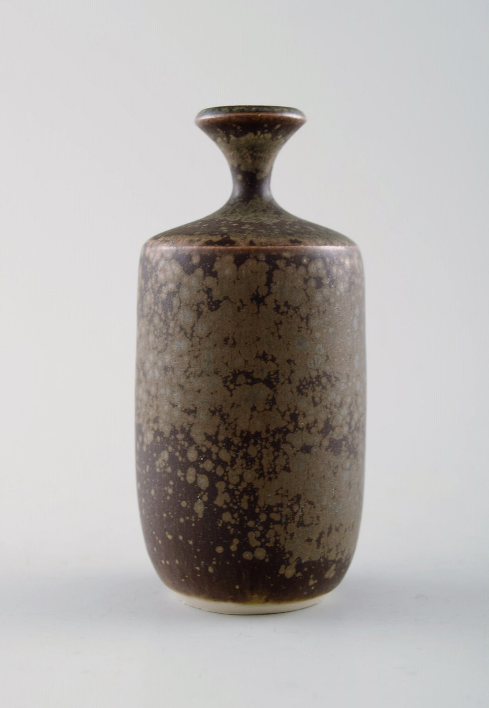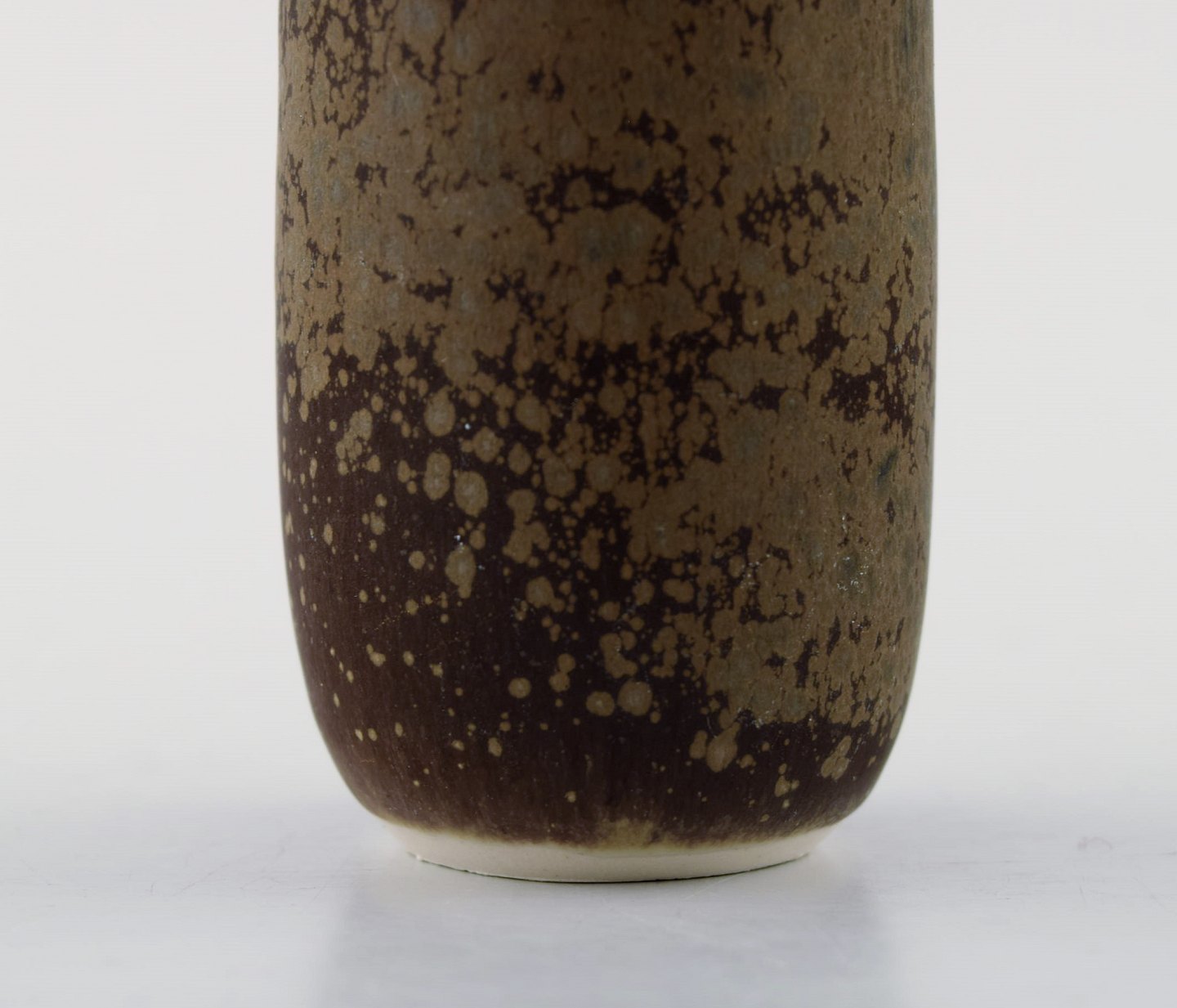 Rolf Palm, Mölle, unika keramikvase, spættet glasur i brune nuancer. Svensk design. 1970'erne. Måler : 9,5 x 4,5 cm. Stemplet. I perfekt stand.