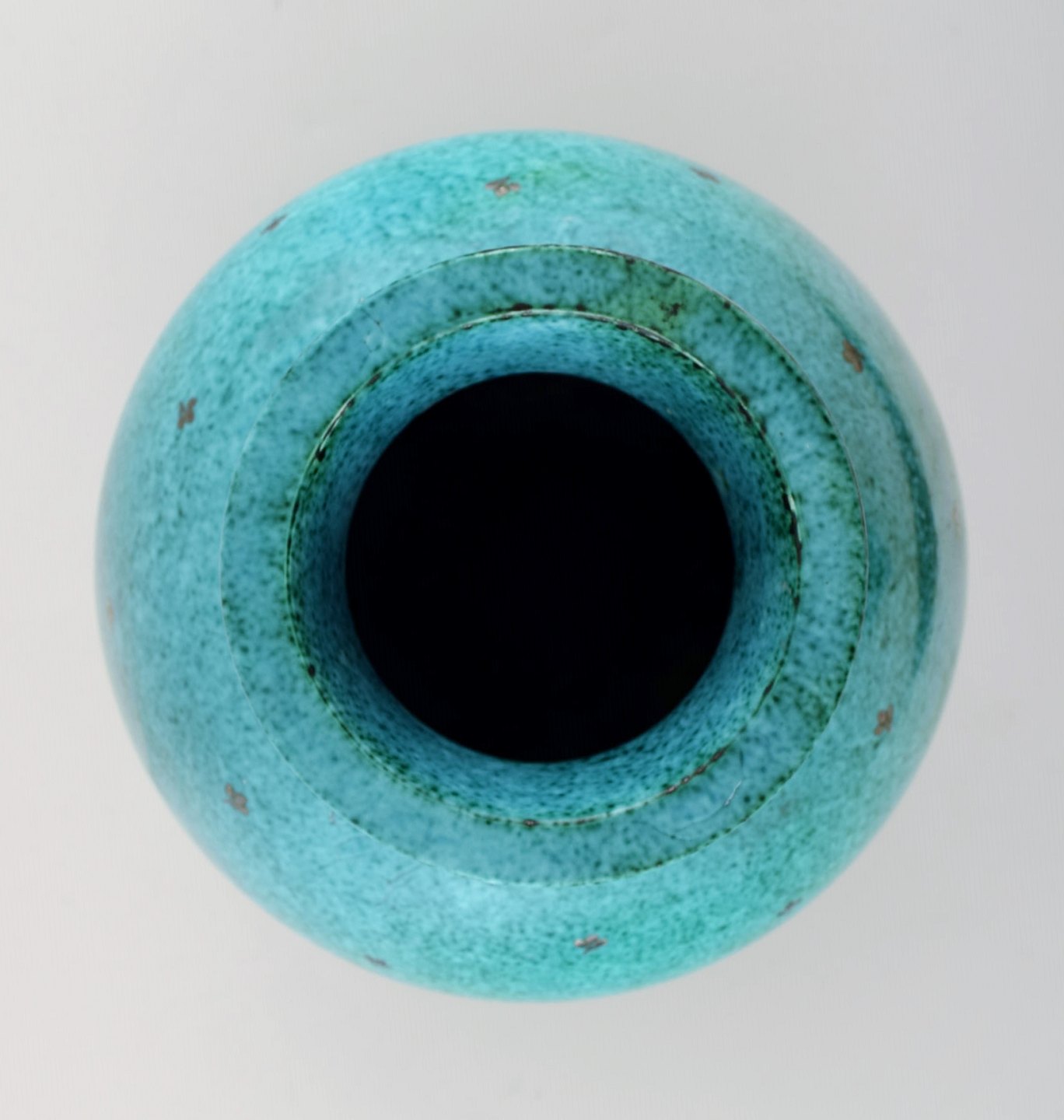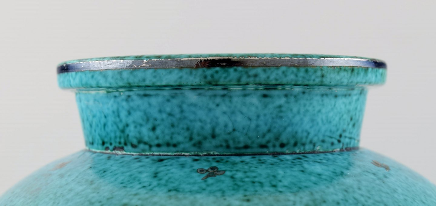 Wilhelm Kåge, Gustavsberg, stor Argenta art deco kuglerund keramikvase dekoreret med blade i sølvindlæg.