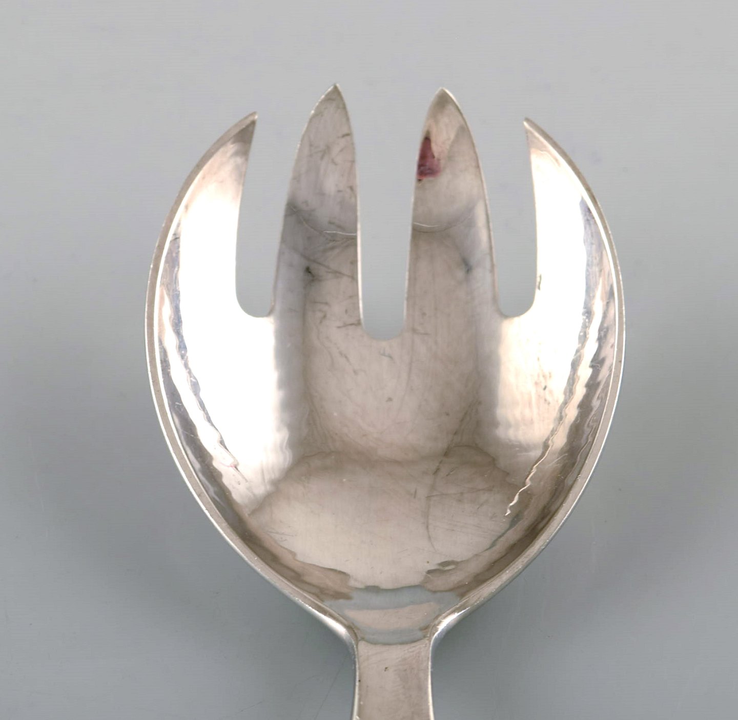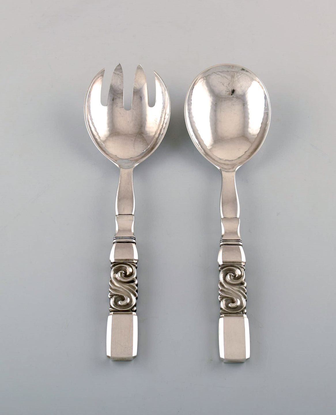 Georg Jensen. Bestik, Saga nr. 22, hammerslået Sterlingsølv salatsæt i helsølv.