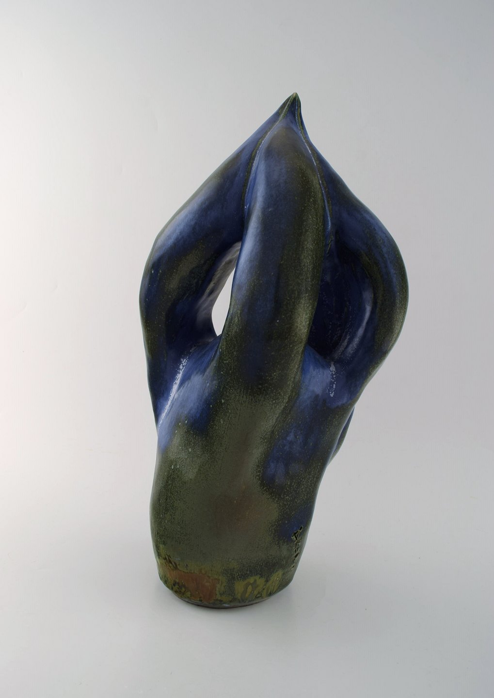 Åke Larsson. Svensk keramiker. Stor organisk unika skulptur i glaseret stentøj. Smuk glansfuld glasur i blå og grønne nuancer. 1960'erne. I flot stand. Stemplet. Måler: 43 x 25,5 cm.
