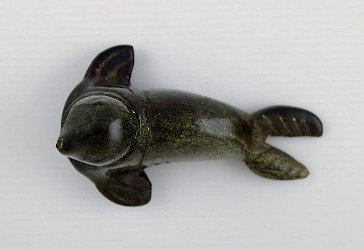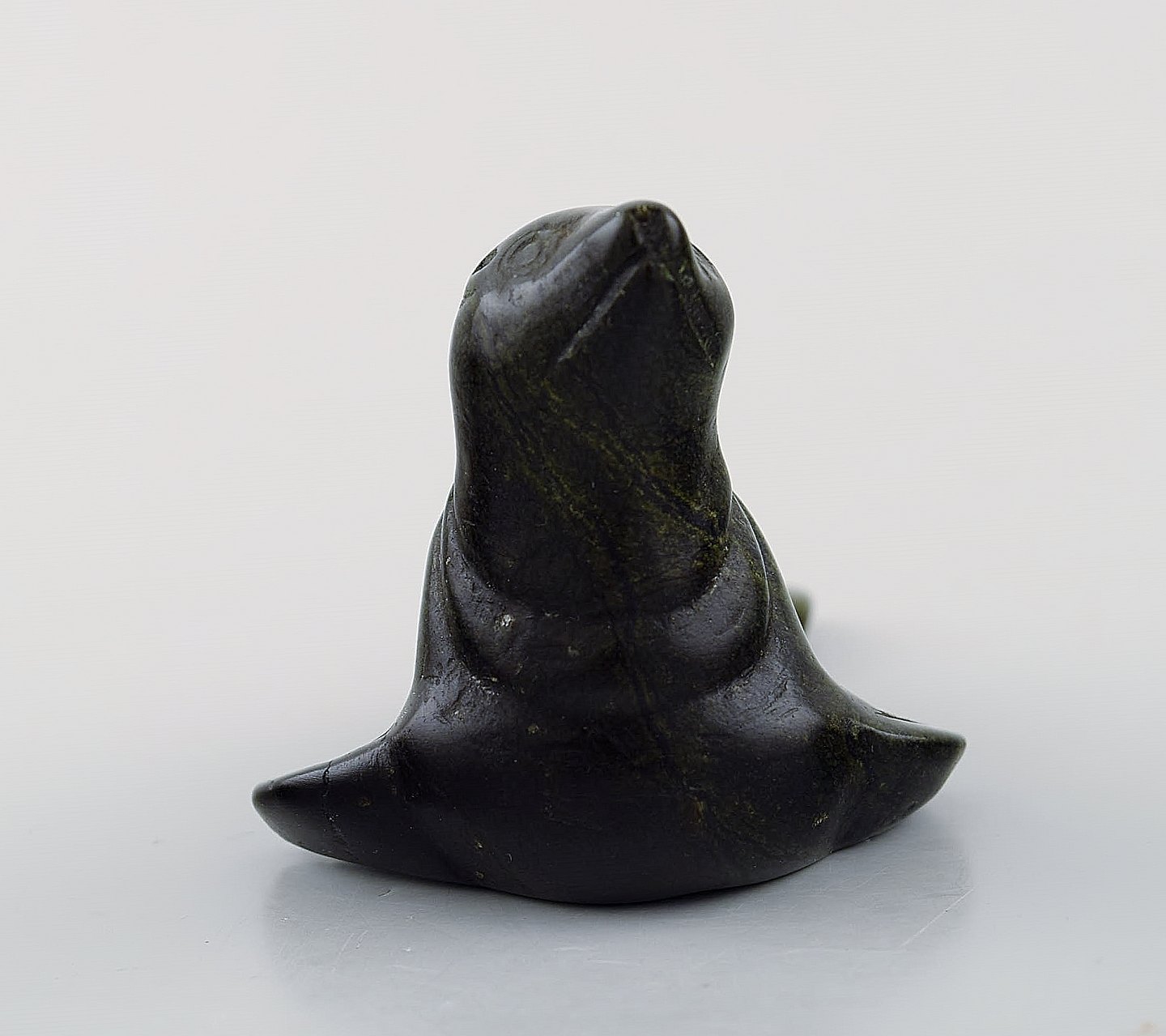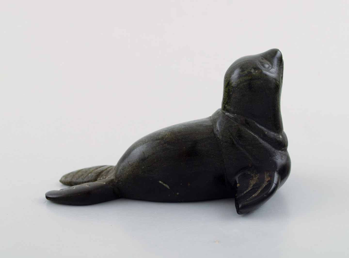 Grønlandica, figur af sæl i udskåret fedtsten. 1950/60´erne. Måler: 10 x 5,5 cm. I god stand, brugspræg.