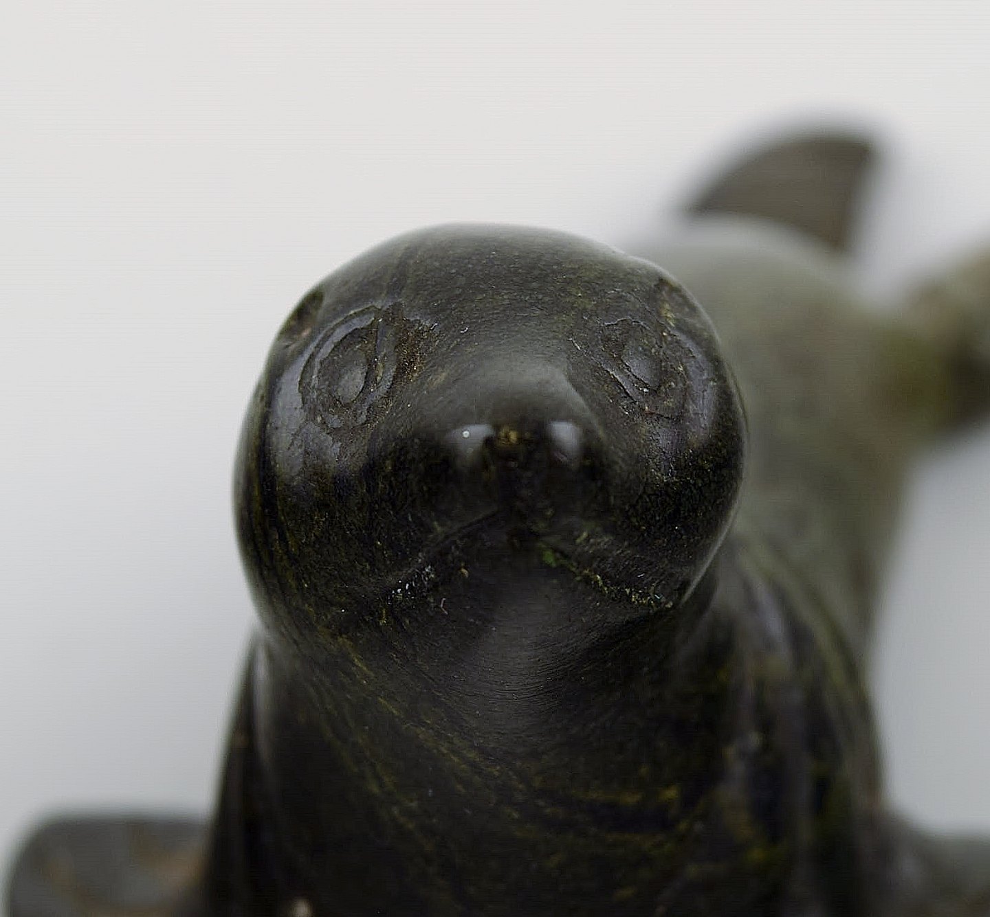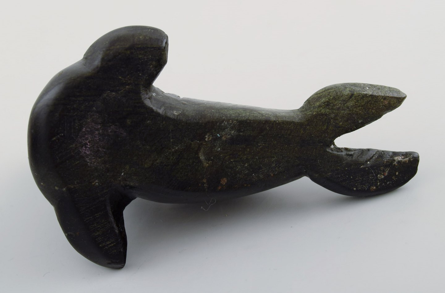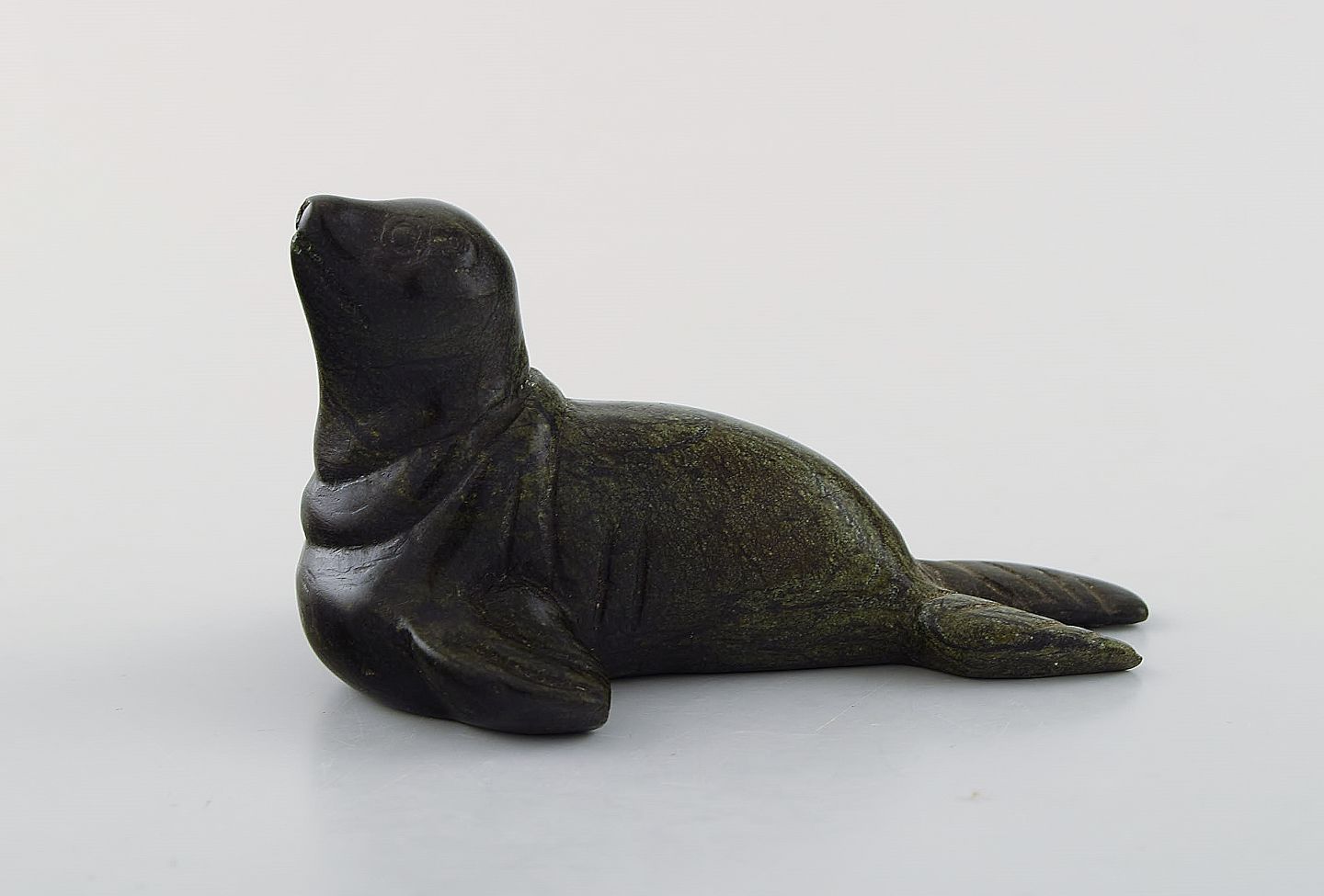 Grønlandica, figur af sæl i udskåret fedtsten. 1950/60´erne. Måler: 10 x 5,5 cm. I god stand, brugspræg.